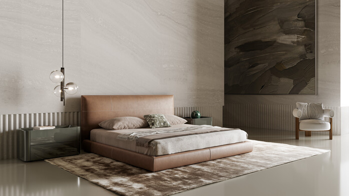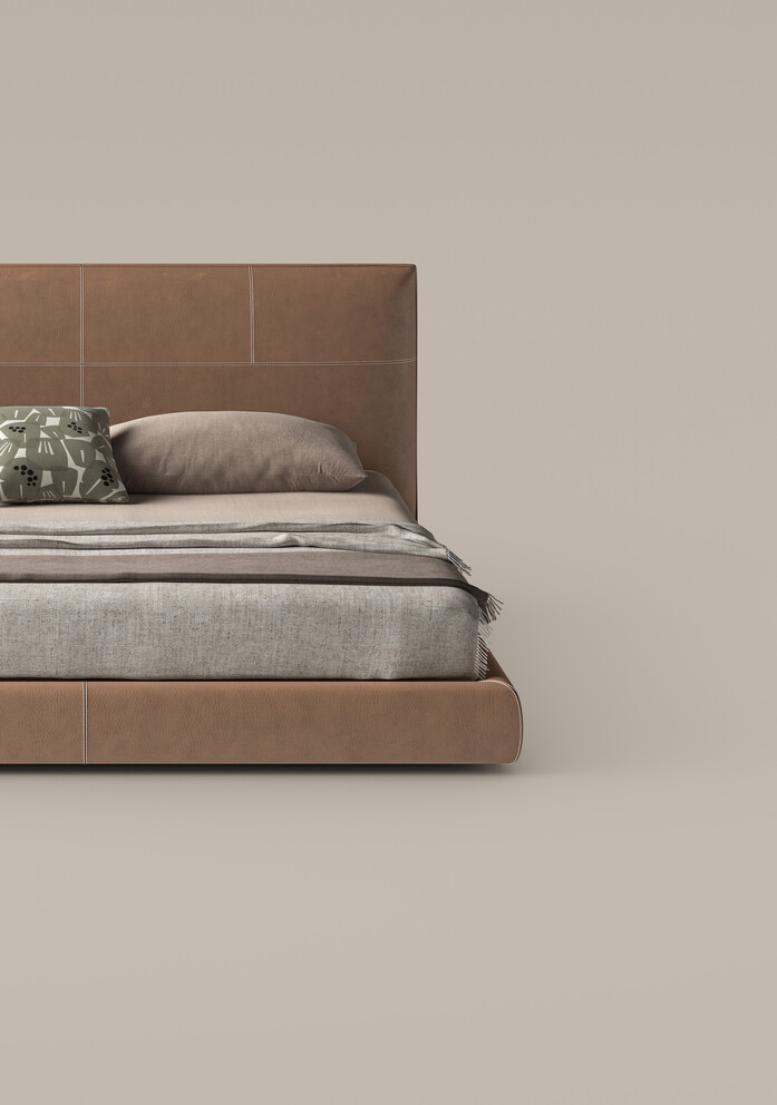 Кровать Oris, разработанная Габриэле и Оскаром Бурати, исследует взаимодействие формы и функции через выразительную эстетику. Высокое прямоугольное изголовье и обтекаемые боковины, доходящие до пола, создают сдержанный, выверенный архитектурный образ. Обивка из кожи или толстой выработанной кожи, украшенная мягкими разрезами и контрастной строчкой, отсылает к традициям кожевенного мастерства и искусства изготовления седел, подчеркивая уникальность дизайна.