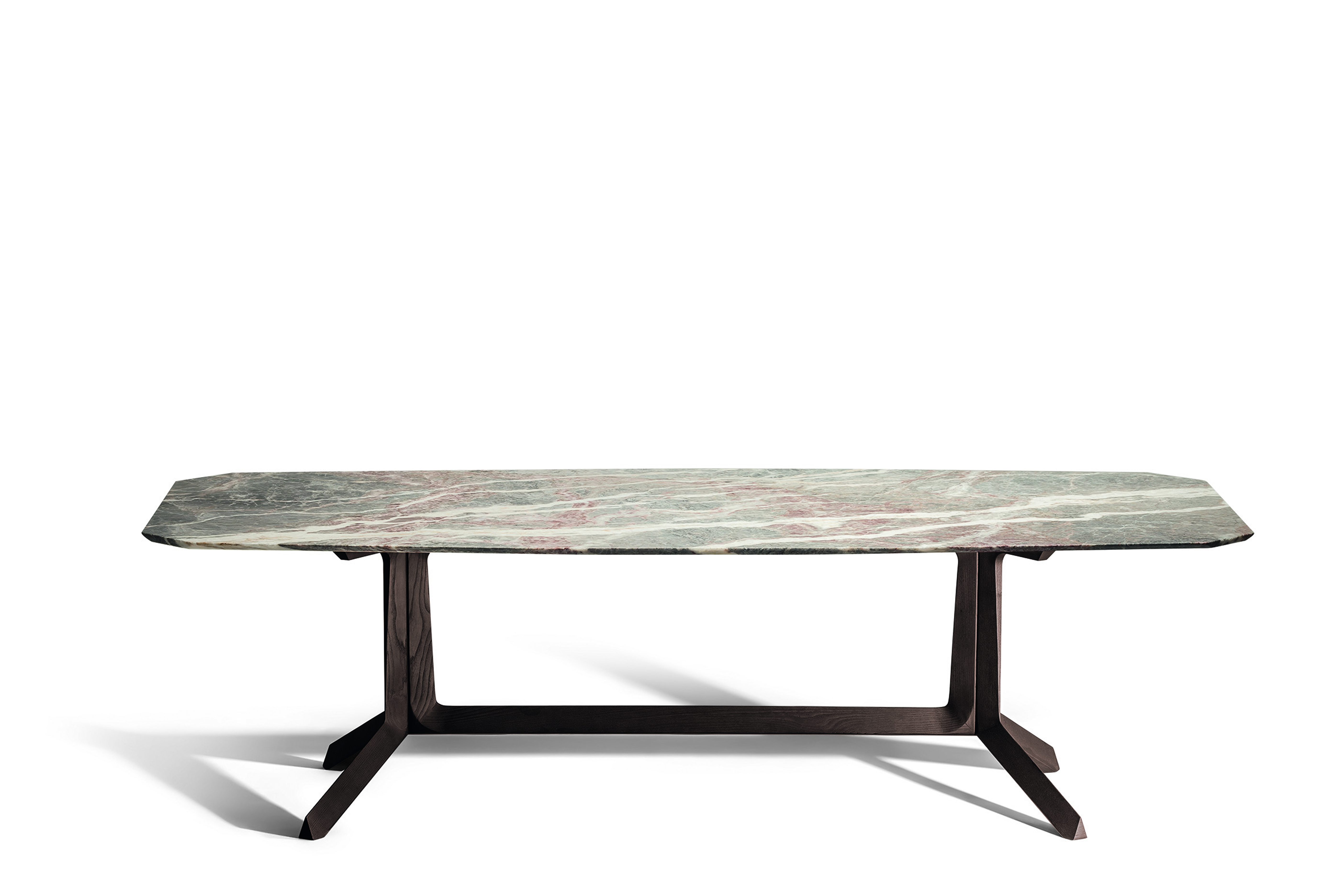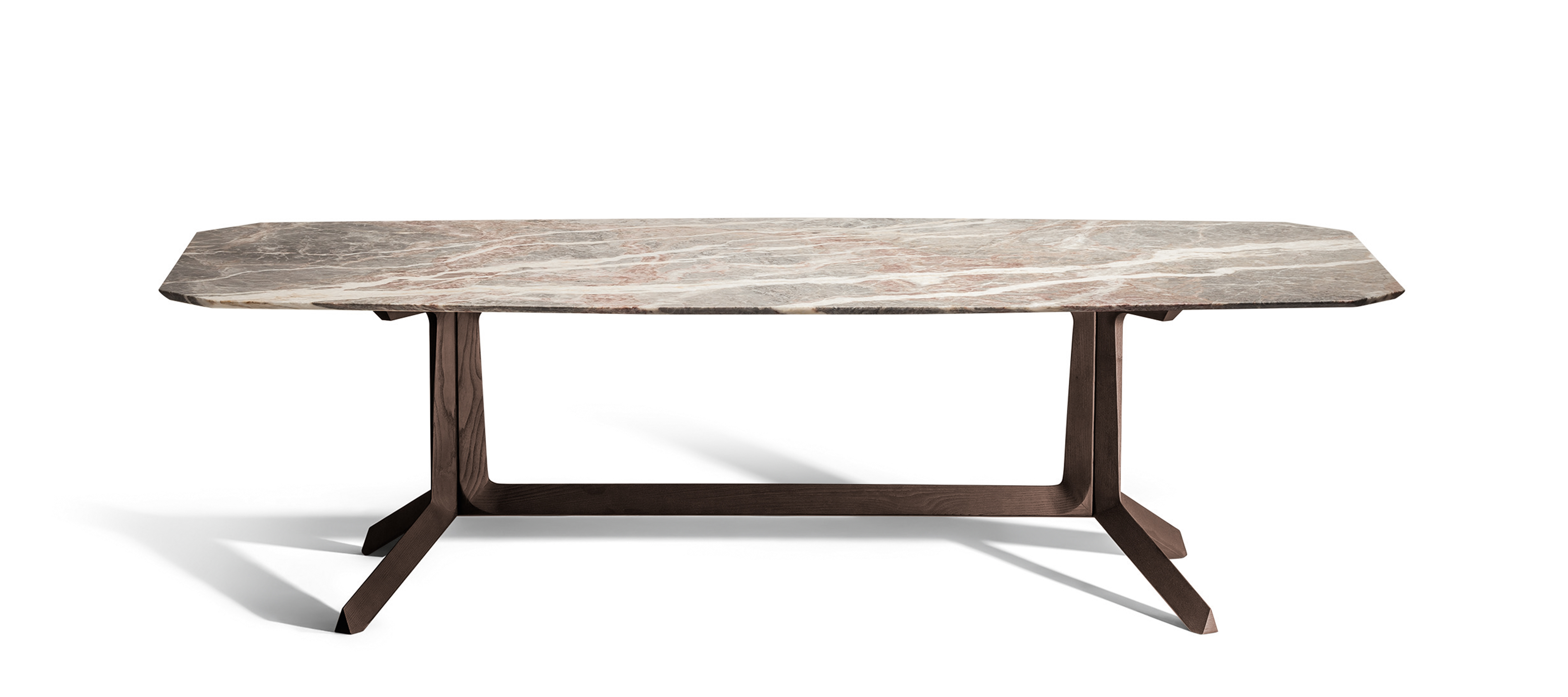 Ножки из массива ясеня с морилкой цвета мокко или венге создают впечатление геометрической скульптуры. Столешницы же, напротив, мягкие и изогнутые, как в круглой, так и в прямоугольной версии. Отличительной чертой столов Othello является деревянная структура треугольного сечения с четкими краями, которые прекрасно перекликаются с ромбовидной отделкой по краям столешниц. Компания Poltrona Frau выбрала два разных материала для столешниц. Дымчатое стекло, полупрозрачное и легкое, подчеркивает архитектурную основательность ножек. Fior di Pesco, особенно ценный сорт мрамора, привлекает внимание своими богатыми и изящными прожилками, которые при естественном освещении открывают полупрозрачные, почти прозрачные участки. В качестве альтернативы предлагается не менее ценный мрамор Calacatta Gold. Стеклянные столы Othello интегрированы с видимыми распорками из шлифованной нержавеющей стали. В мраморной версии с полированной или полуполированной отделкой нижняя часть столешницы усилена технической сеткой для обеспечения ее прочности. Столешница опирается на подложку из ламината высокого давления.