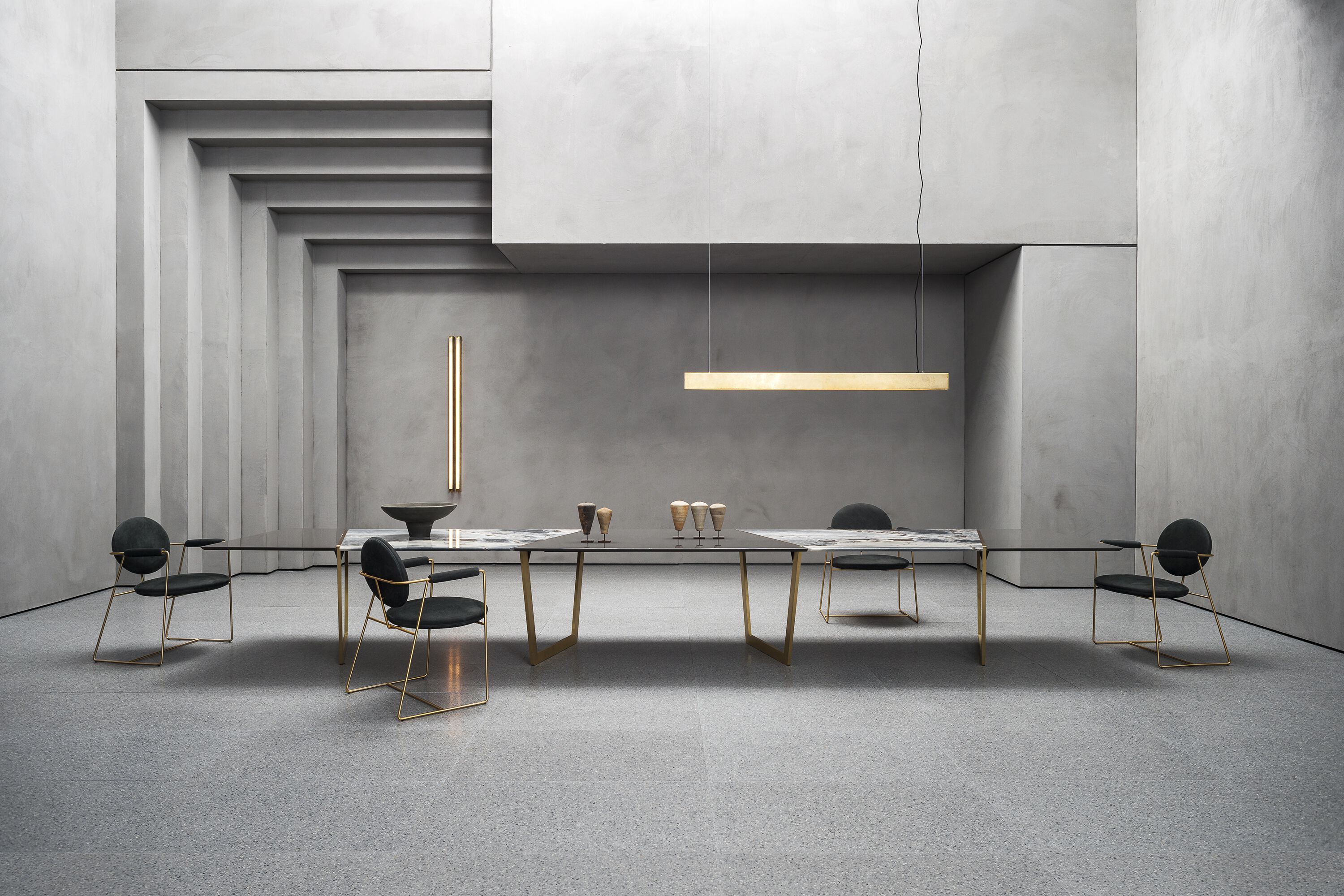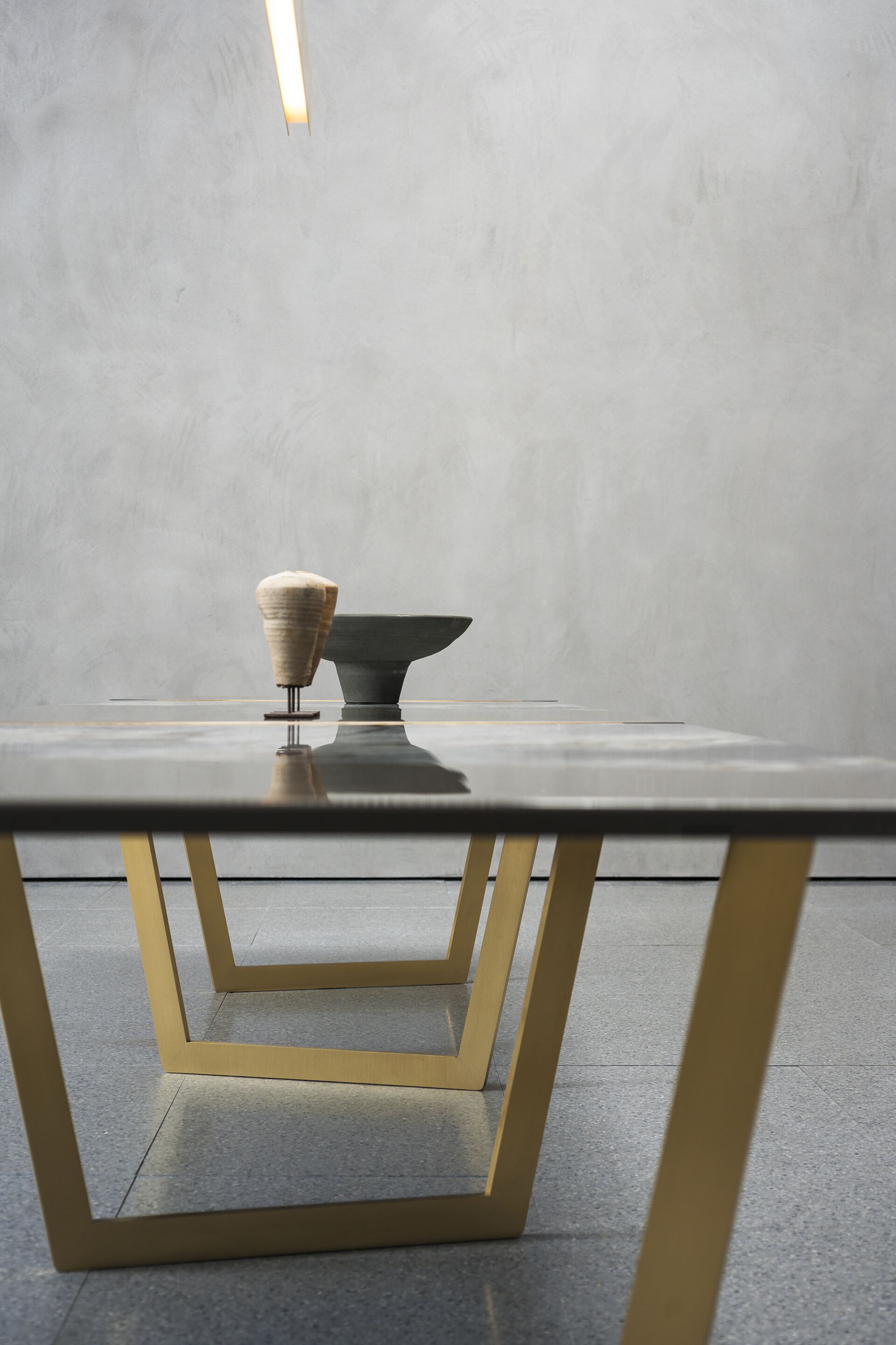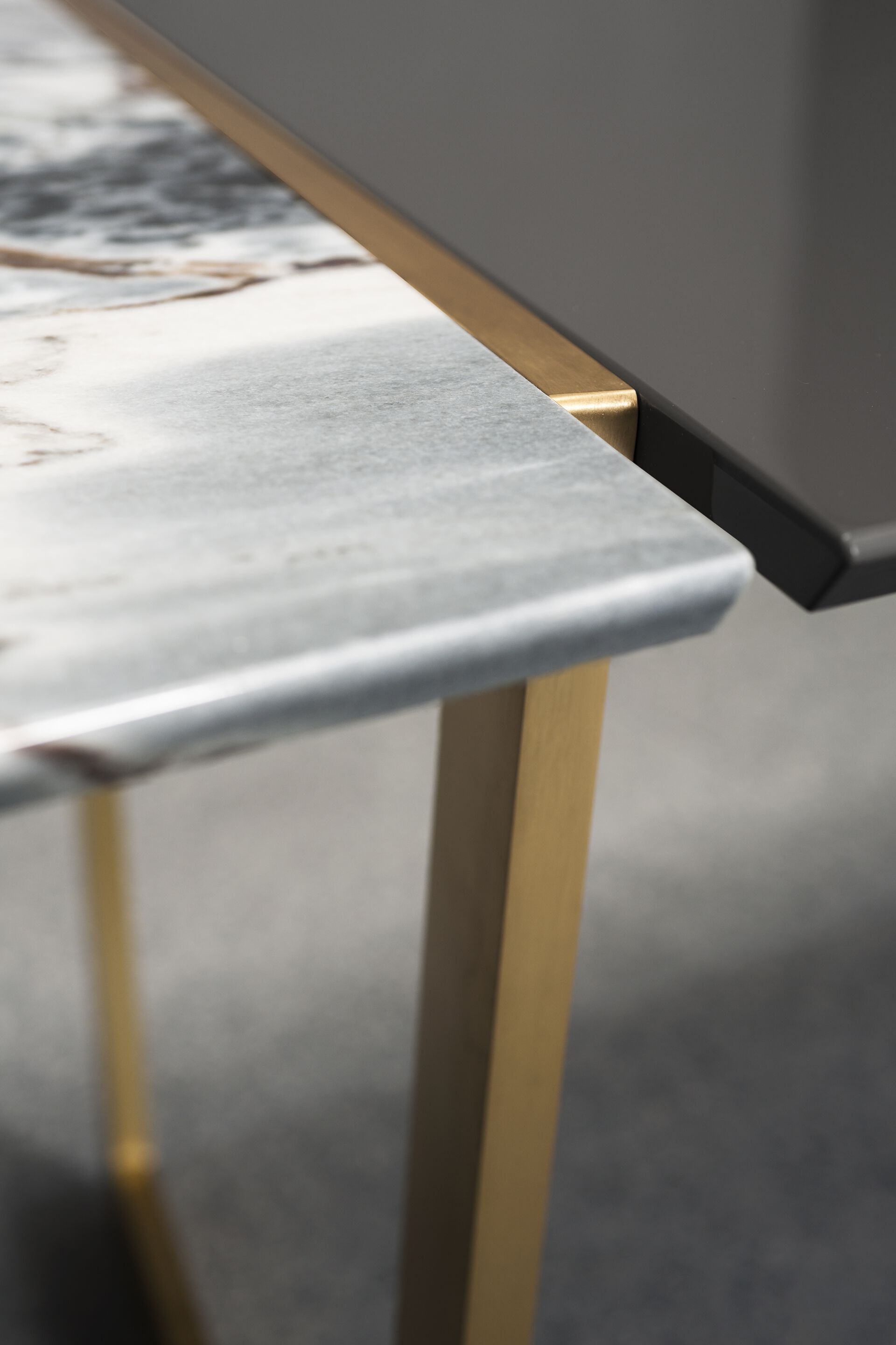 Стол, разработанный Хагит Пинкович. Основание и декоративные вставки на столешнице из сатинированного латунного покрытия с восковым финишем. Столешница из МДФ с усилением алюминиевыми листами, лакированная с прямым полированием. Вставки из мрамора с алюминиевым сотовым поддерживающим слоем, толщиной 14 мм. Доступные варианты отделки и камня: