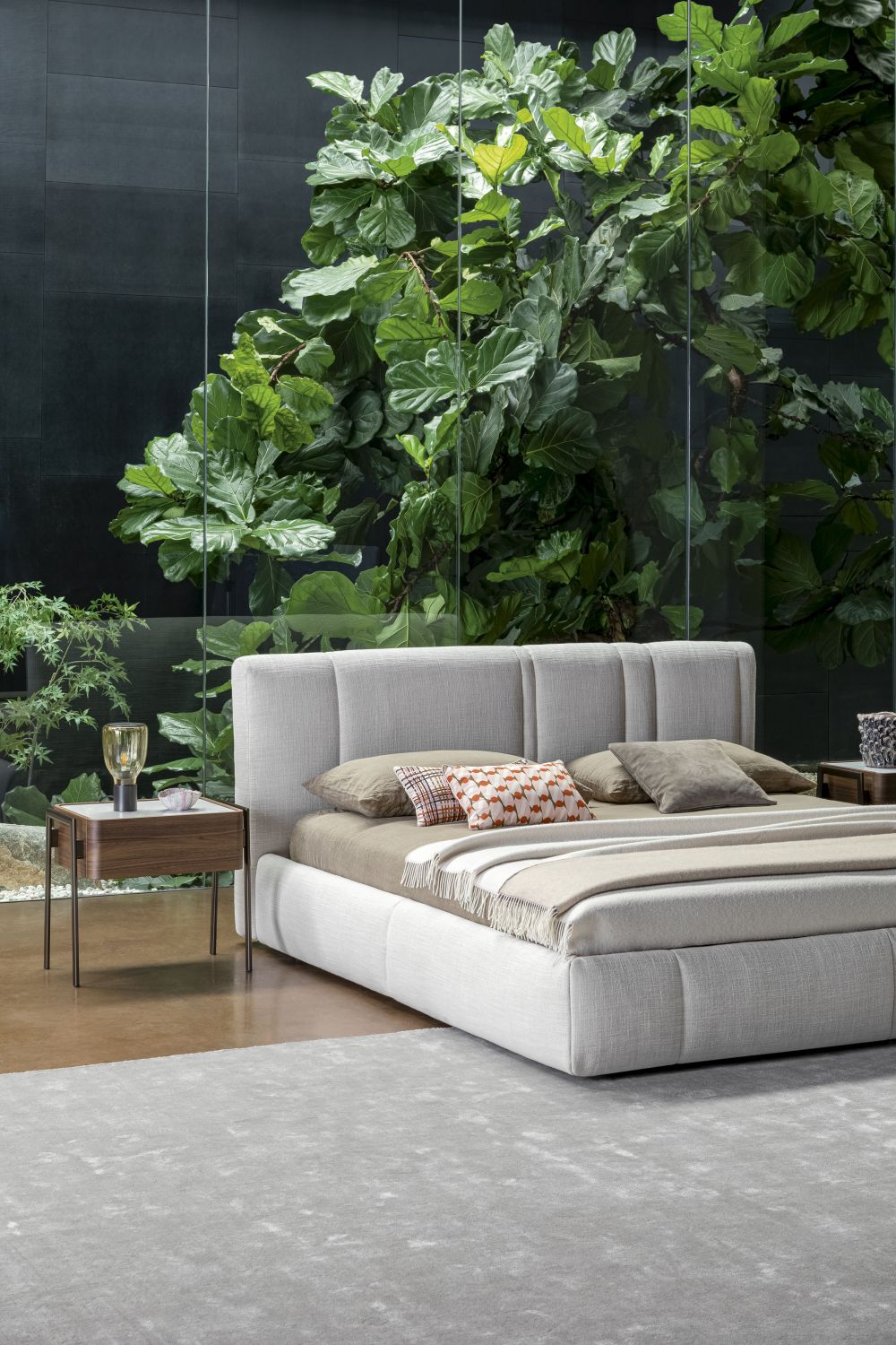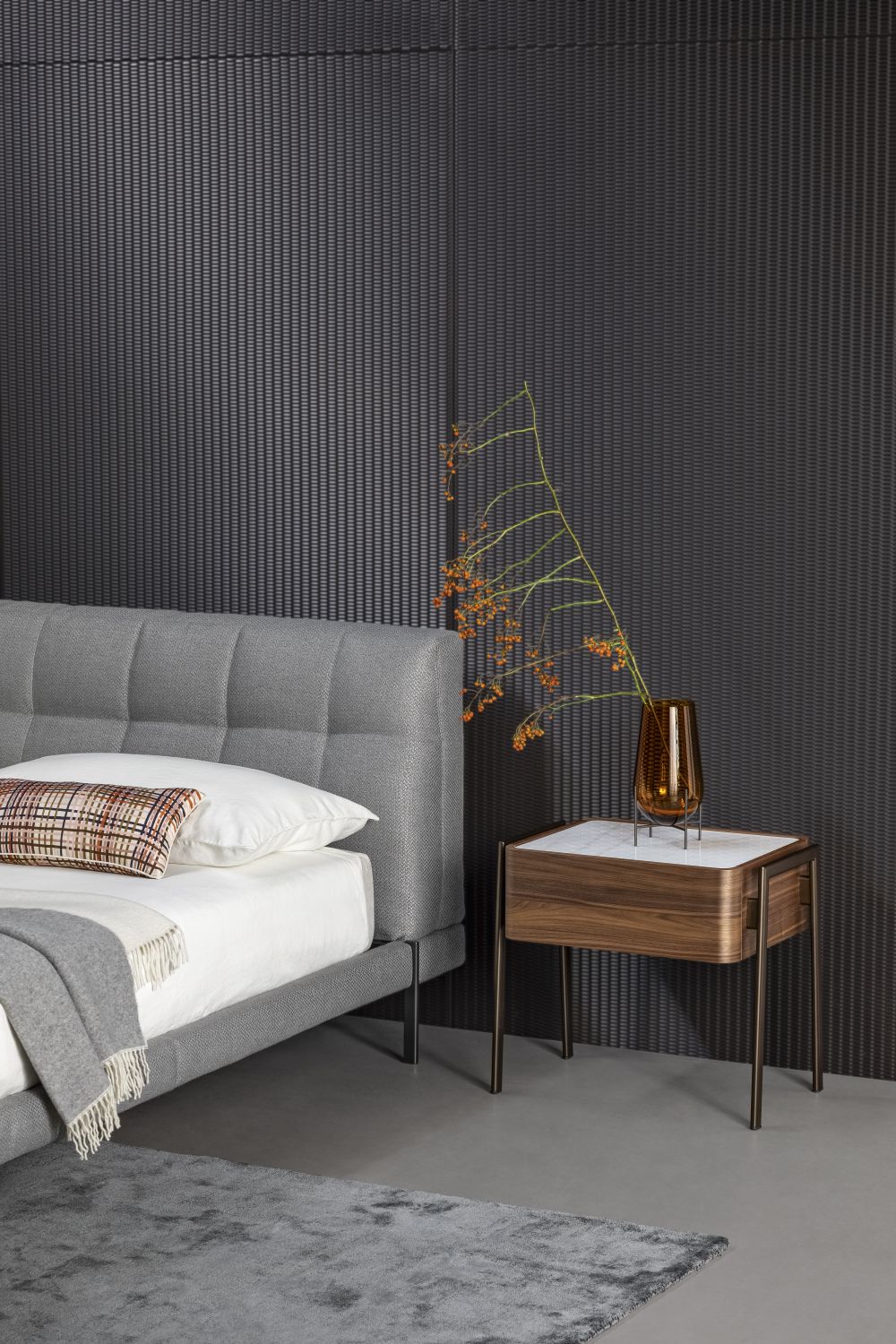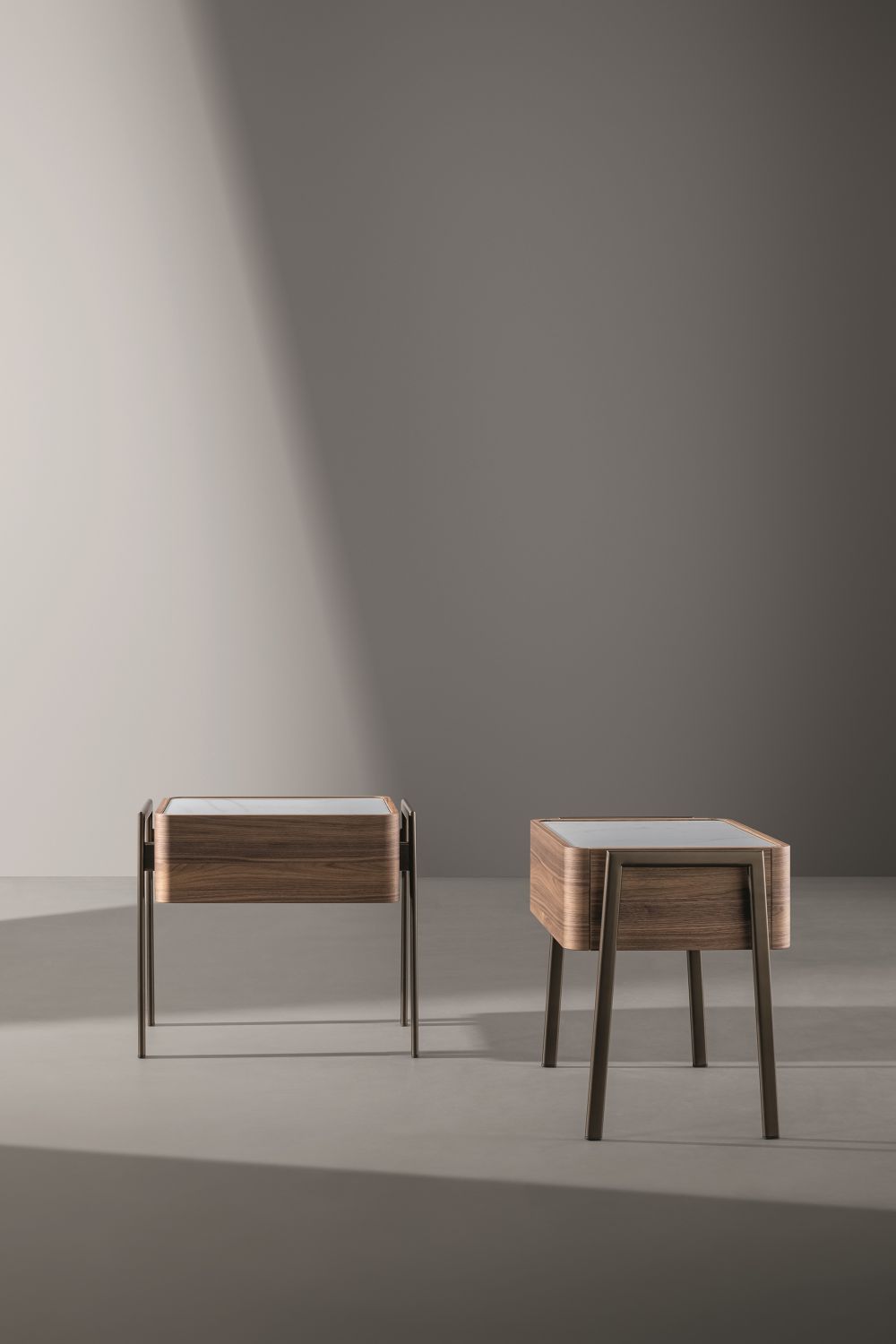 Partout — прикроватная тумбочка с лаконичным, выверенным дизайном, способным гармонично вписаться в спальню любого стиля. Основной объём с плавно закруглёнными углами выполнен из дерева и дополнен изящной столешницей из мрамора или керамики.