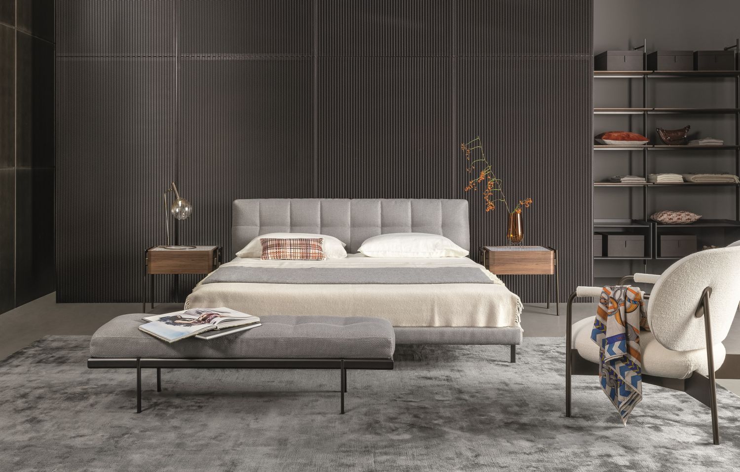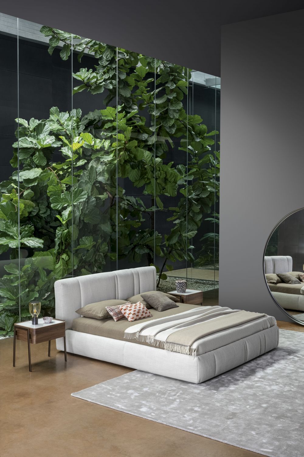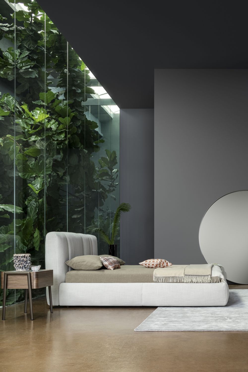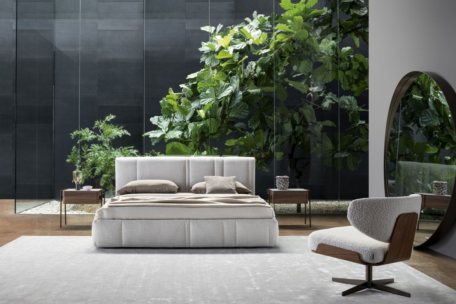 Partout — прикроватная тумбочка с лаконичным, выверенным дизайном, способным гармонично вписаться в спальню любого стиля. Основной объём с плавно закруглёнными углами выполнен из дерева и дополнен изящной столешницей из мрамора или керамики.