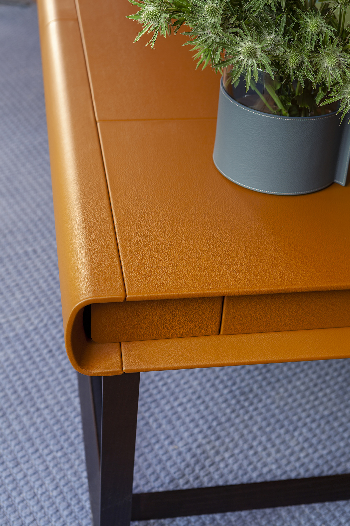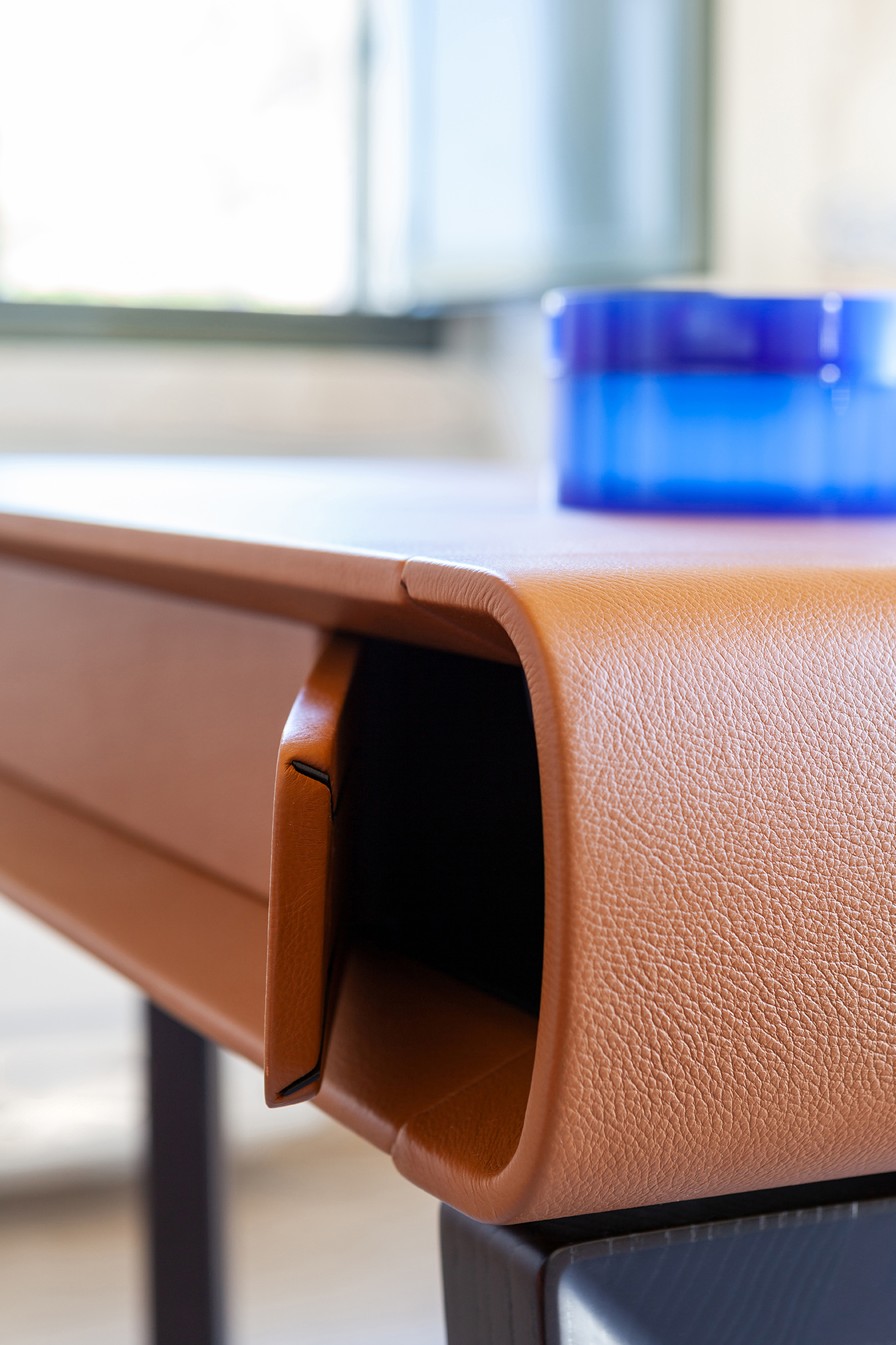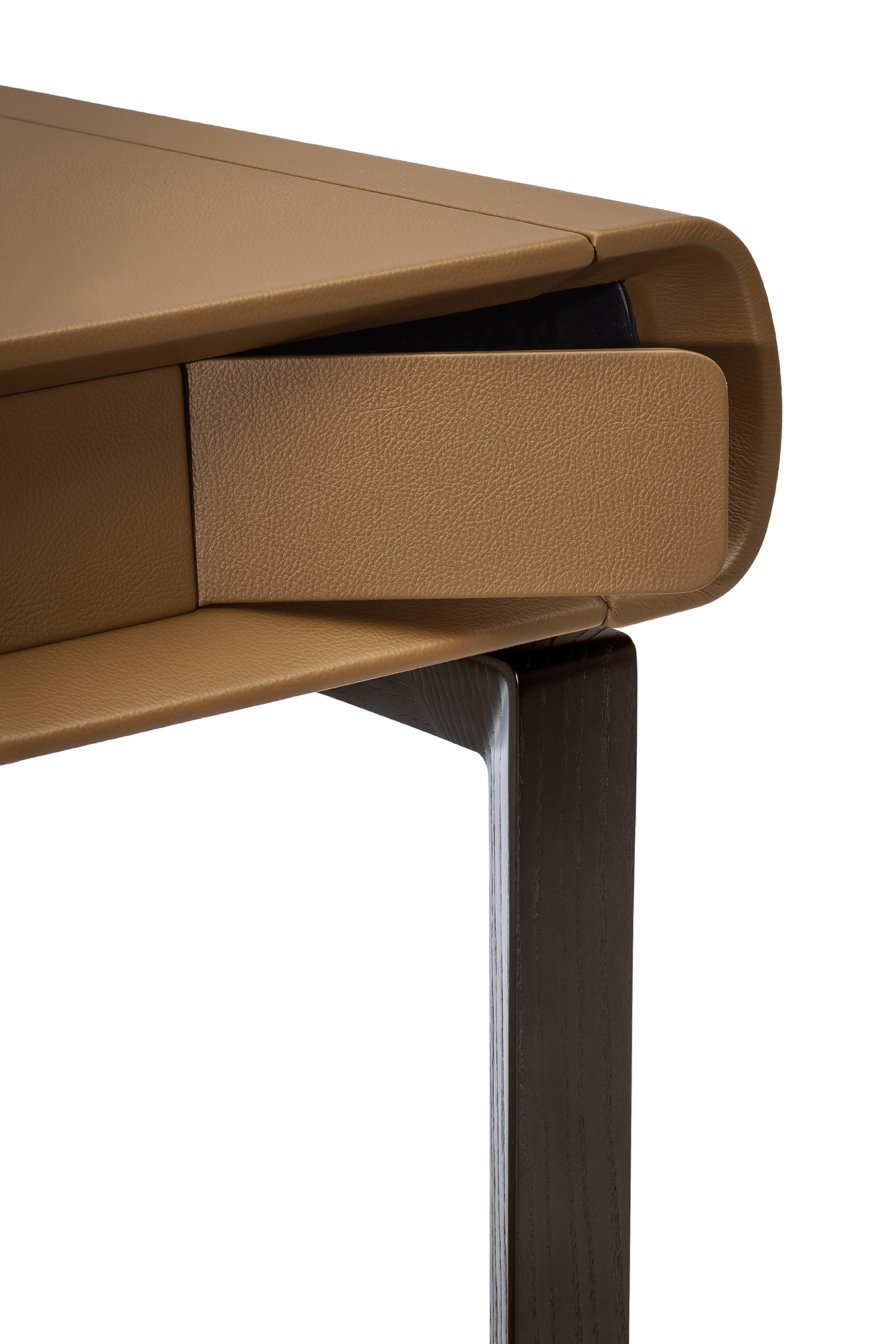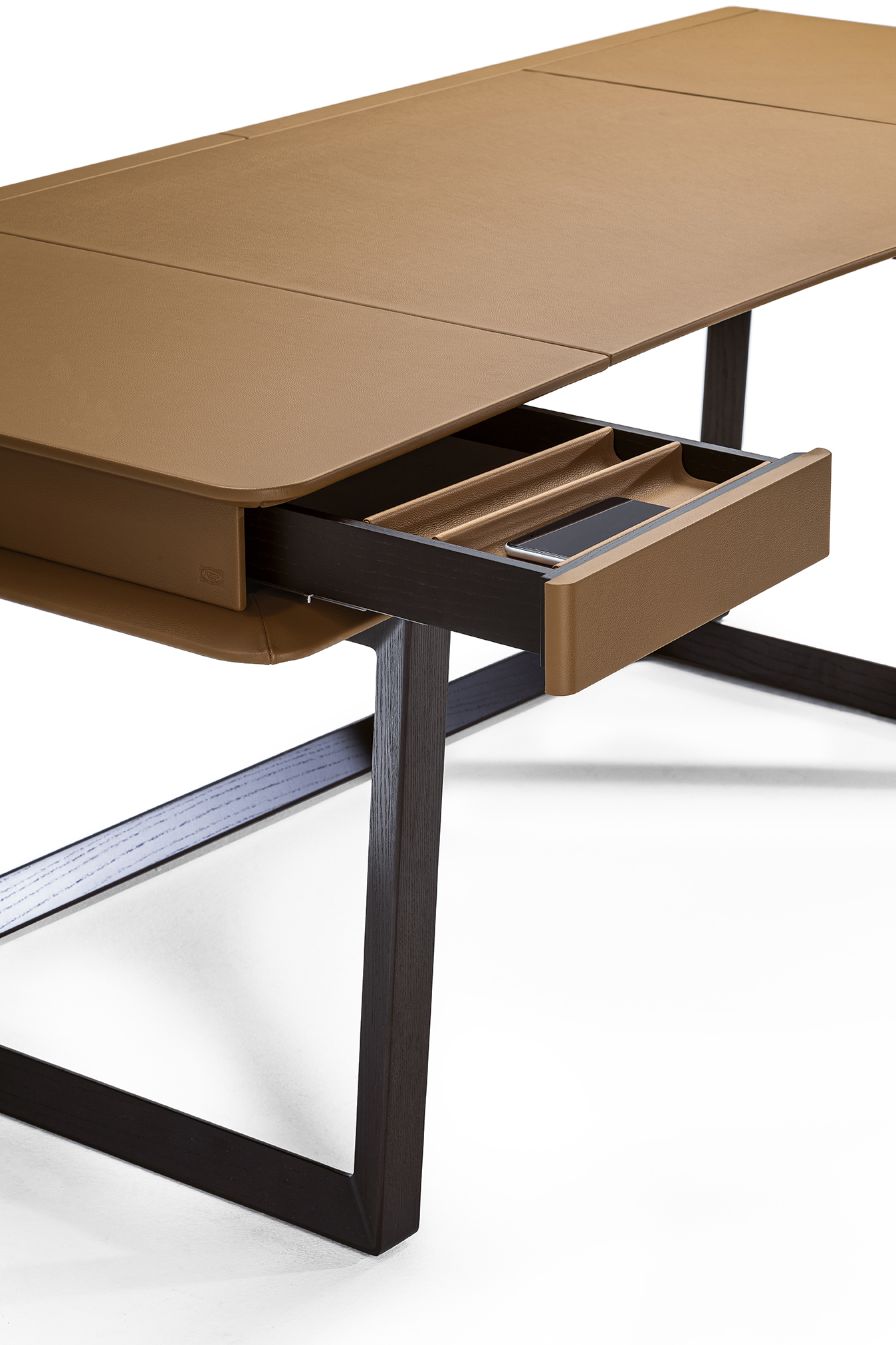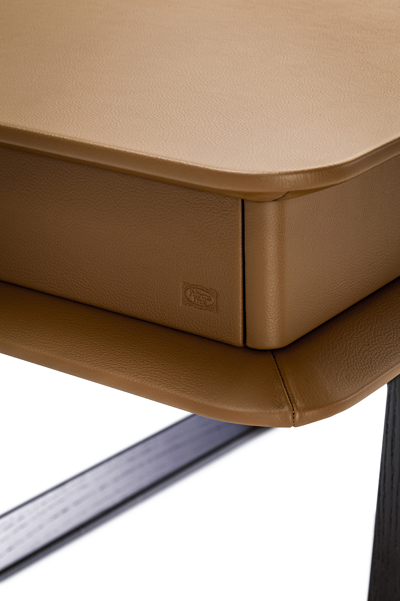 Основание состоит из мольберта, изготовленного из массива ясеня треугольного сечения, окрашенного в цвет мокко или венге, который образует три трапециевидные опоры, соединенные между собой тонкими соединениями, выполненными в дереве. Фасады двух ящиков изготовлены из МДФ, обтянуты кожей Pelle Frau®, сочетающейся с обивкой столешницы, а внутренняя конструкция выполнена из массива ясеня, окрашенного в цвет венге. Обивка столешницы, фасадов ящиков, боковых стенок и дверец задних отделений выполнена из Pelle Frau® ColorSphere.