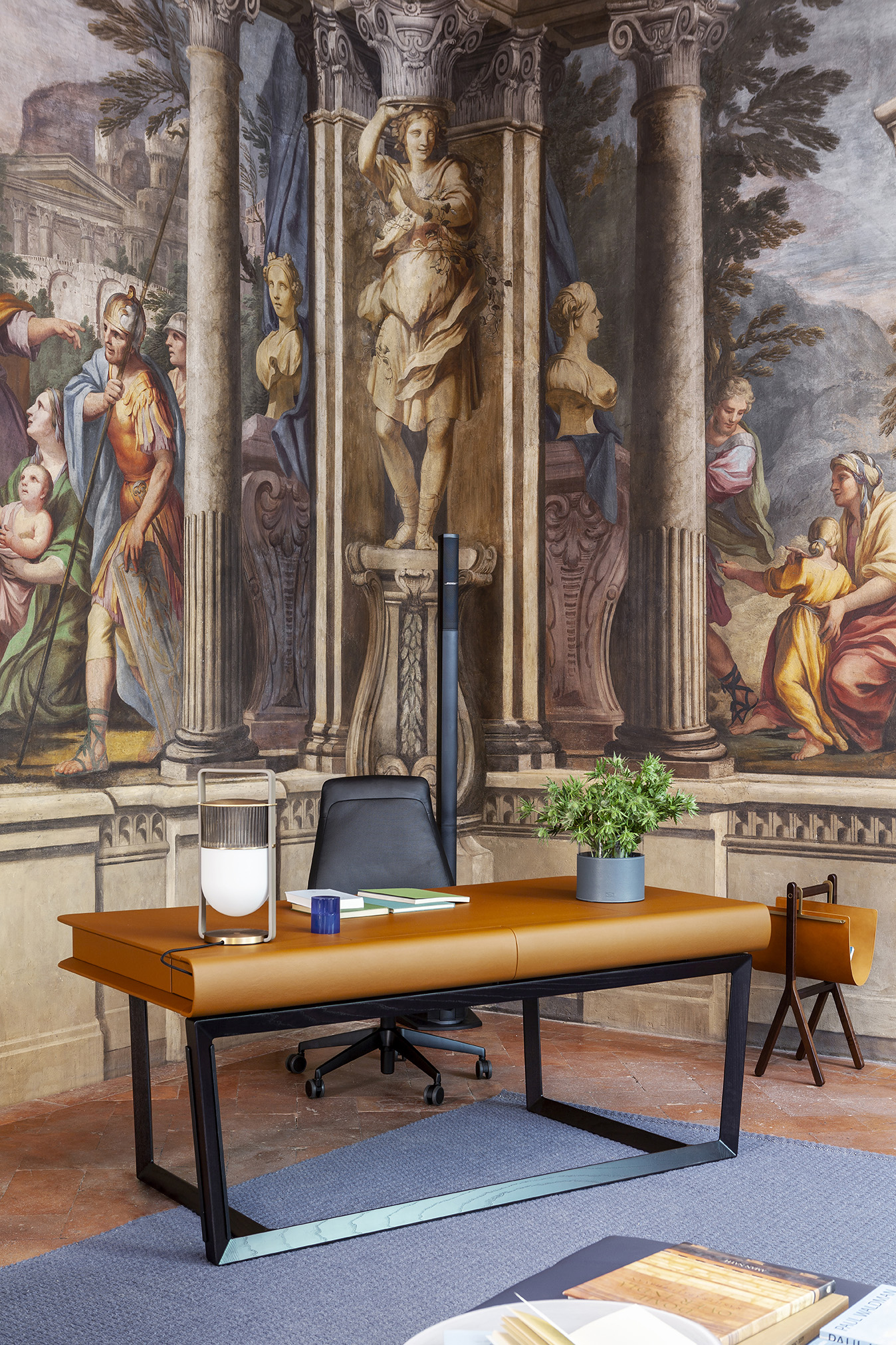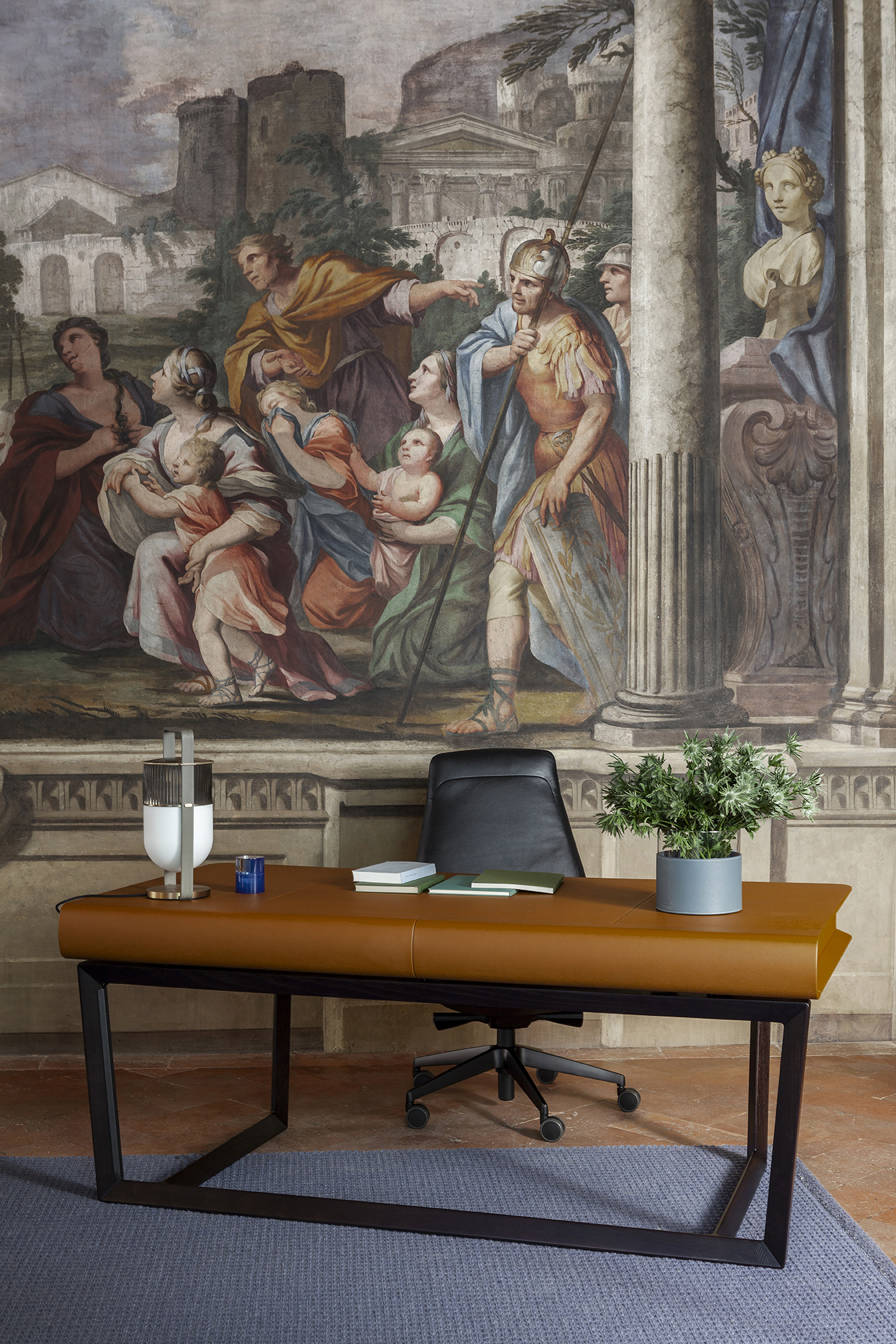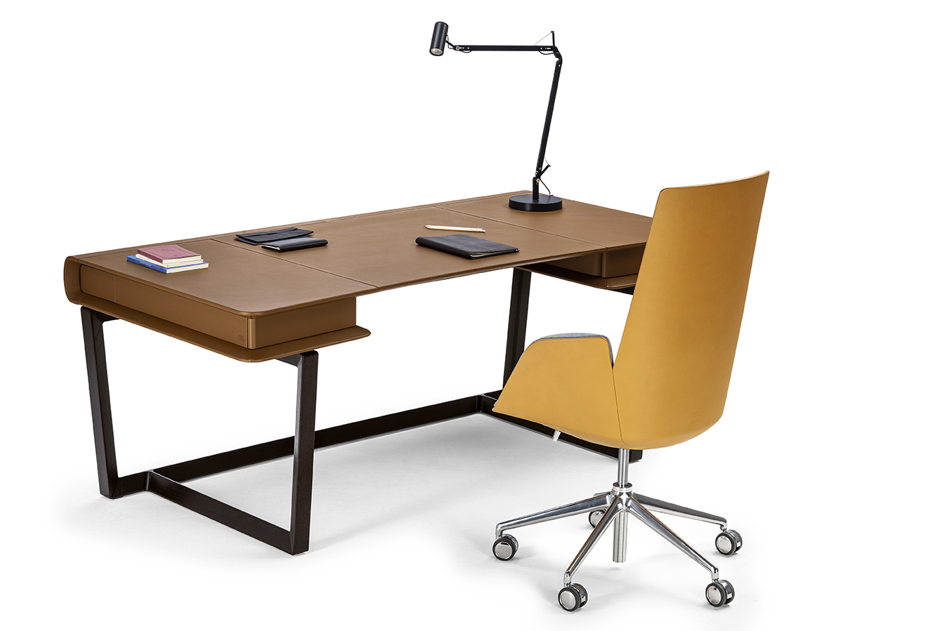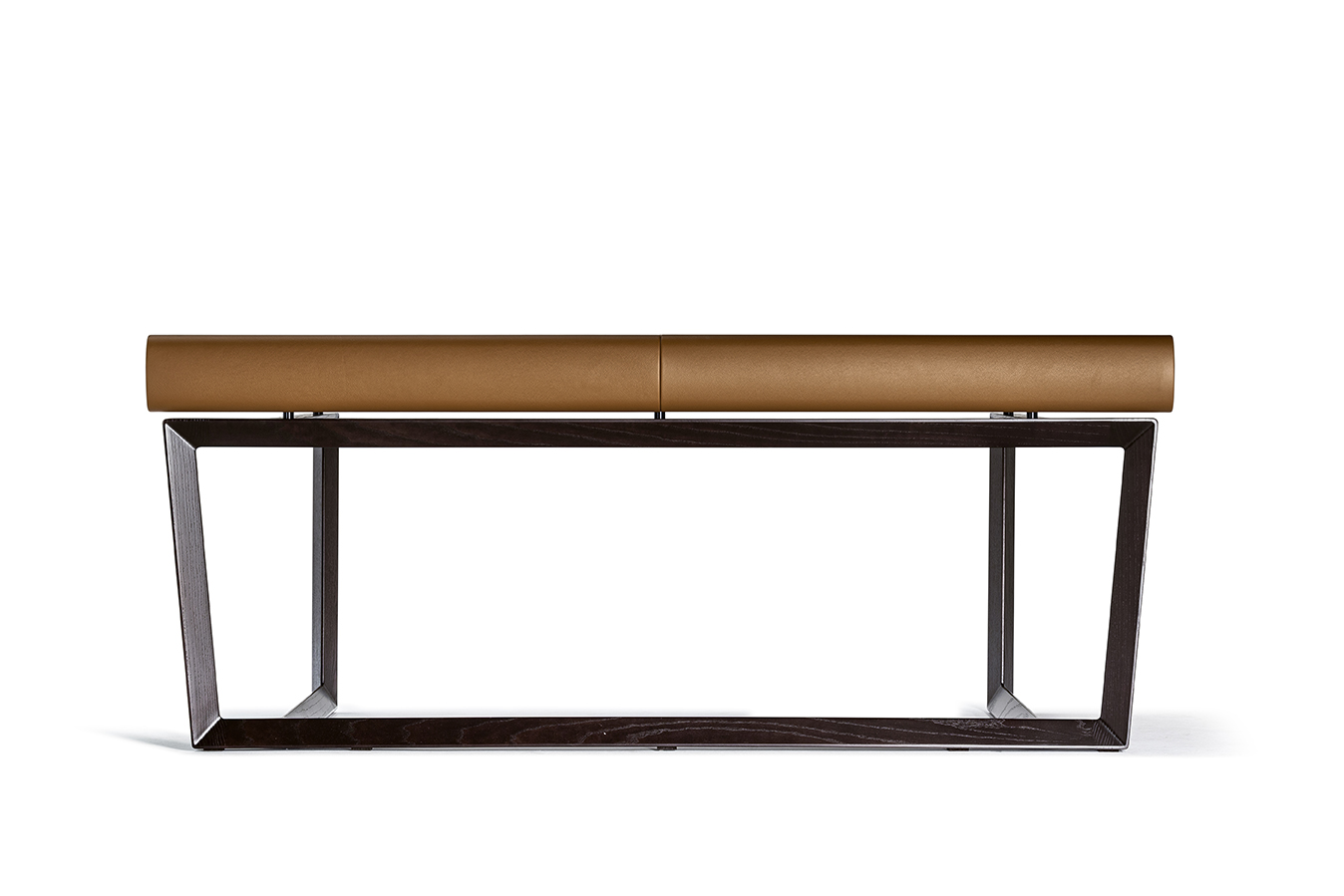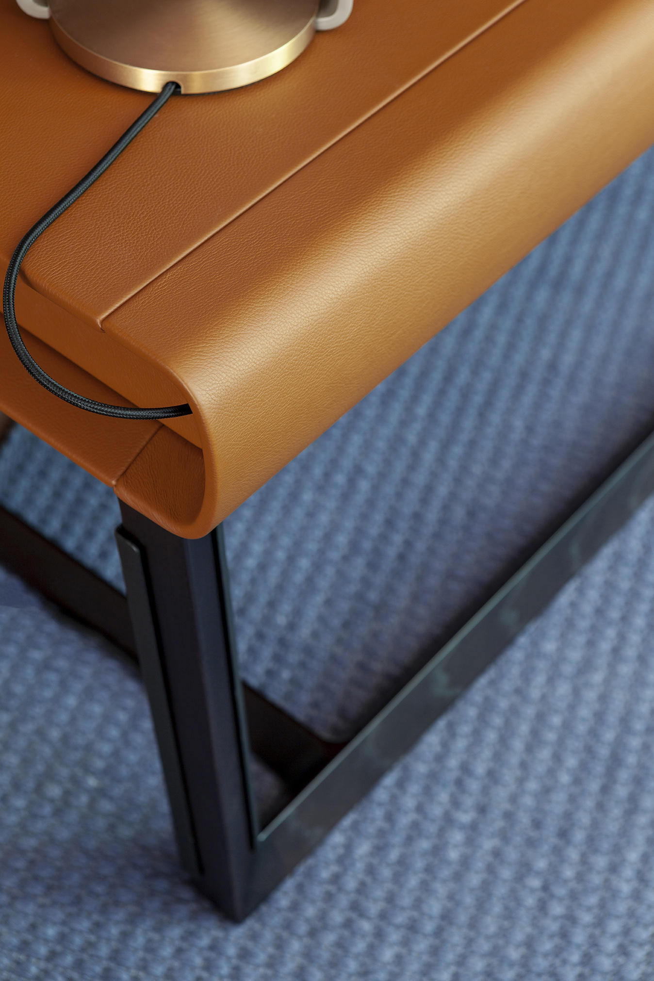 Основание состоит из мольберта, изготовленного из массива ясеня треугольного сечения, окрашенного в цвет мокко или венге, который образует три трапециевидные опоры, соединенные между собой тонкими соединениями, выполненными в дереве. Фасады двух ящиков изготовлены из МДФ, обтянуты кожей Pelle Frau®, сочетающейся с обивкой столешницы, а внутренняя конструкция выполнена из массива ясеня, окрашенного в цвет венге. Обивка столешницы, фасадов ящиков, боковых стенок и дверец задних отделений выполнена из Pelle Frau® ColorSphere.