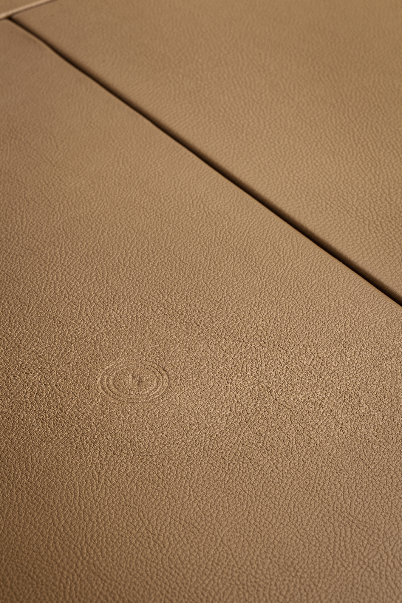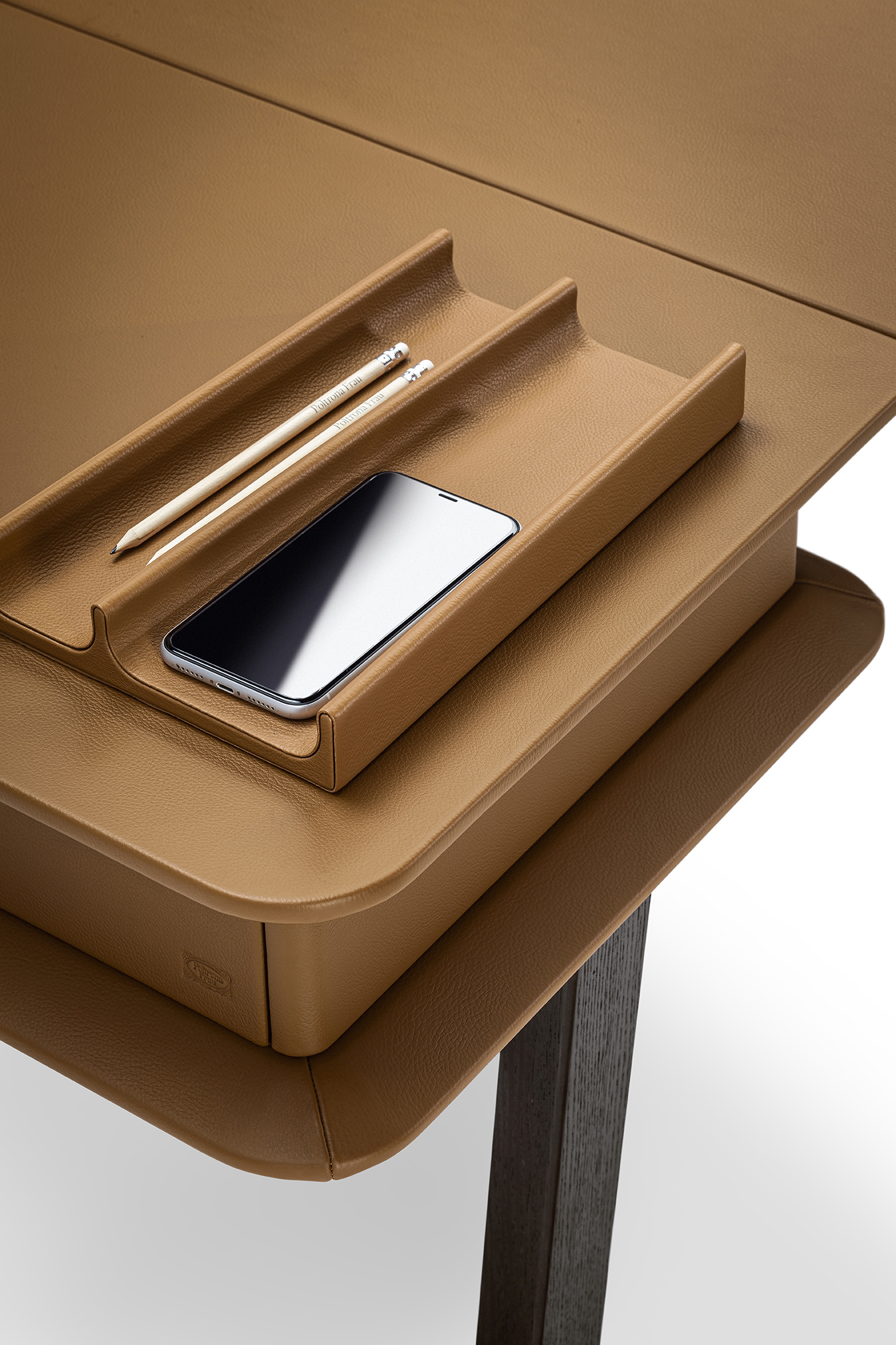 Также под кожаной обивкой столешницы можно установить индукционное зарядное устройство для смартфона, о чём свидетельствует фирменный логотип.