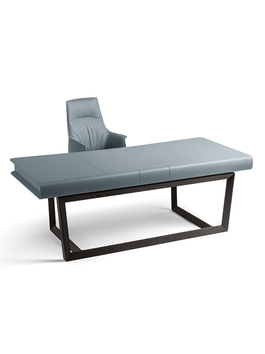 Большой стол Peek-a-Book состоит из очень простого листа тополиной фанеры, обтянутого кожей Pelle Frau®. Он изогнут и сложен пополам, образуя основание и столешницу, а также два ящика. Основание состоит из мольберта из массива ясеня треугольного сечения цвета мокко или венге, образующего три трапециевидные опоры, соединенные между собой тонкими соединениями, выполненными в дереве. Лицевая часть двух ящиков изготовлена из МДФ, обтянутого кожей Pelle Frau®, в тон обивке столешницы, а внутренняя часть выполнена из массива ясеня цвета венге.