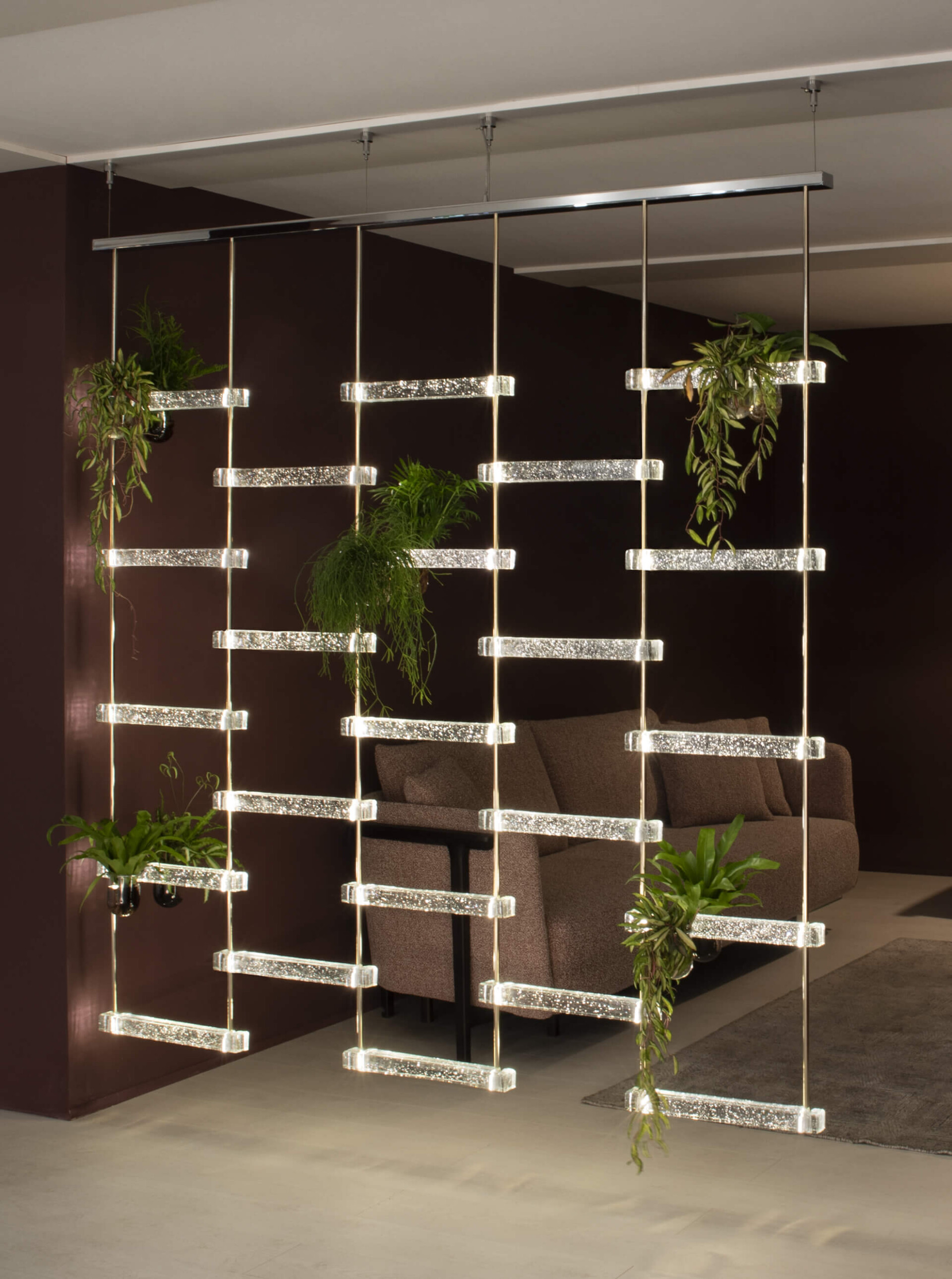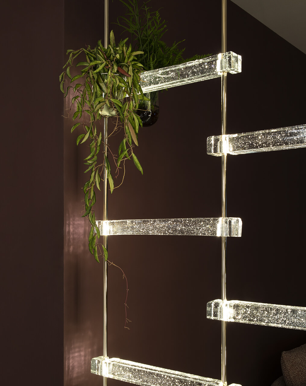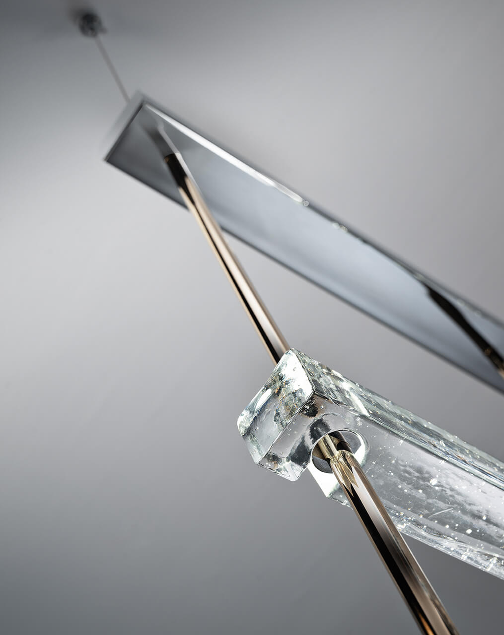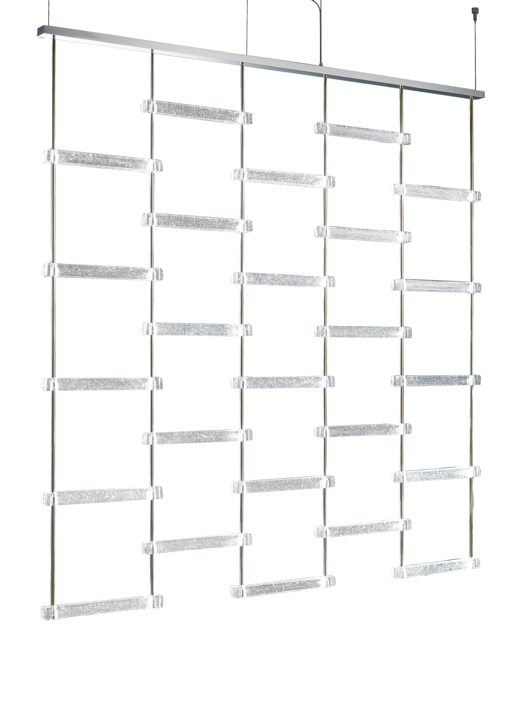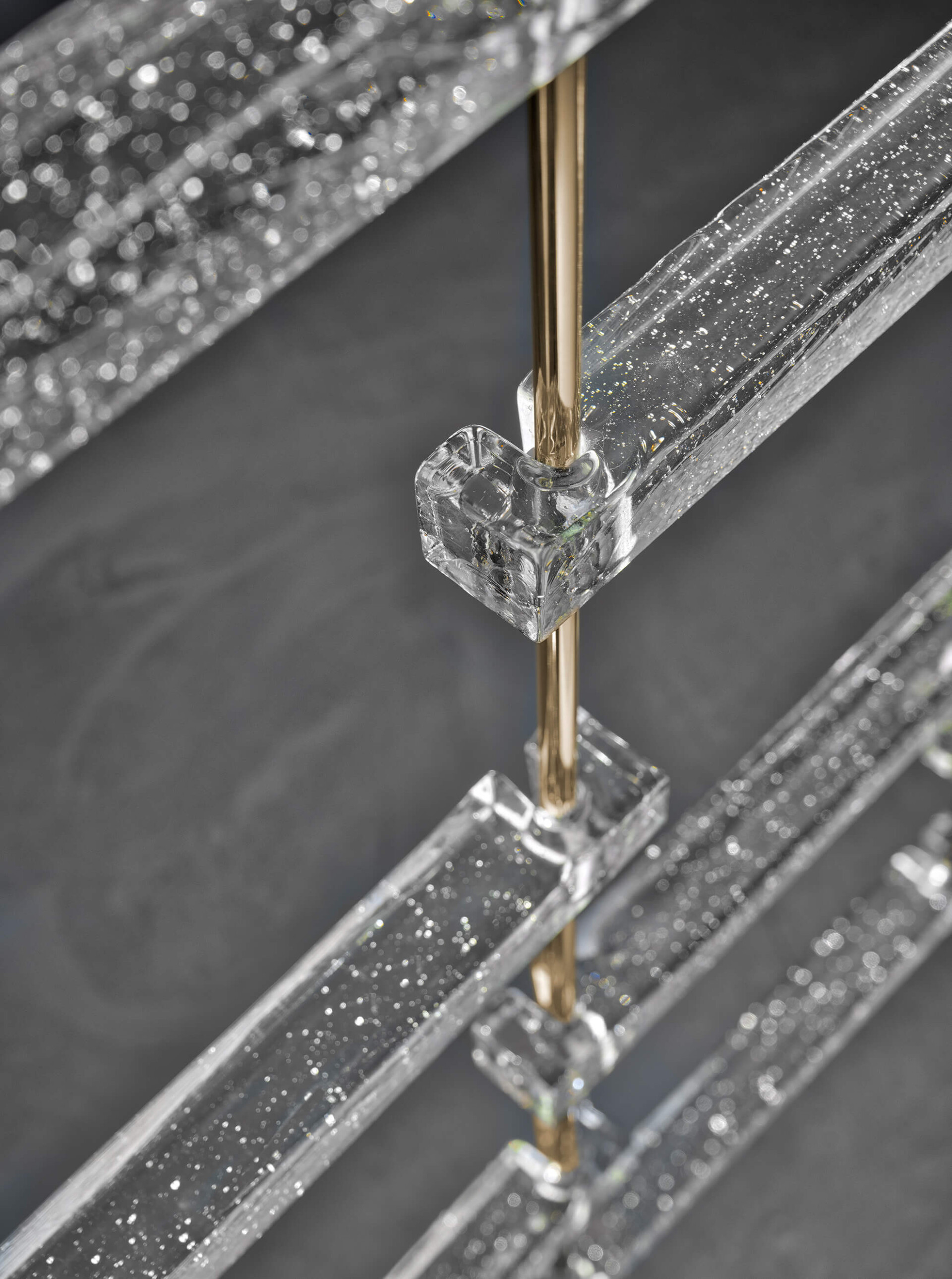 Веларий состоит из литых стеклянных прутков с внутренними микропузырьками, подсвеченных светодиодами. Металлическая конструкция с отделкой из светлого золота и хрома.