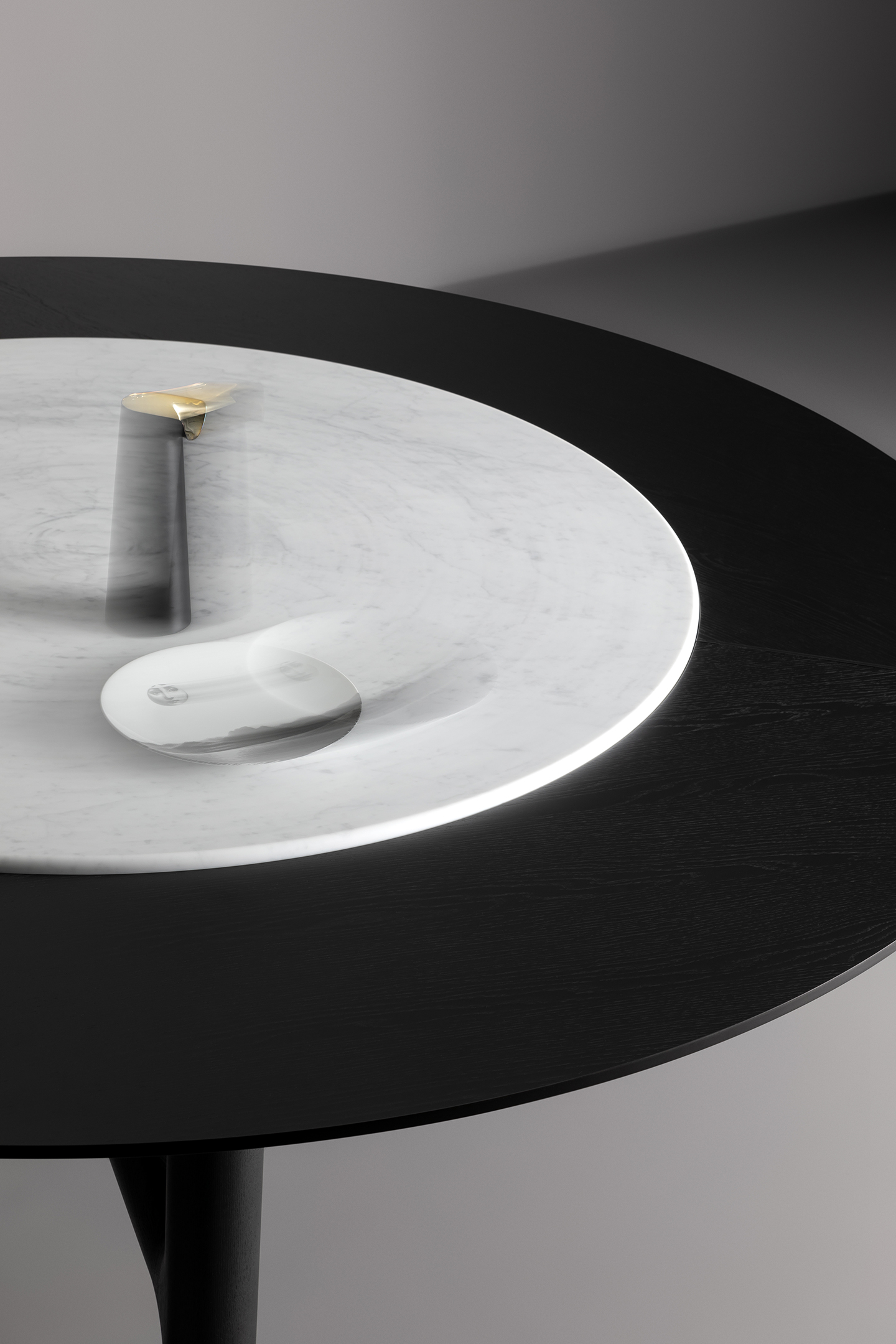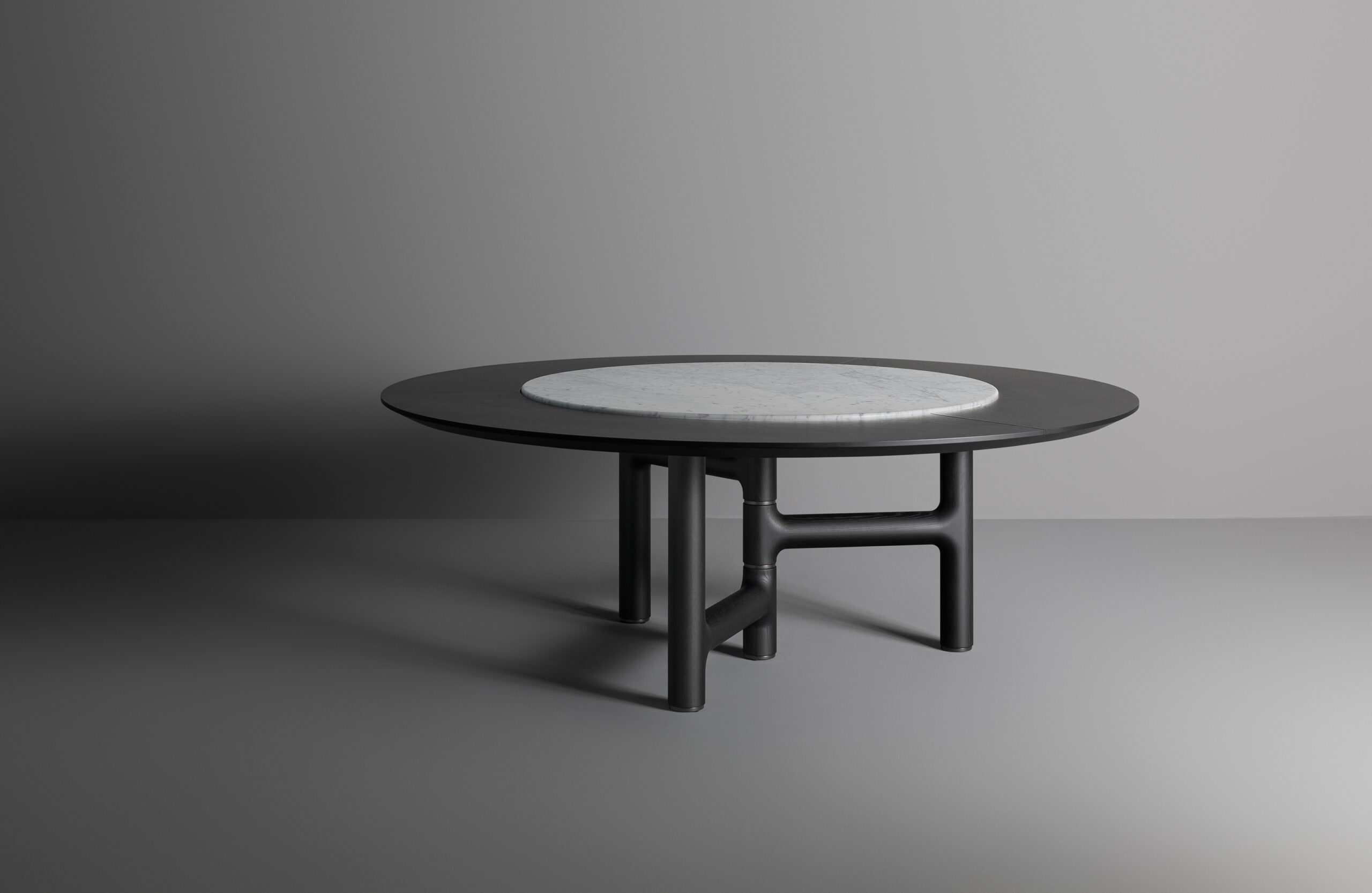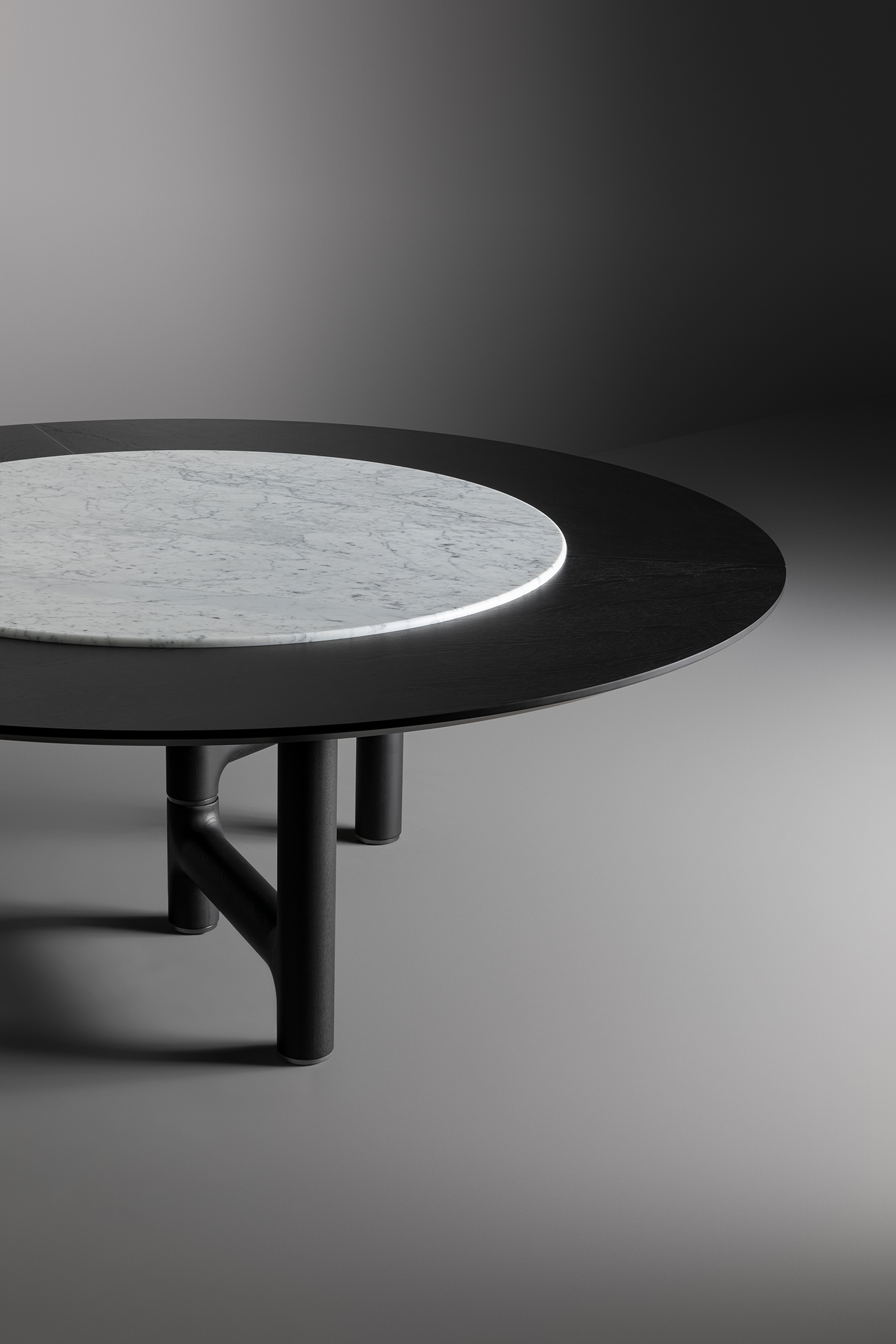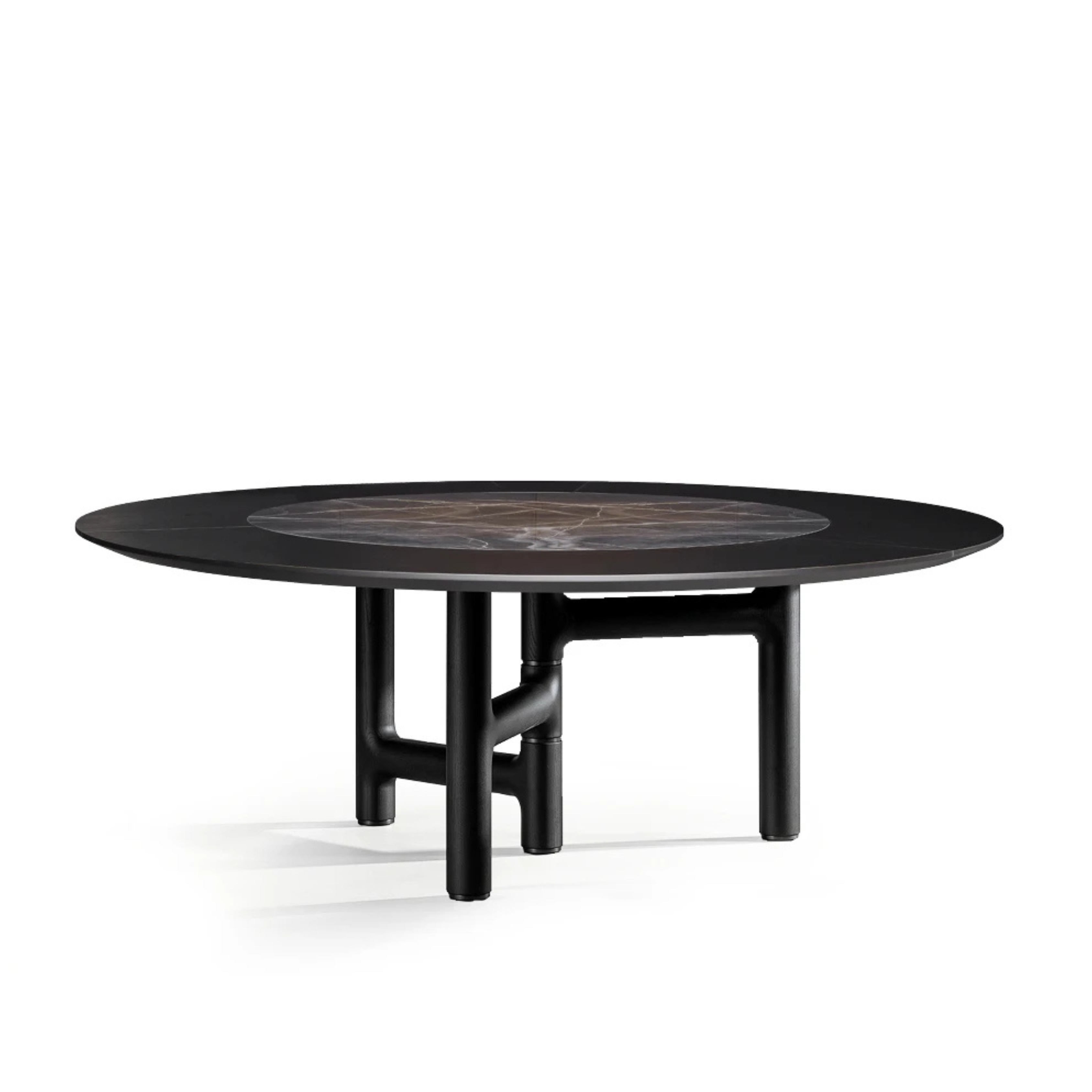 В версии ST (Swivel Top) с поворотной столешницей стол привлекает внимание своей круглой столешницей, доступной в трех различных размерах. Столешница сочетает материалы: внешняя деревянная рама окружает центральную часть, выполненную из керамики, создавая интересный контраст и подчеркивая современный дизайн.