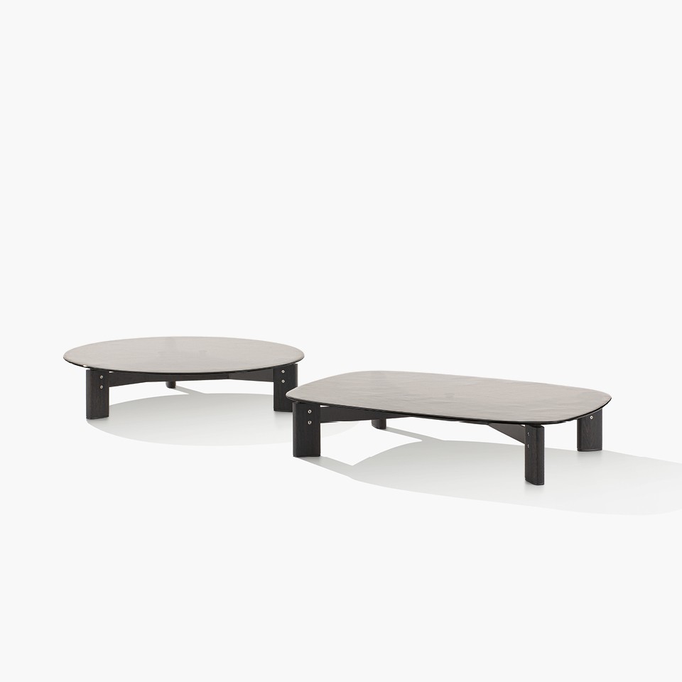 Коллекция стульев Ketch дополняется журнальными столиками, которые продолжают традиции массивных и прочных линий. Ножки изготовлены из массива дерева, а столешница доступна в двух вариантах: из того же материала, но с рейками, или из стекла, полученного вручную методом сплавления стекла с использованием песка для создания текстуры, которая уникальна как для глаз, так и для тактильных ощущений.