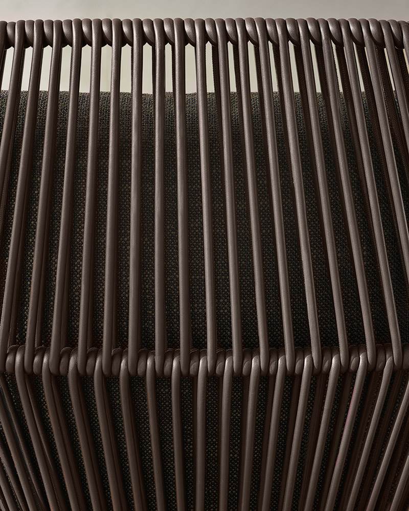 Материалы: металлический каркас, спинка и подлокотники выполнены из прочного шнура с ручным плетением, подушки — полиуретан с обивкой из ткани или кожи