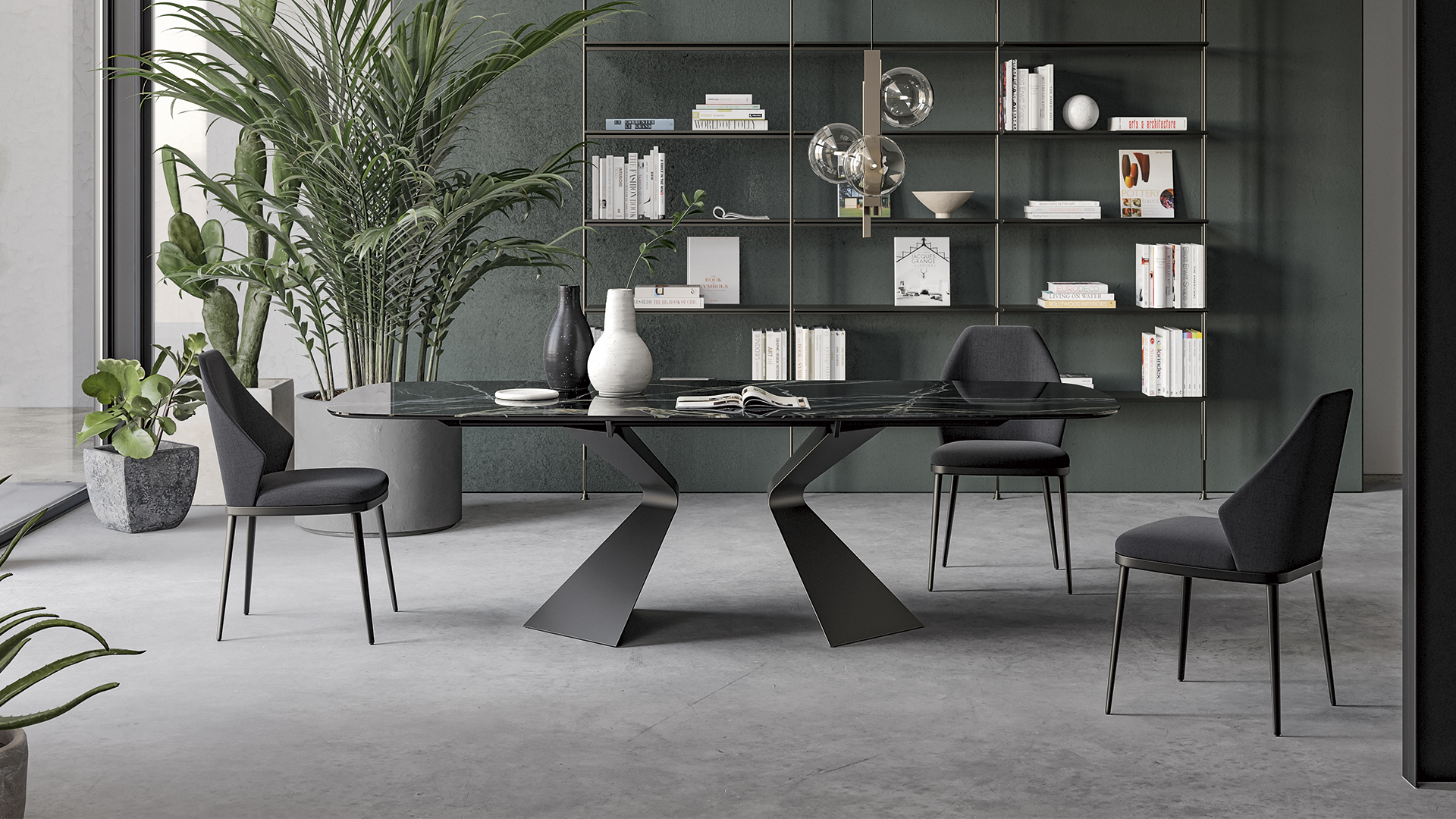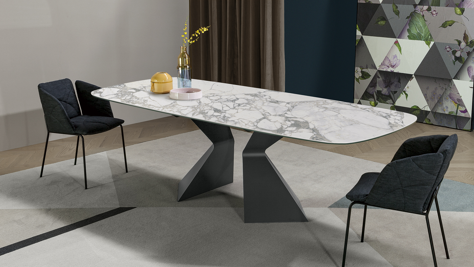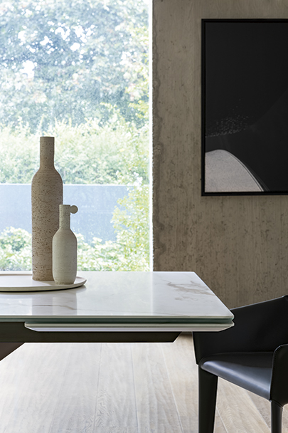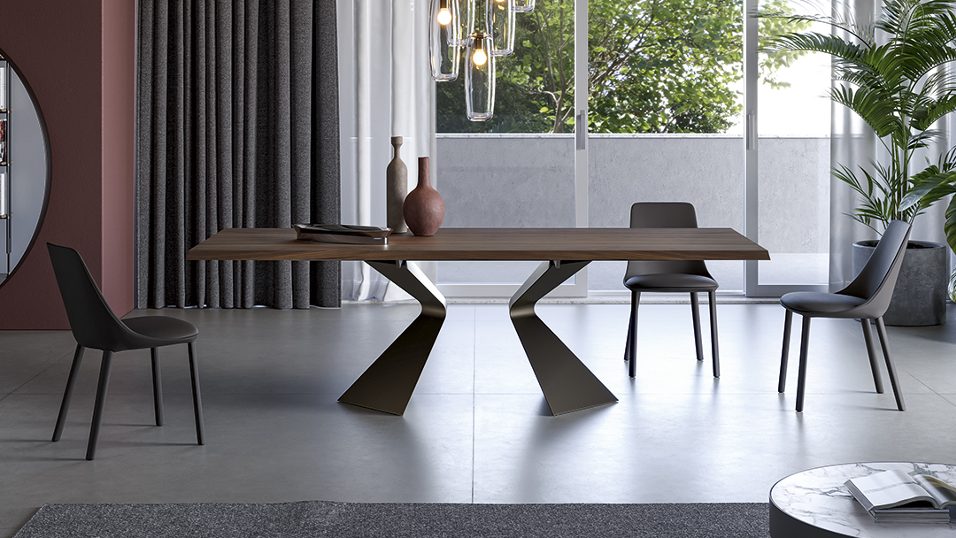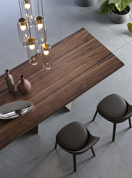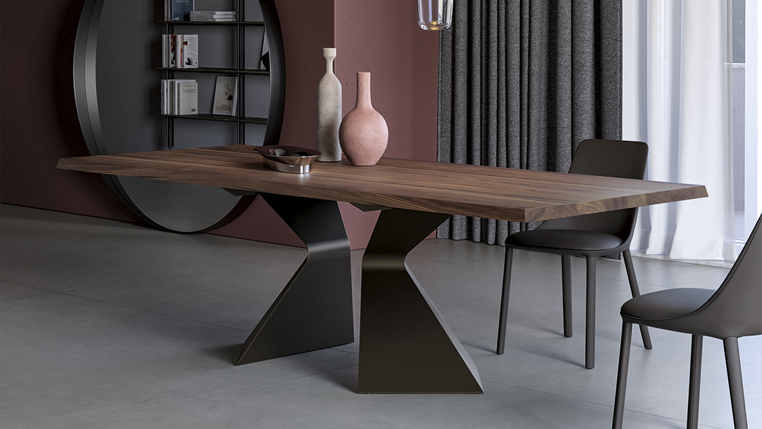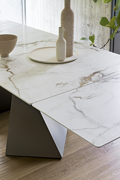 Основание стола с выразительным наклонным профилем, напоминающим нос корабля, придаёт конструкции динамичность и скульптурную пластику, эффективно организуя пространство. Широкий выбор вариантов отделки позволяет подчеркнуть художественную ценность модели и адаптировать её под разные стилистические задачи. Столешница доступна в различных размерах и исполнениях — как фиксированном, так и раздвижном. В раздвижной версии две независимые боковые вставки позволяют легко увеличить длину стола, при этом сохраняя высокую устойчивость и надёжность конструкции без ущерба для её чистых, изящных линий.
