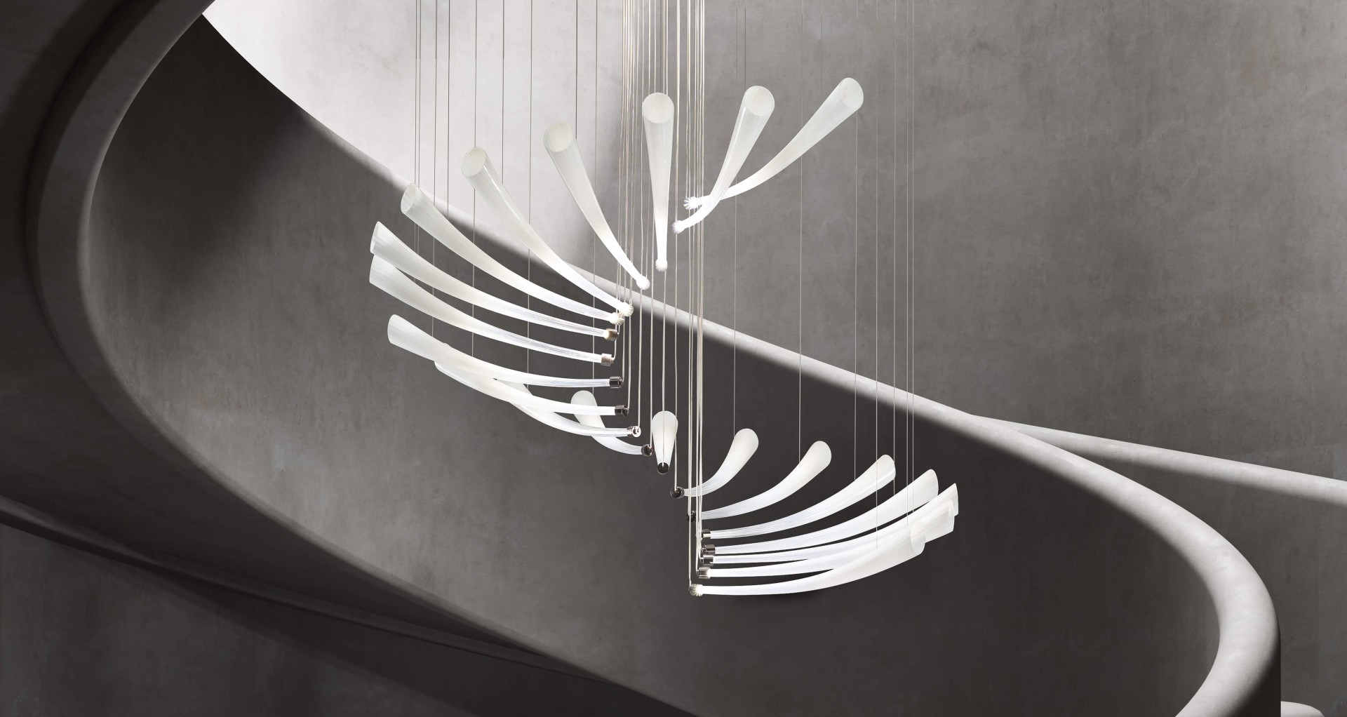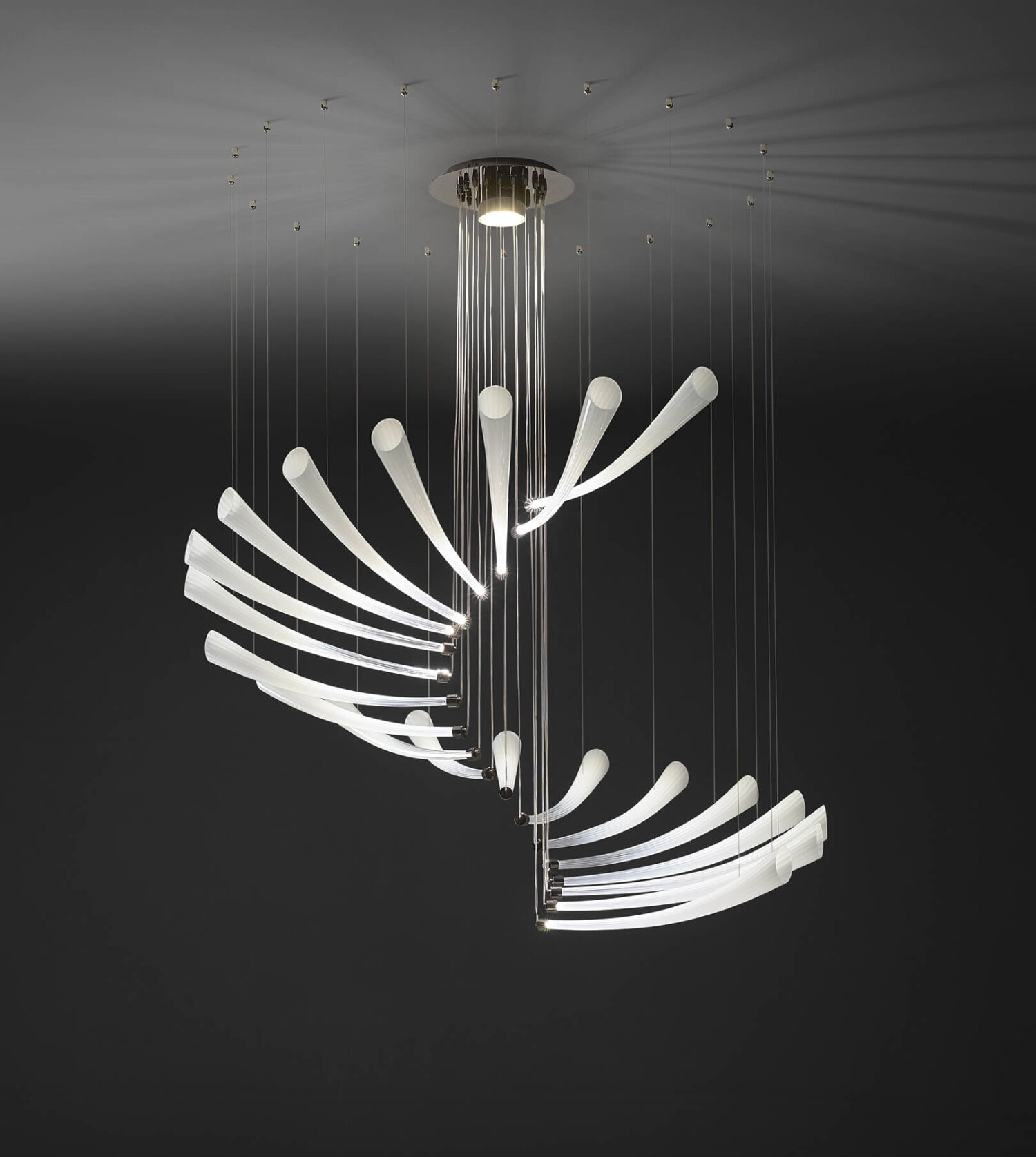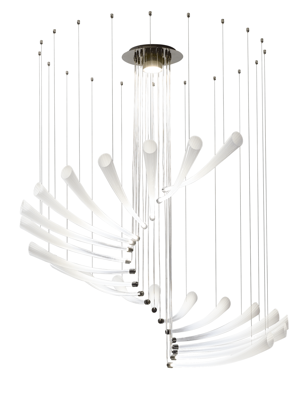 Подвесной светильник с художественным выдувным стеклом белого или голубоватого оттенка. Металлическая конструкция с покрытием стального серого цвета.