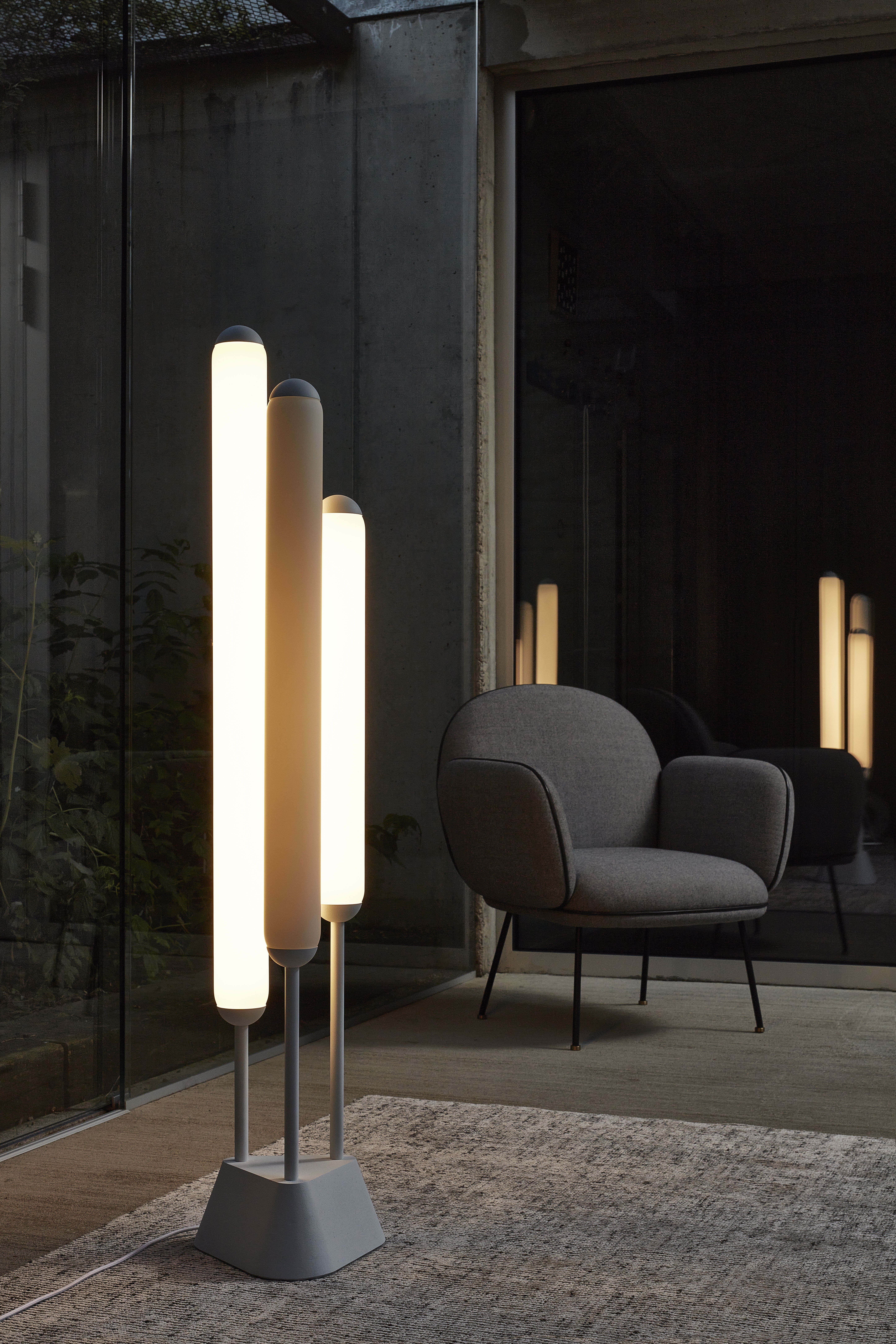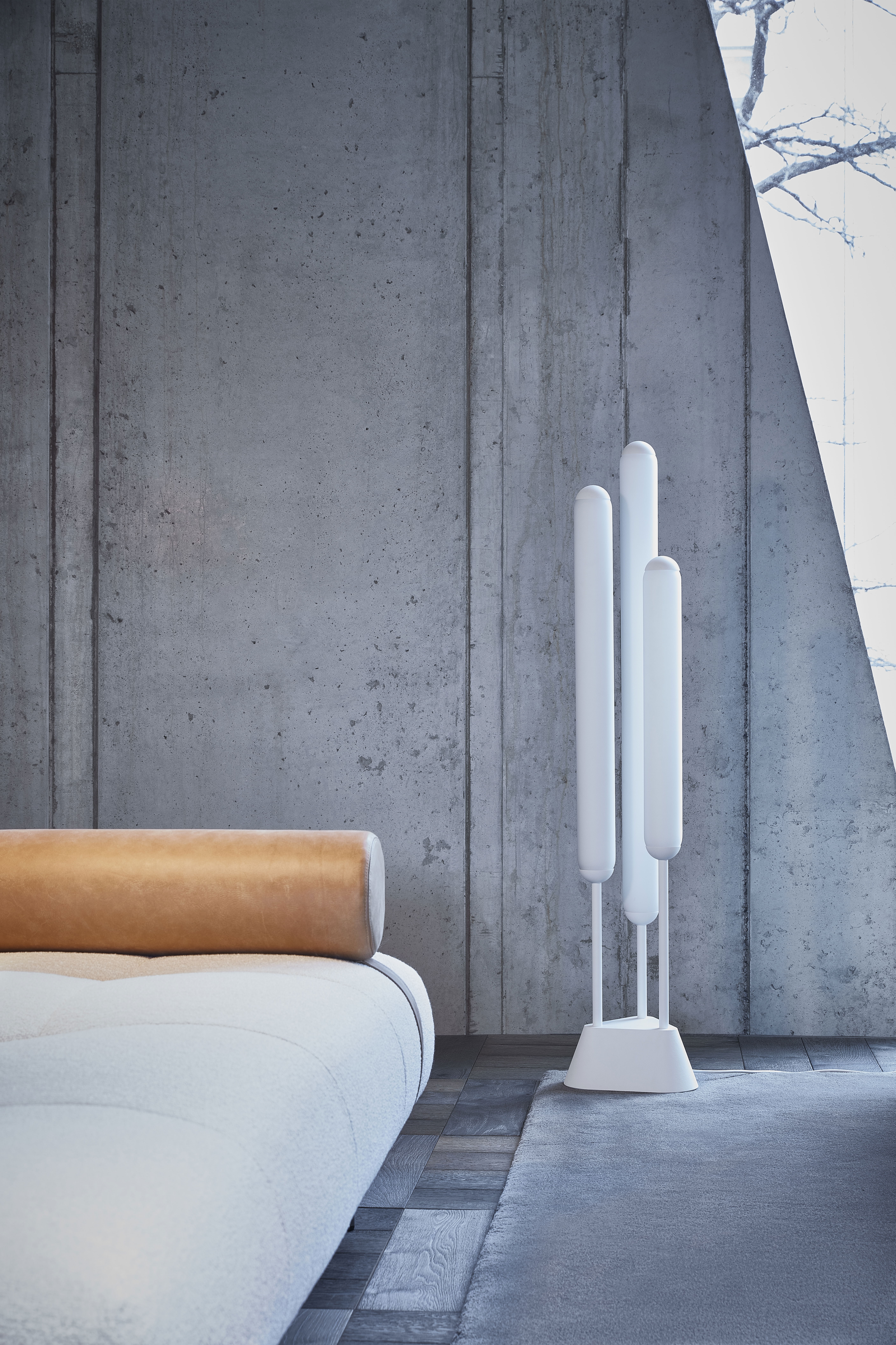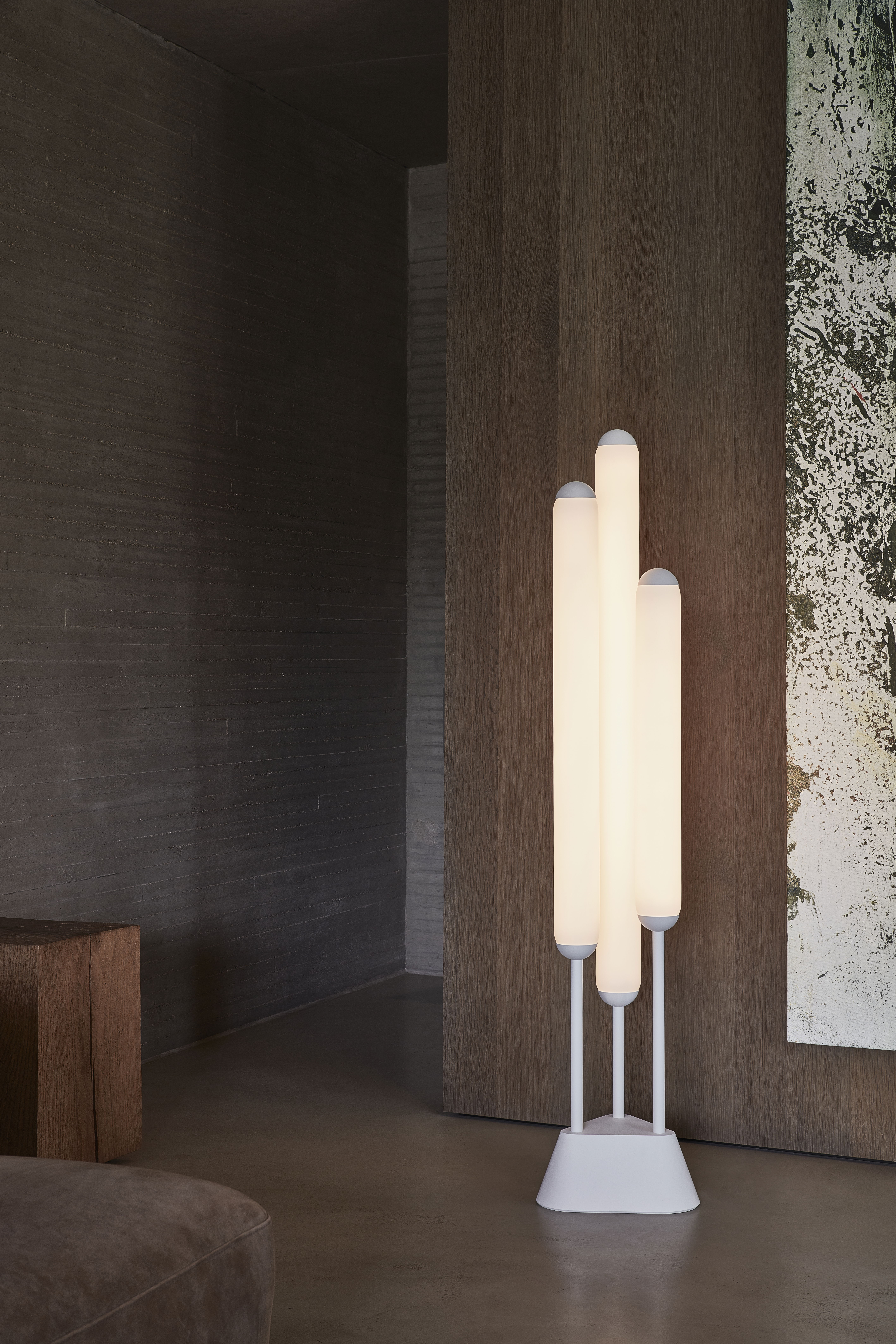 Светильник Puro Floor представлен в двух размерах с плафонами из матового опалового или дымчато-серого стекла. Световые трубки можно комбинировать в различных цветовых сочетаниях, создавая индивидуальные композиции. Мягкое рассеянное свечение наполняет пространство динамикой и уютом, а матовое покрытие добавляет лёгкий акцент выразительности.