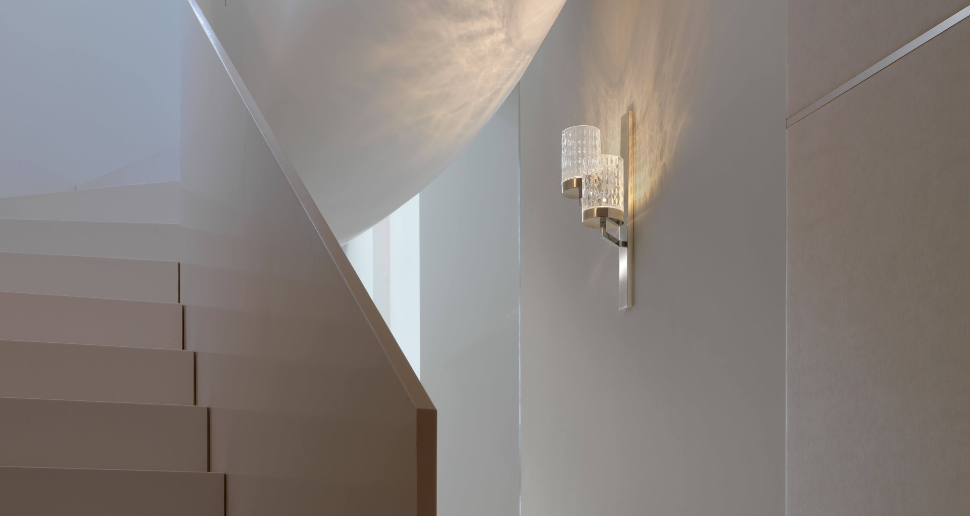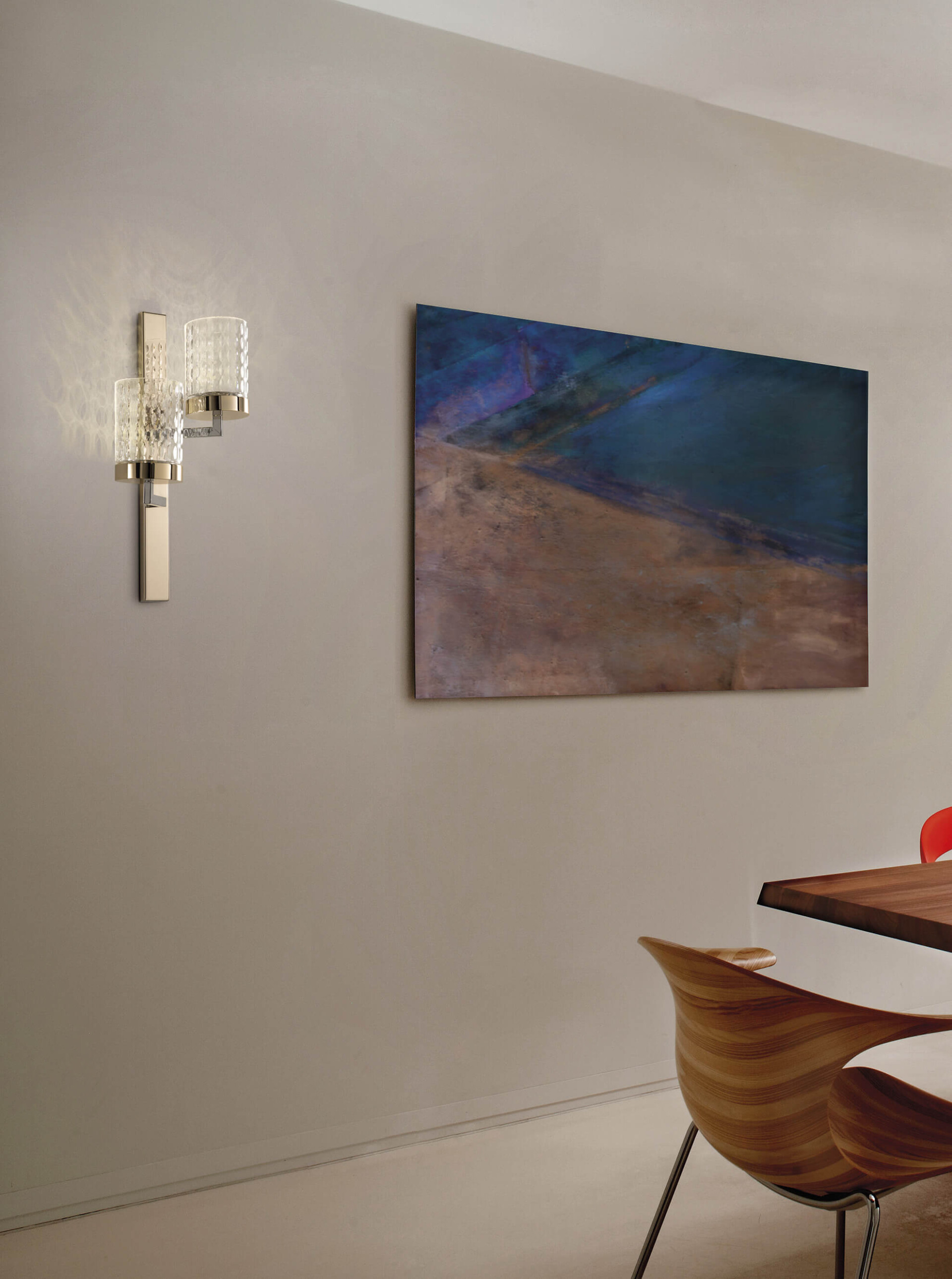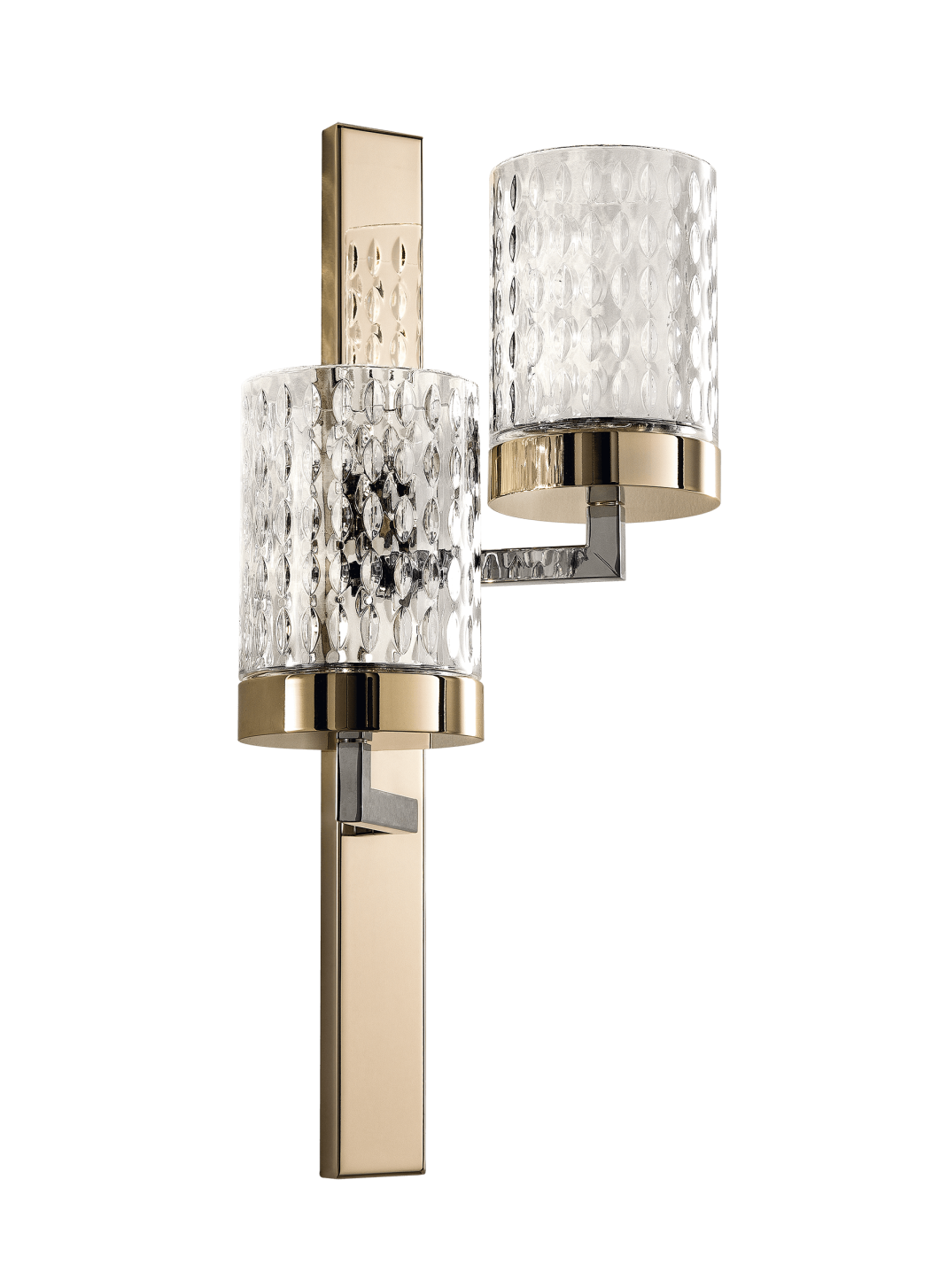Настенный светильник с металлической структурой в светло-золотом и хромированном исполнении с прозрачными хрустальными рассеивателями ручной работы.