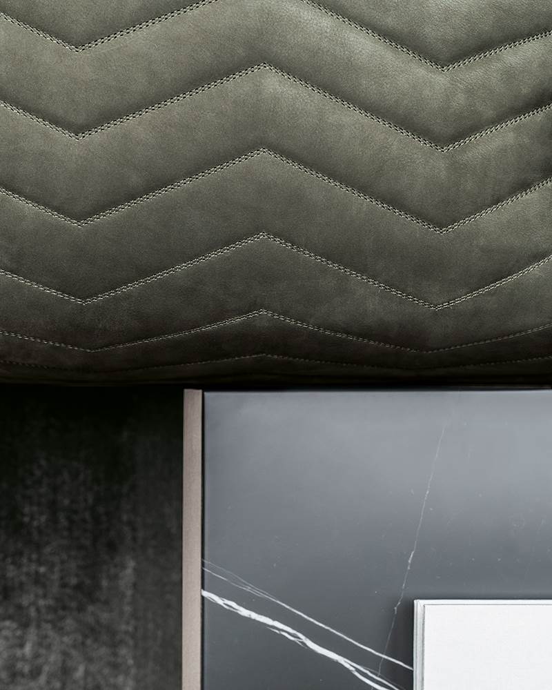 Скамья Quincy Chevron отличается чистыми геометрическими линиями и формой параллелепипеда, подчёркнутыми декоративной строчкой в виде шеврона. Этот узор, состоящий из повторяющихся «V»-образных стежков, придаёт изделию выразительный трёхмерный эффект, подчёркивая его «от кутюр» характер и мастерство исполнения.