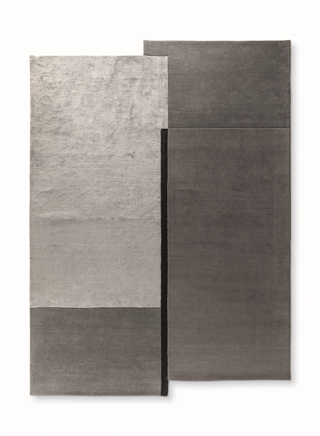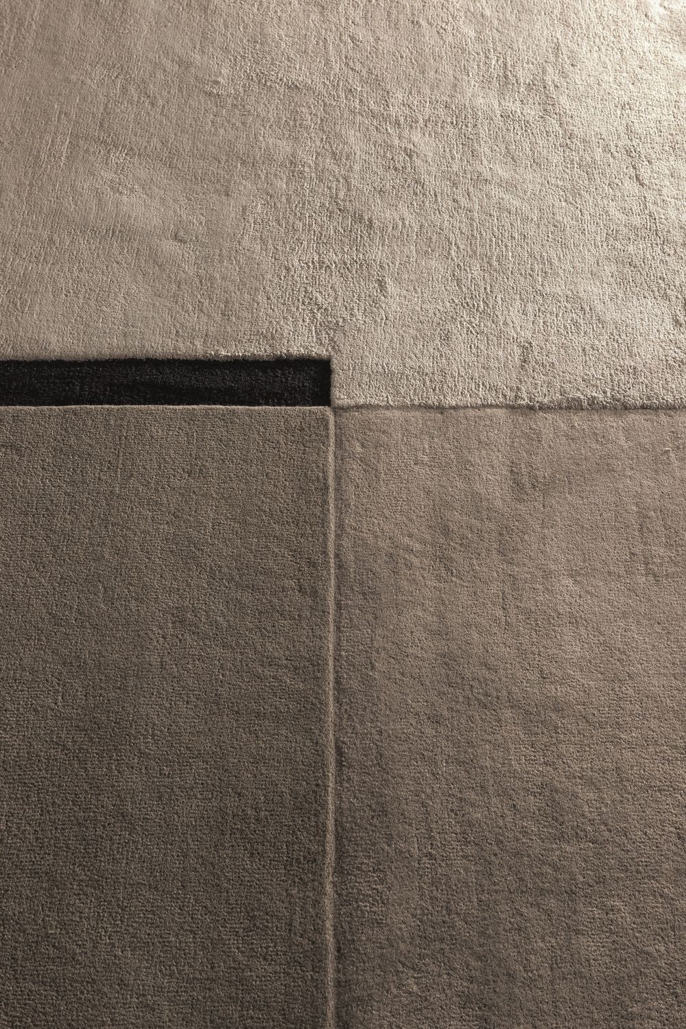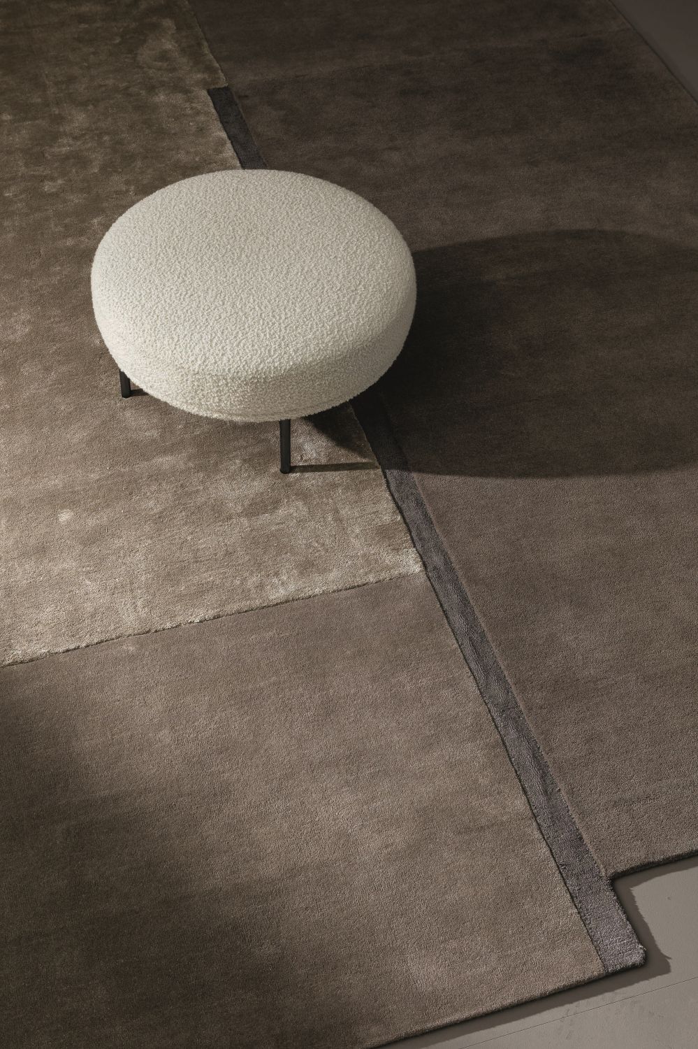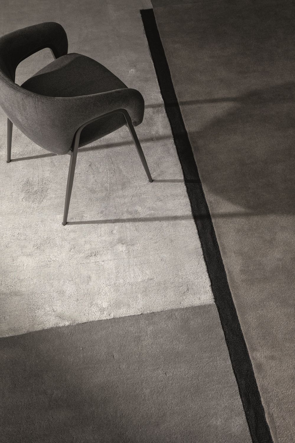Центральная тёмная линия из тенселя визуально делит ковер, добавляя графичности и напряжения. Комбинация шерсти и тенселя создаёт динамичную текстуру с тонкими перепадами высоты, подчёркивая объем и глубину рисунка.