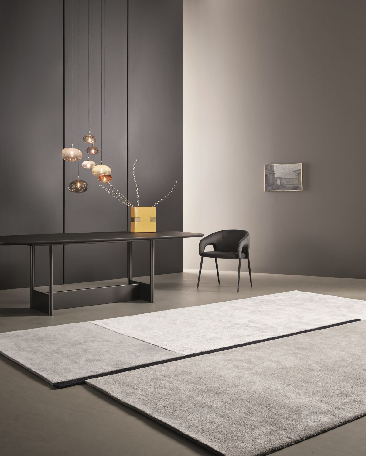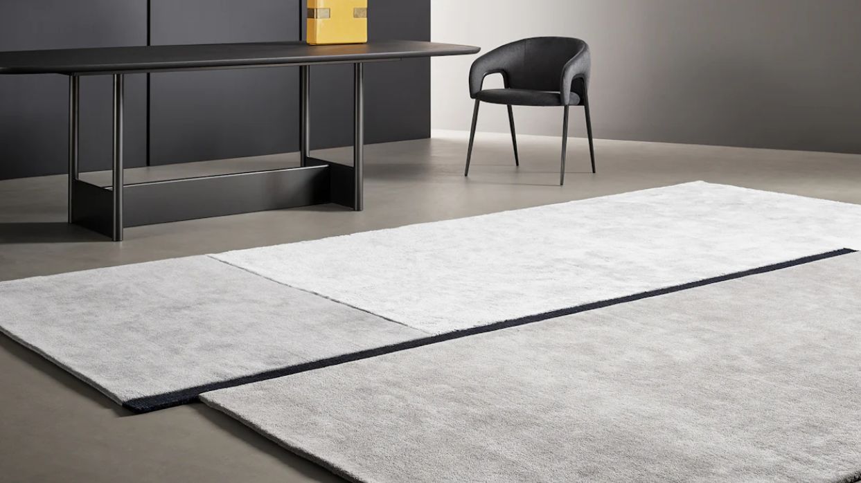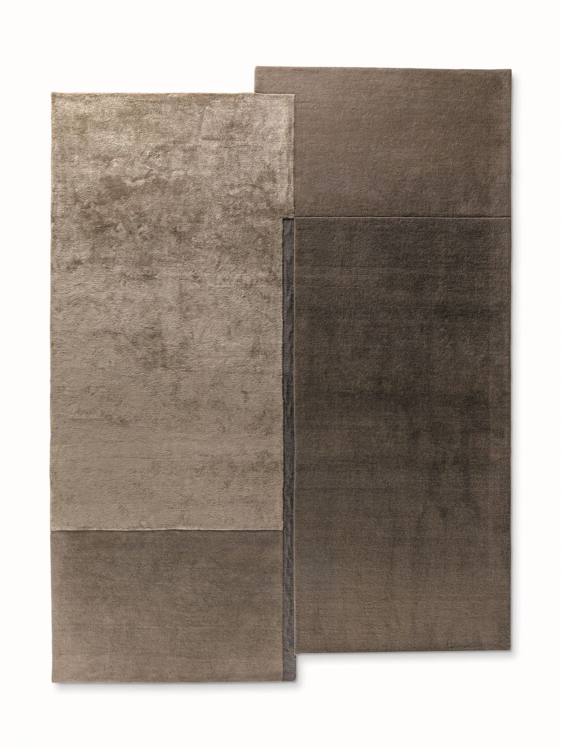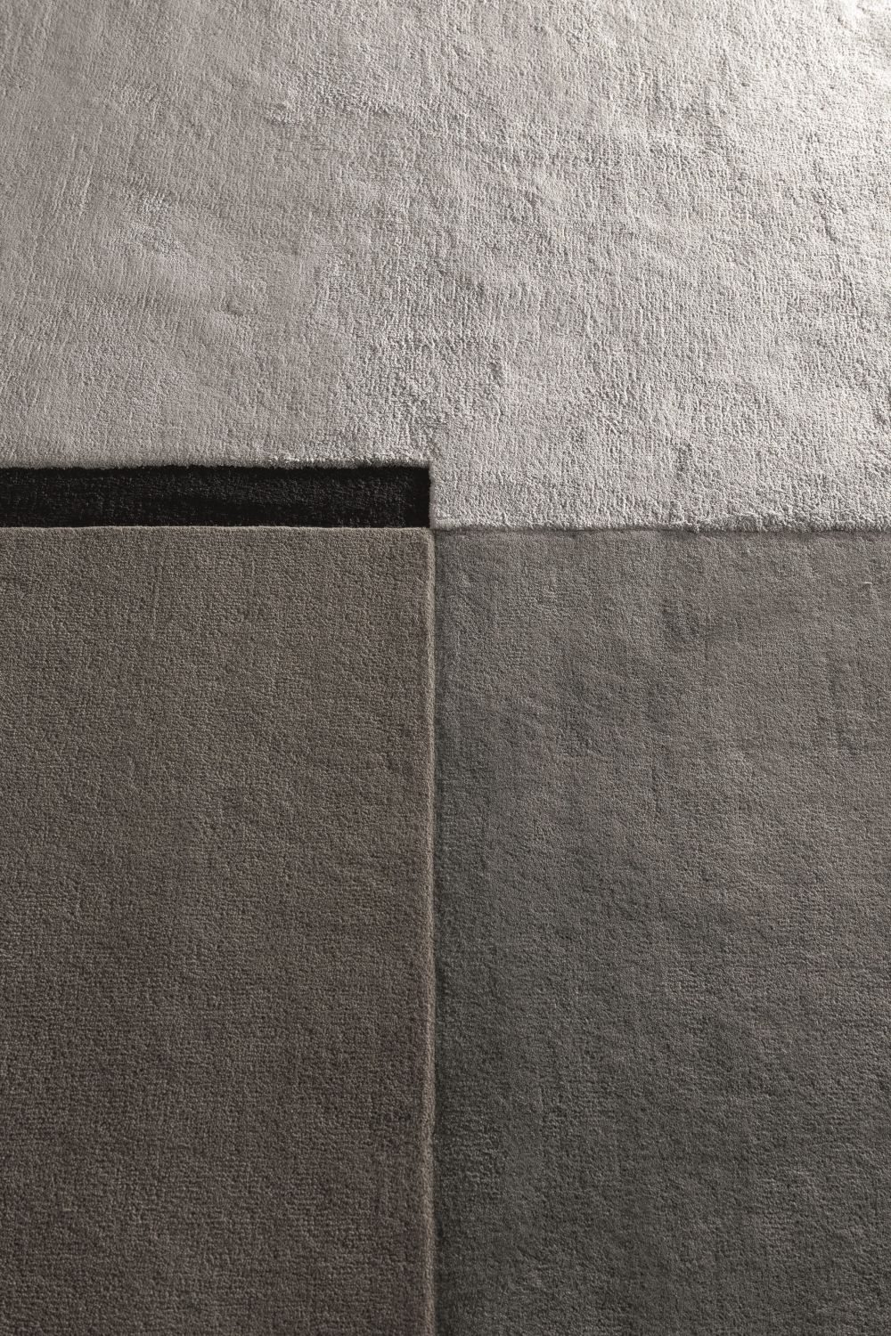 Центральная тёмная линия из тенселя визуально делит ковер, добавляя графичности и напряжения. Комбинация шерсти и тенселя создаёт динамичную текстуру с тонкими перепадами высоты, подчёркивая объем и глубину рисунка.