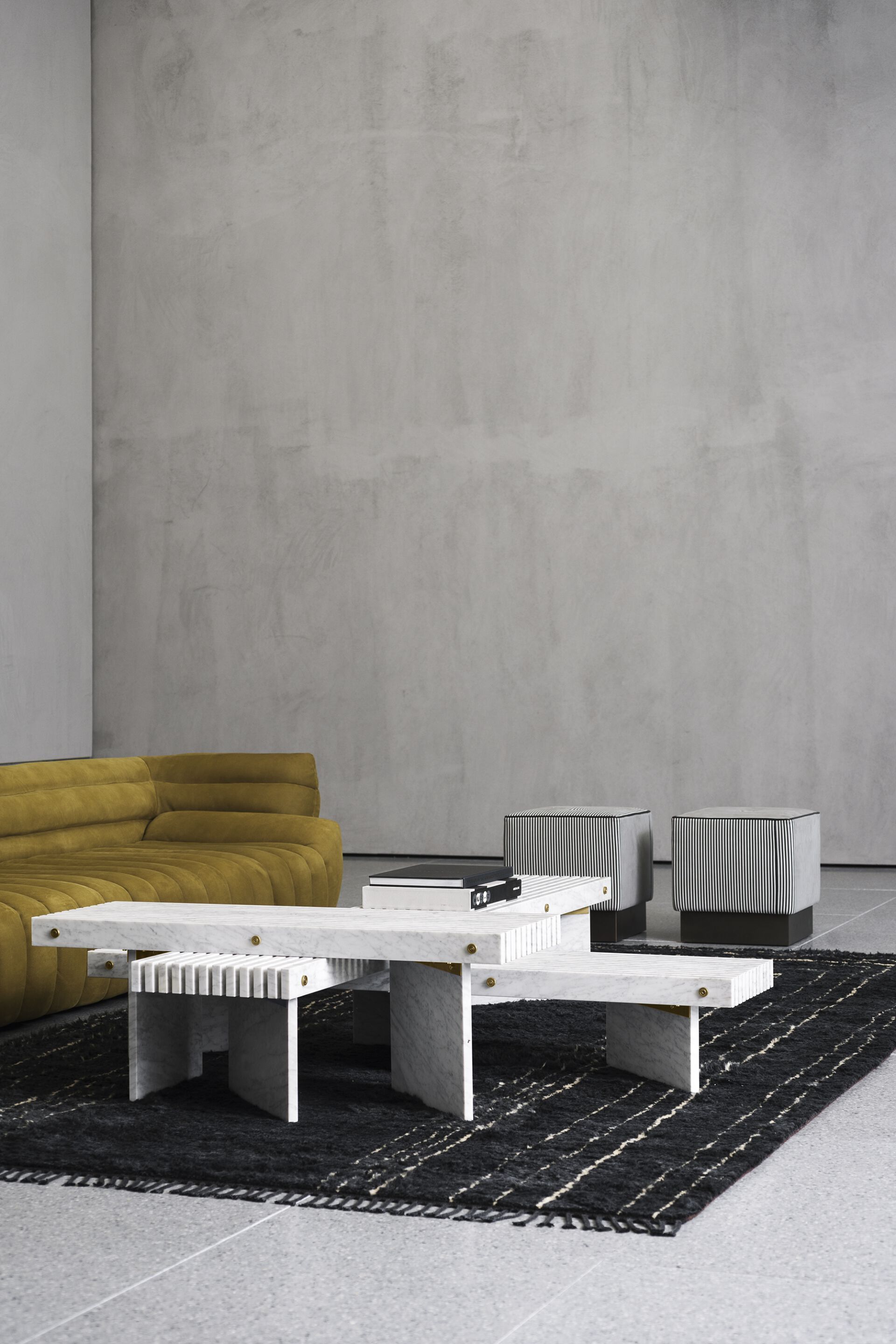 Небольшой столик, разработанный Федерико Перри. Ножки из мрамора с водоотталкивающим защитным маслом или из темного серо-угольного тонированного ясеня, соединенные с верхом с помощью сатинированных латунных соединений. Столешница из мрамора толщиной 2 см или из полос темного серо-угольного тонированного ясеня, высотой 6 см, соединенных латунными перекладинами. Доступен в матовом мраморе Bianco Gioia с водоотталкивающим защитным покрытием или темном серо-угольном тонированном ясеня, в зависимости от размера. Любые дефекты на поверхности, связанные с естественностью камня, могут быть заполены смолой и не считаются дефектами. Блоки и плиты могут отличаться, так как это натуральные камни; все изображения являются ориентировочными.