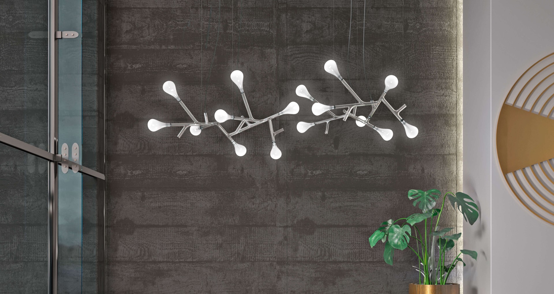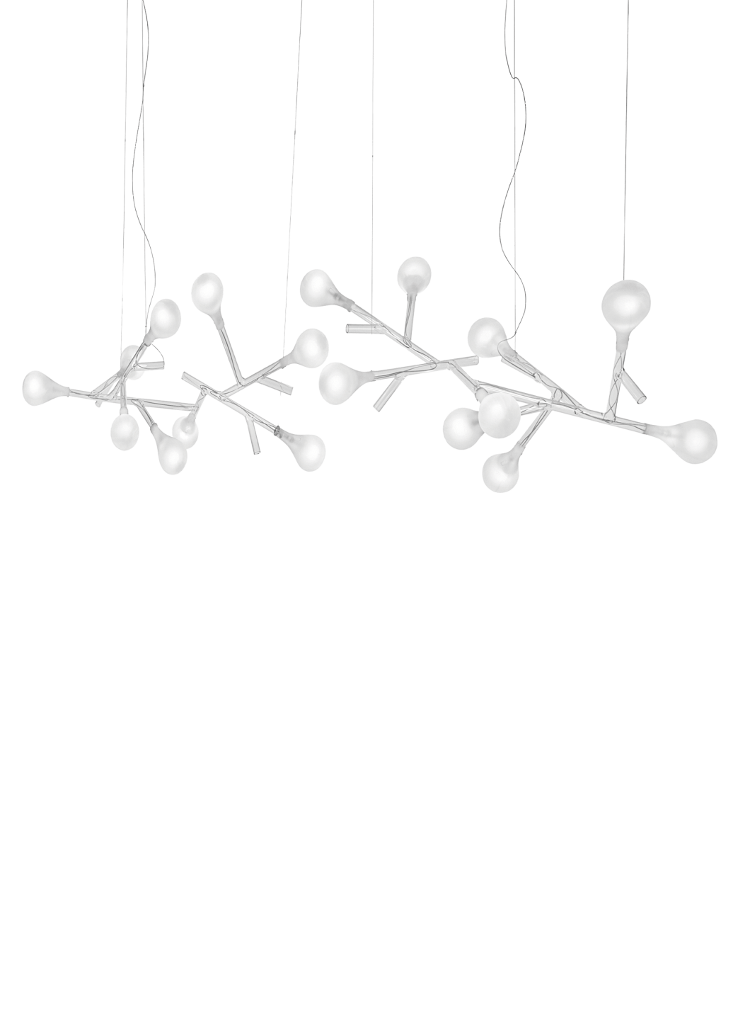 Подвесной светильник с ветвевидной структурой, прозрачными стеклянными трубками и белыми сатинированными рассеивателями. Металлические детали с хромированной отделкой.