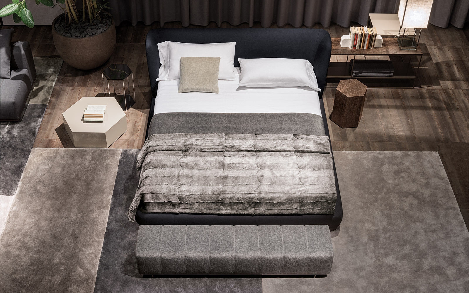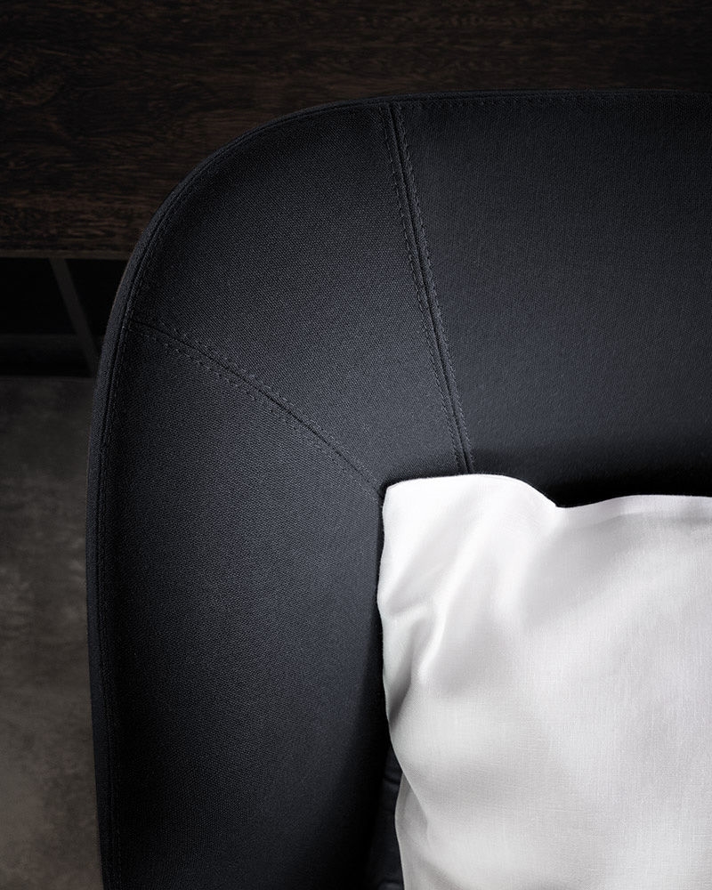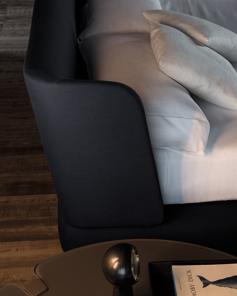 Reeves Bed — элегантная модель с эффектом «кресельного» изголовья. Спинка изогнута и визуально делит кровать на зону отдыха и сна. Мягкая обивка с выразительной отстрочкой придаёт теплоту. Основание — из лакированного металла, визуально облегчает конструкцию.