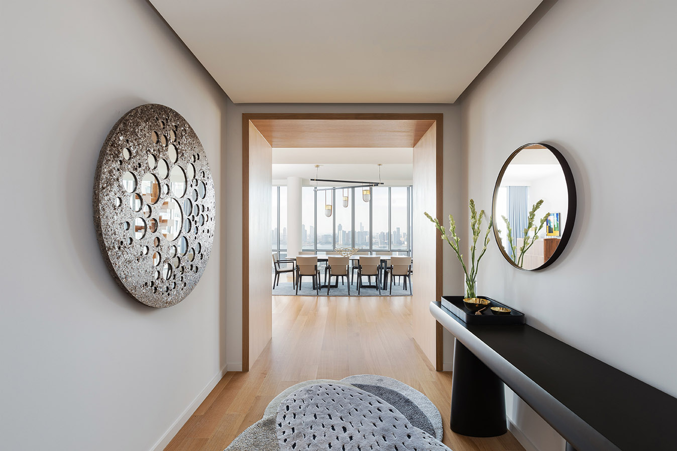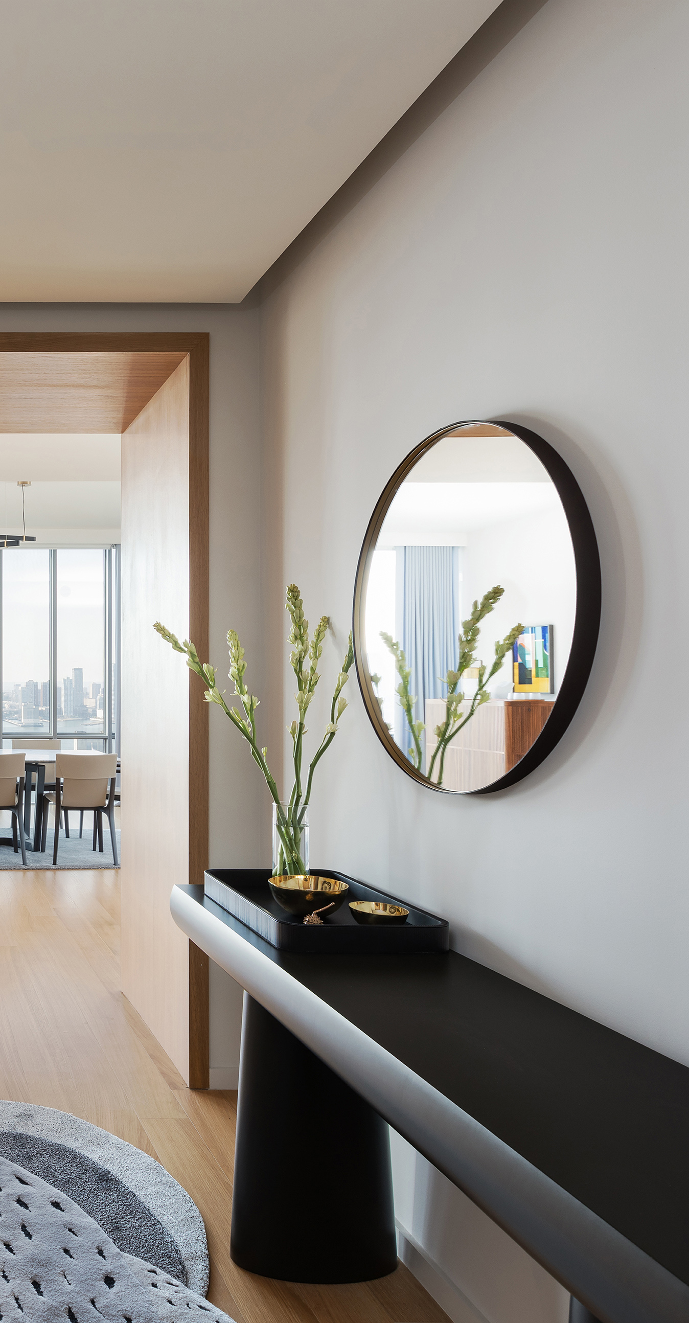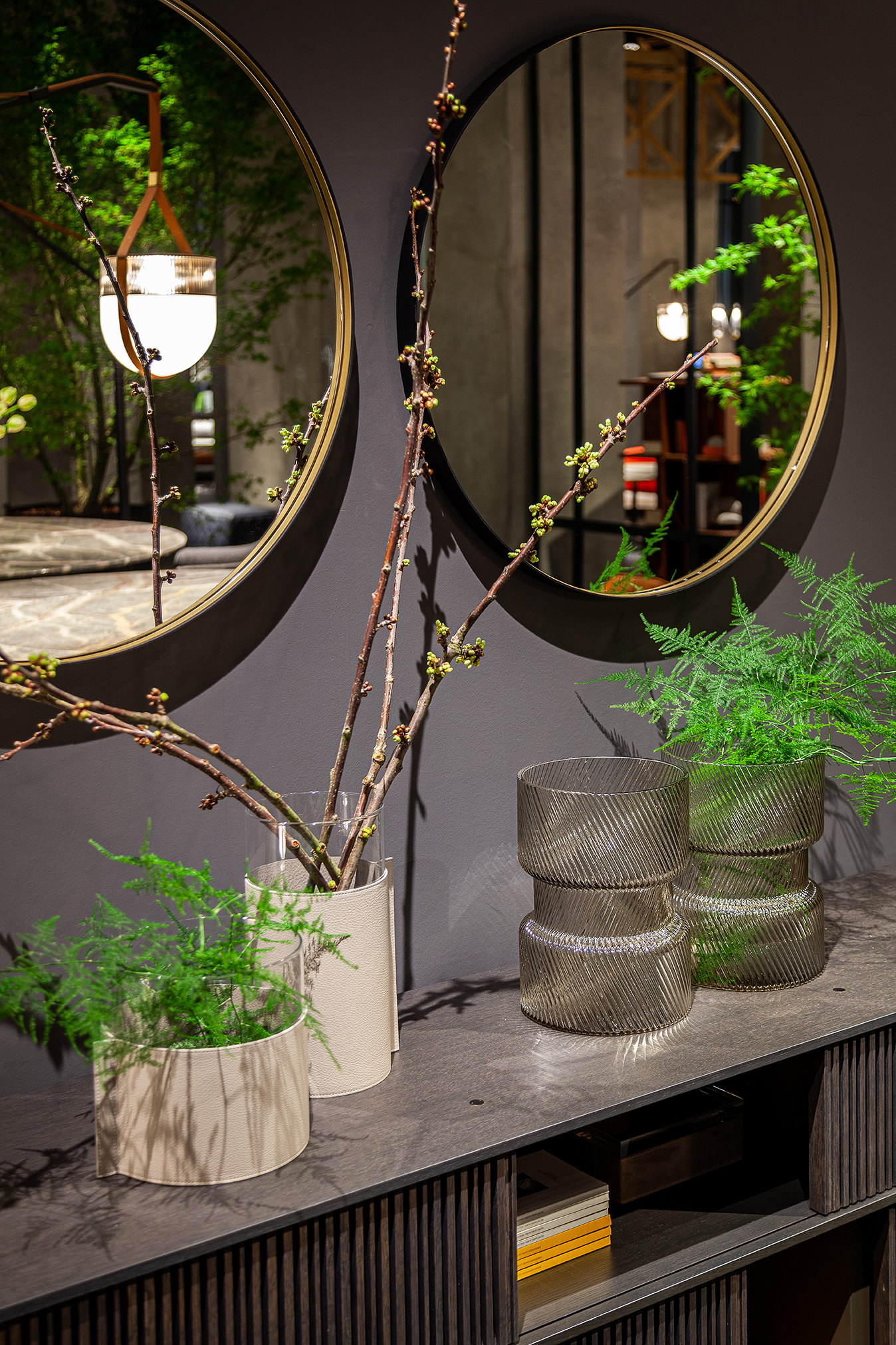 Разработанные для того, чтобы дополнить дом сдержанным и комфортным стилем, зеркала Ren доступны в версиях Round mirror (Ø 430 мм) или Oval mirror (280 x 1200 мм), также по отдельности, и в версии для стола (Ø 310 мм). Они имеют латунную раму, обтянутую кожей Saddle Extra, а задняя часть выполнена из березовой фанеры со шпоном ореха Canaletto. Настольное зеркало состоит из круглого зеркала, закрепленного на несущей конструкции с помощью крючка из матовой стали с латунной отделкой. Отдельно стоящее зеркало-вешалка для одежды состоит из овального зеркала, низкой полки и двух крючков для одежды. Настенное зеркало-вешалка для одежды состоит из перекладины из ореха Canaletto, к которой прикреплены круглое зеркало, круглая полка для ключей и два крючка для одежды (система настенного крепления не входит в комплект). Туалетный столик состоит из круглого зеркала, овальной полки для ключей и столешницы со вторым встроенным отделением с откидной столешницей из кожи Saddle Extra и кольцевой латунной ручкой. Дно отделения обито вставкой из седельной кожи.