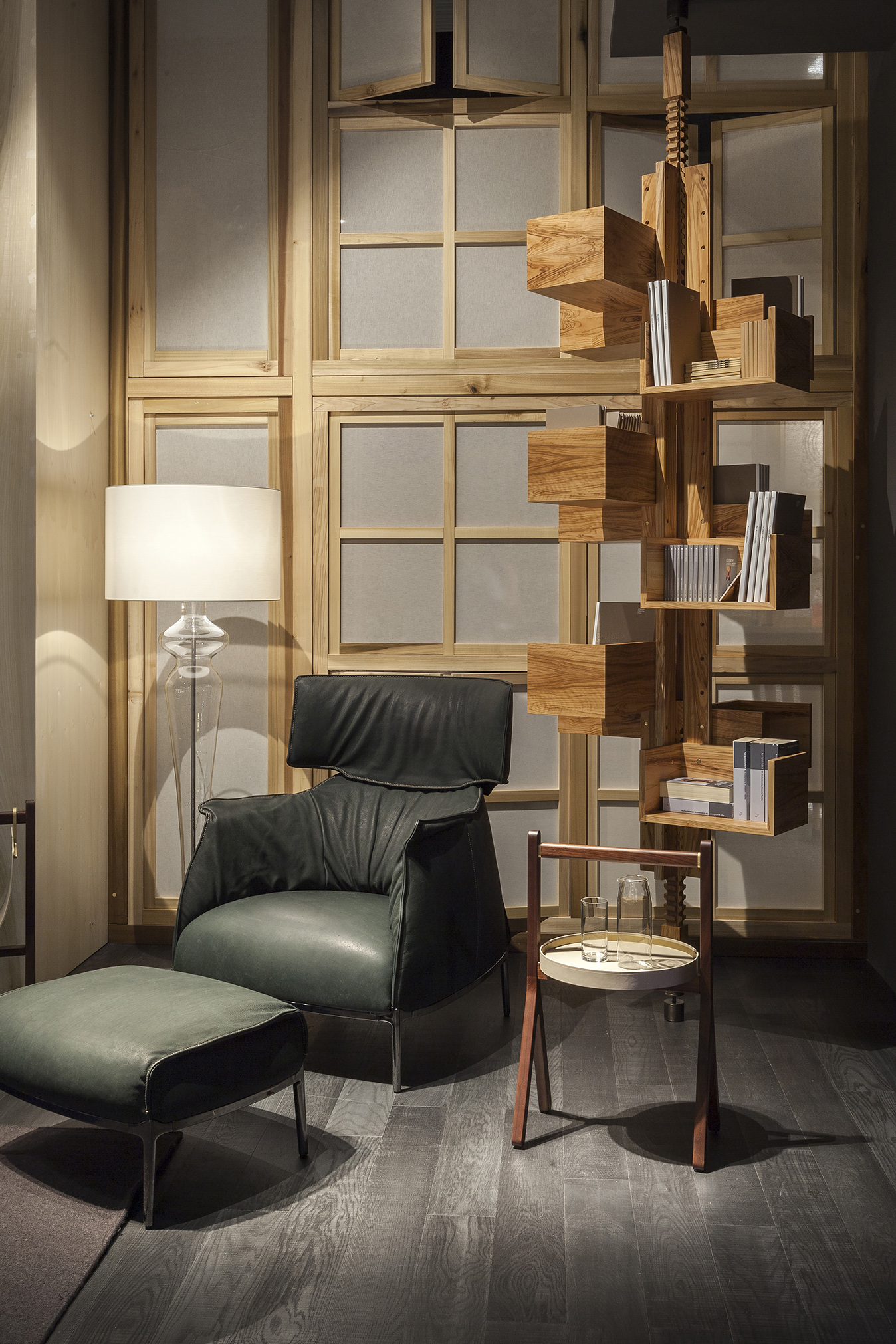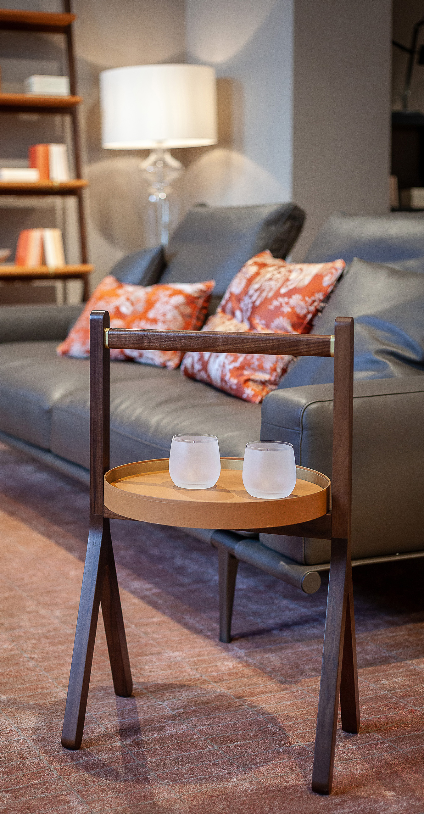 Приставной столик Ren представляет собой подносной столик с основанием из берёзовой фанеры, отделанной шпоном ореха Canaletto, и изогнутой рамой из латуни с кожаной обивкой. Основание обито ковриком из кожи Saddle Extra.