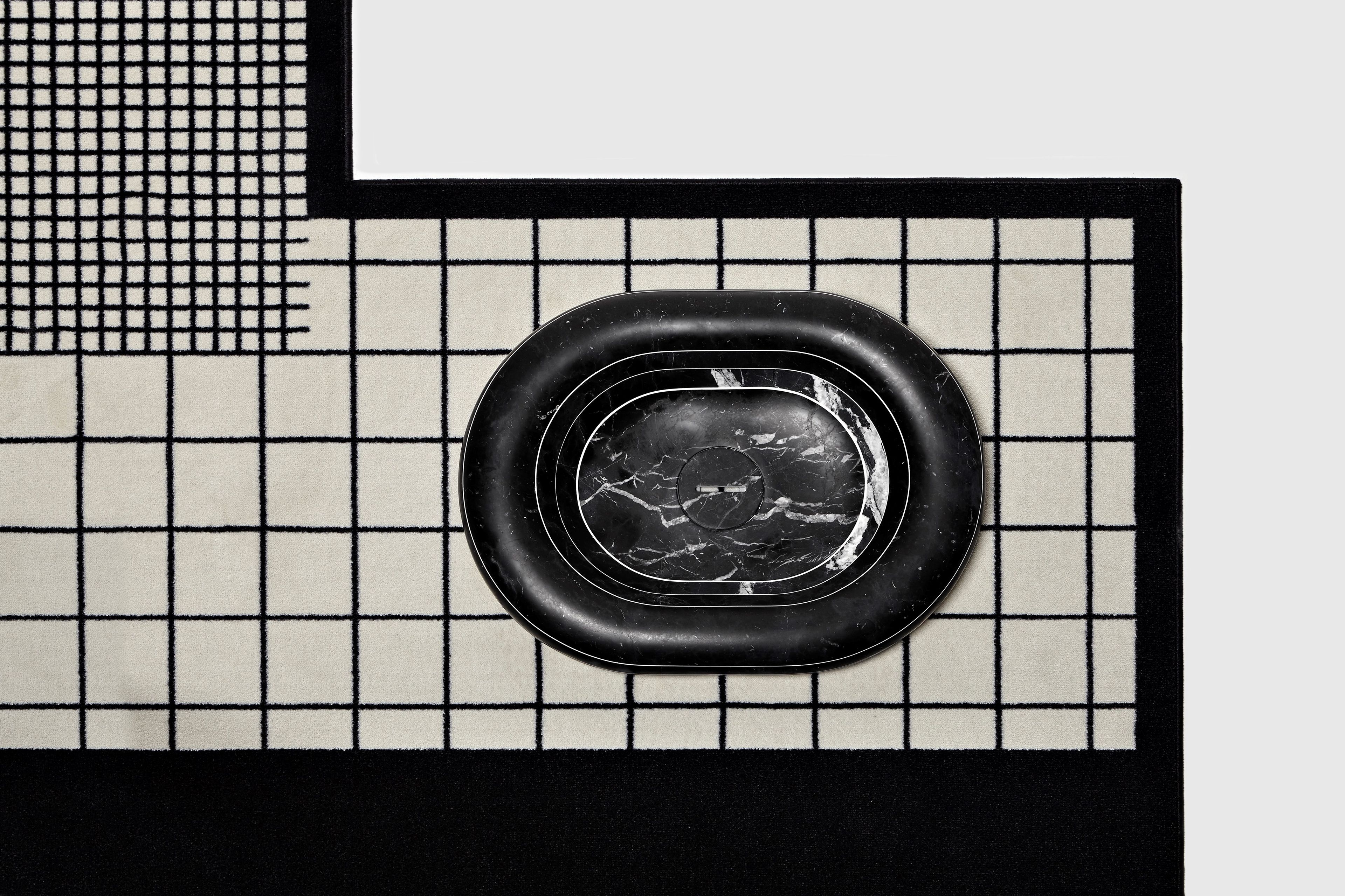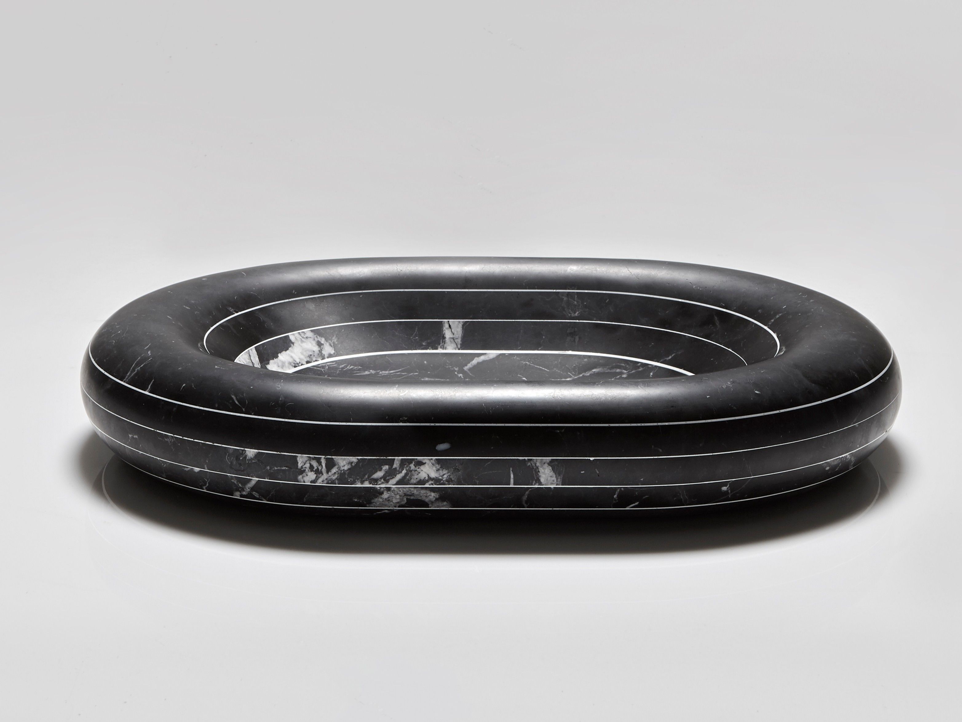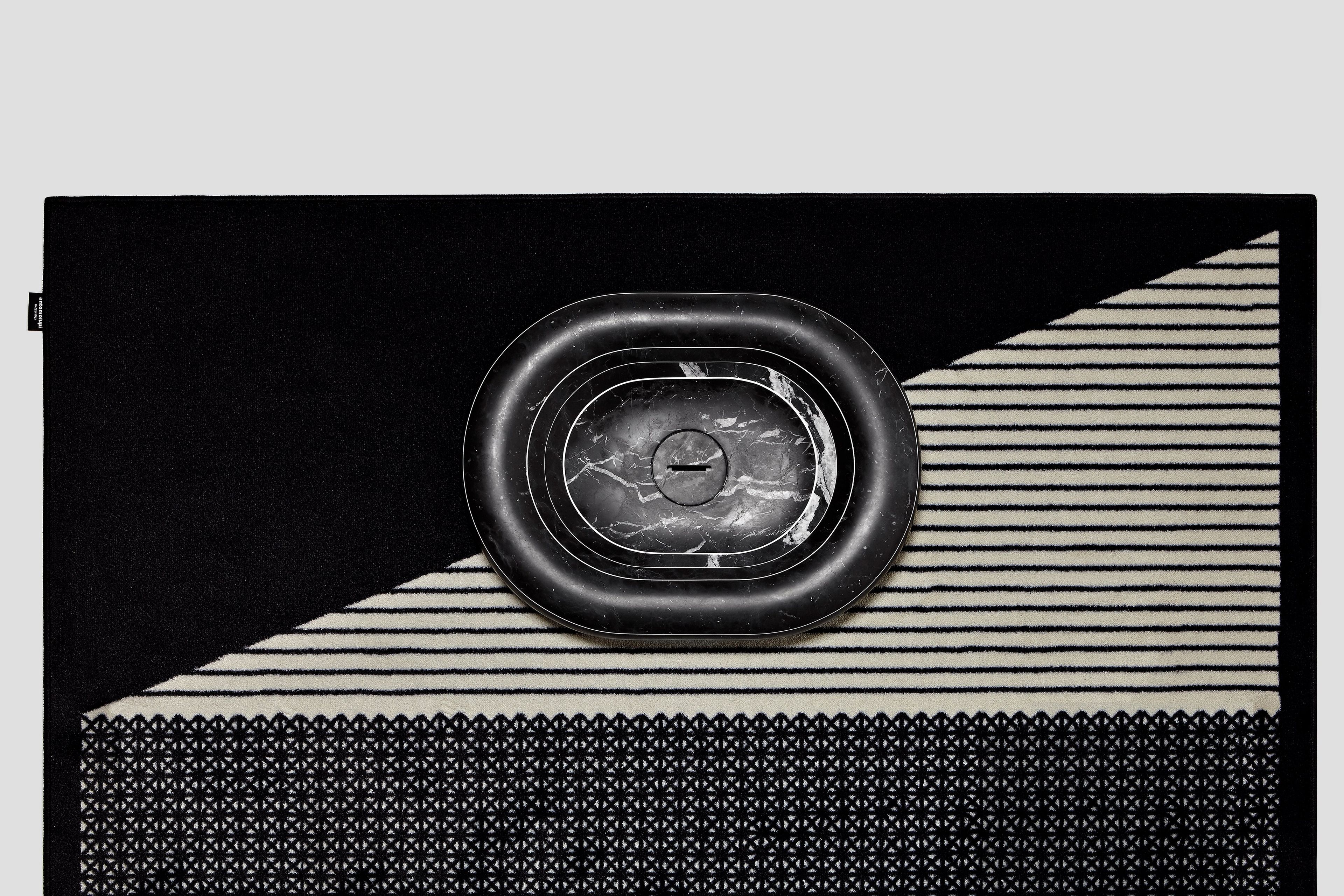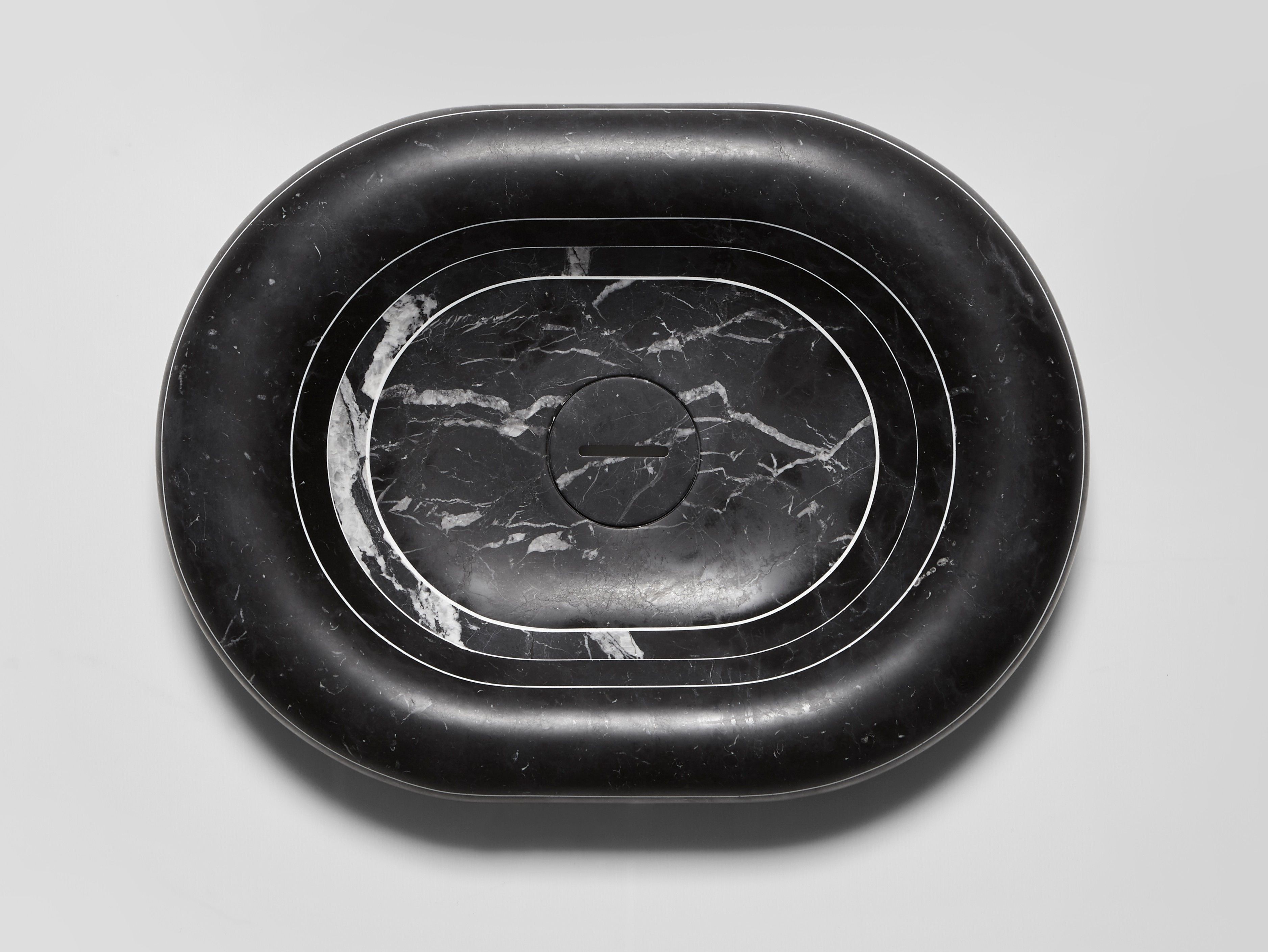 Эти каменные раковины словно выточены из монолита, однако в их основе — инновационная технология многослойной сборки. Пластины мрамора толщиной 1–2 см (белый каррарский мрамор или черный мрамор Marquinia) склеиваются вручную с использованием контрастной эпоксидной смолы. Этот процесс создает характерную полосатую структуру, в которой каждый изгиб и прожилка мрамора становятся частью архитектурного узора.