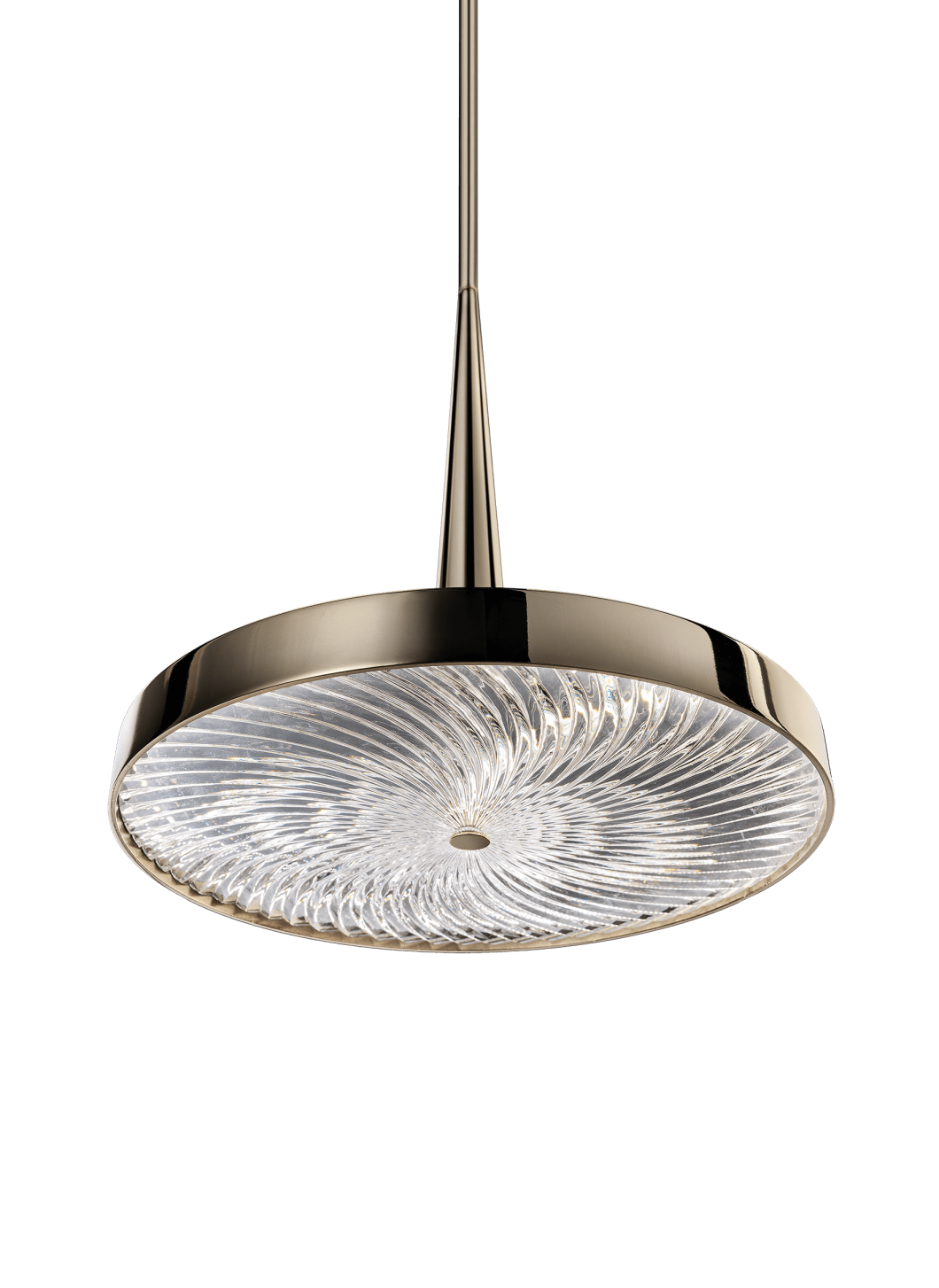 Подвесной светильник из металла со светло-золотой отделкой и резным хрустальным рассеивателем.