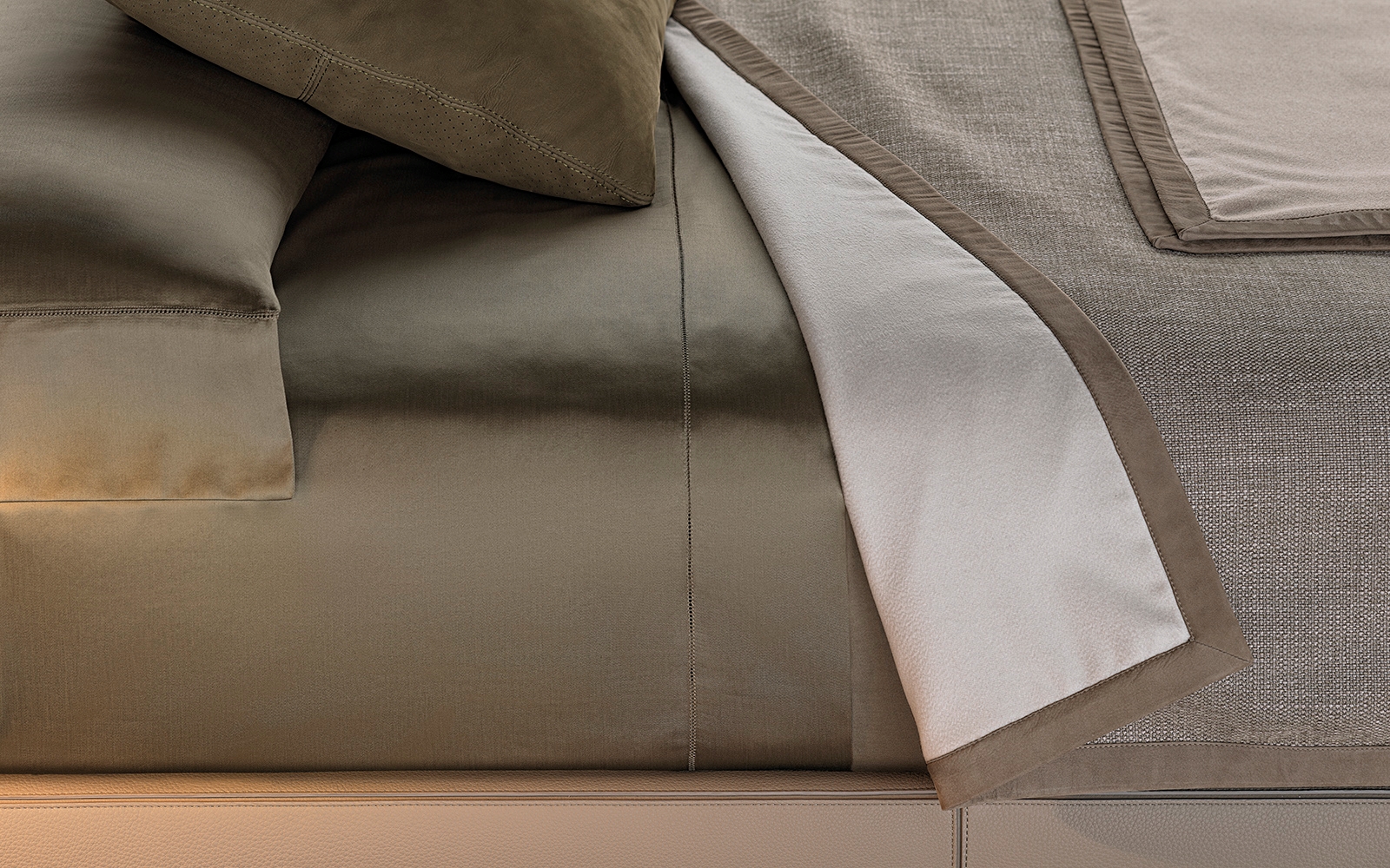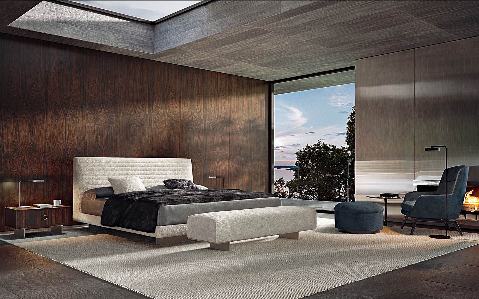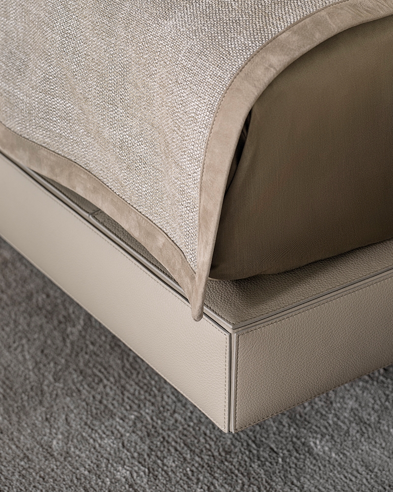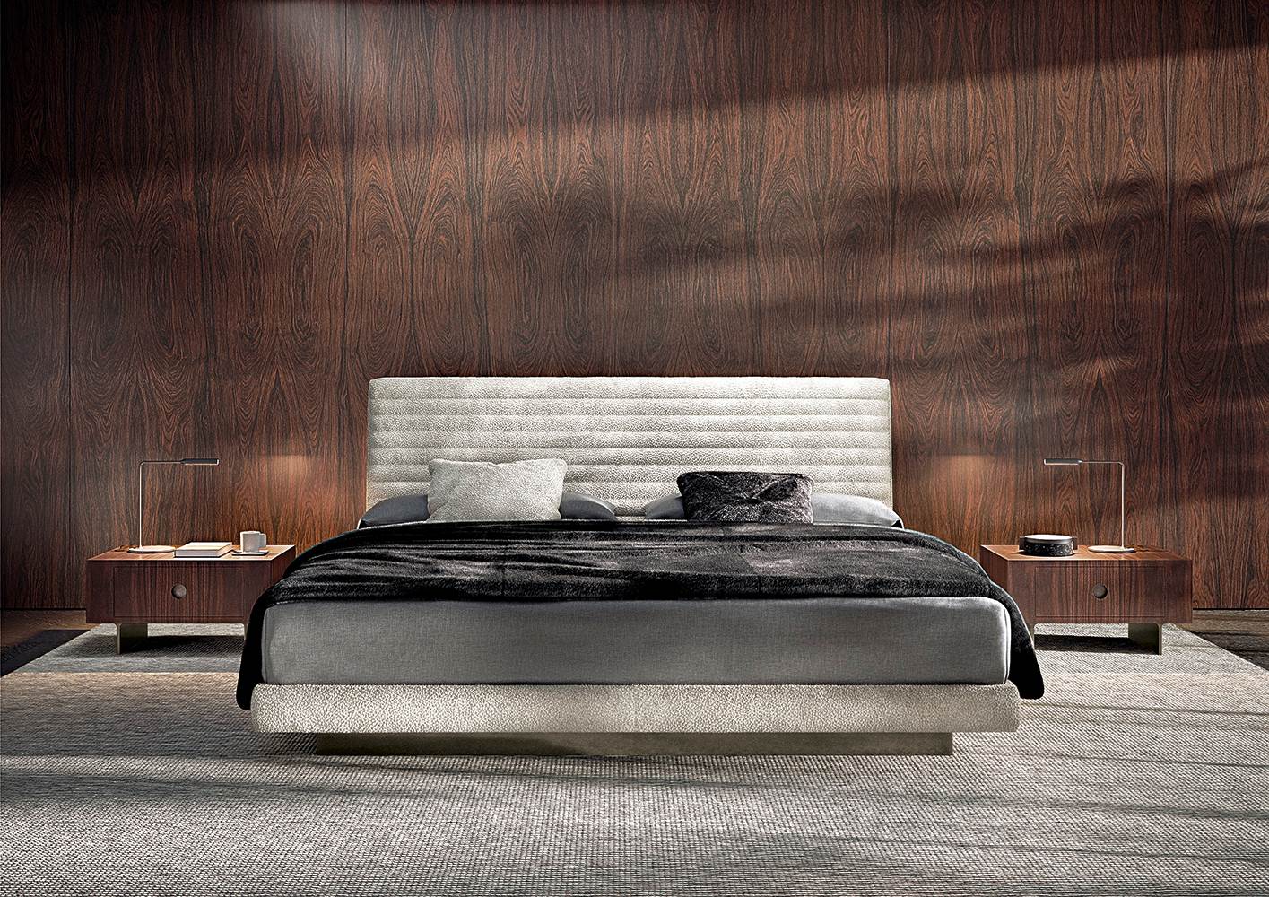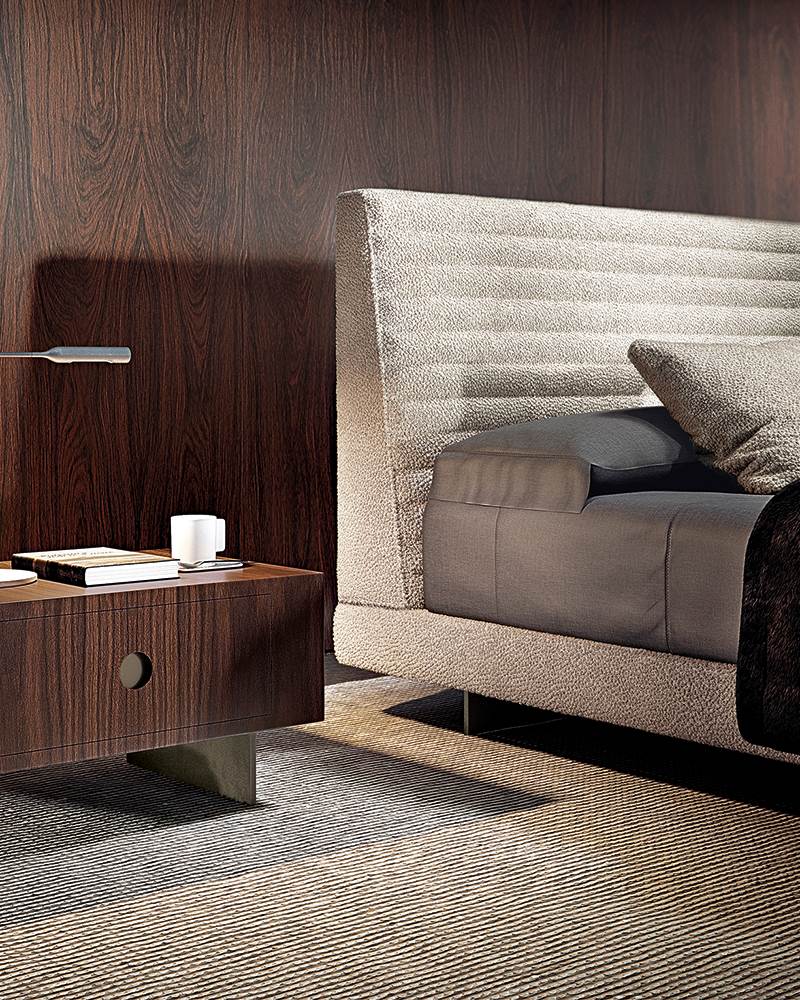 Roger Bed — универсальная модульная кровать с минималистичной эстетикой. Изголовье может быть цельным или состоять из мягких секций. Варианты обивки включают премиальный текстиль и кожу. Каркас из дерева и металла, возможны встроенные тумбы или полки. Подходит как для частных интерьеров, так и для отельных пространств.