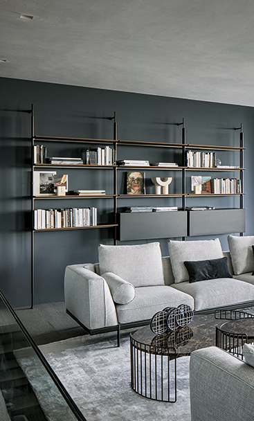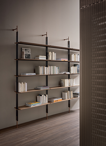 Книжный шкаф Roll — это универсальное решение, сочетающее в себе функциональность и изысканный дизайн. Благодаря возможности крепления как к потолку, так и к стене, его можно установить в центре помещения, создавая стильную и практичную перегородку для зонирования пространства. Основу конструкции составляют стойки из металлических труб с отделкой piombo, которые обеспечивают надёжность и визуальную лёгкость. Полки и выступающие элементы могут быть выполнены в тон стойкам или в контрастных отделках — это позволяет подчеркнуть индивидуальный стиль и добавить композиции выразительности.Благодаря модульному принципу, Roll легко адаптируется под размеры конкретного пространства, будь то домашний интерьер или офисное помещение.