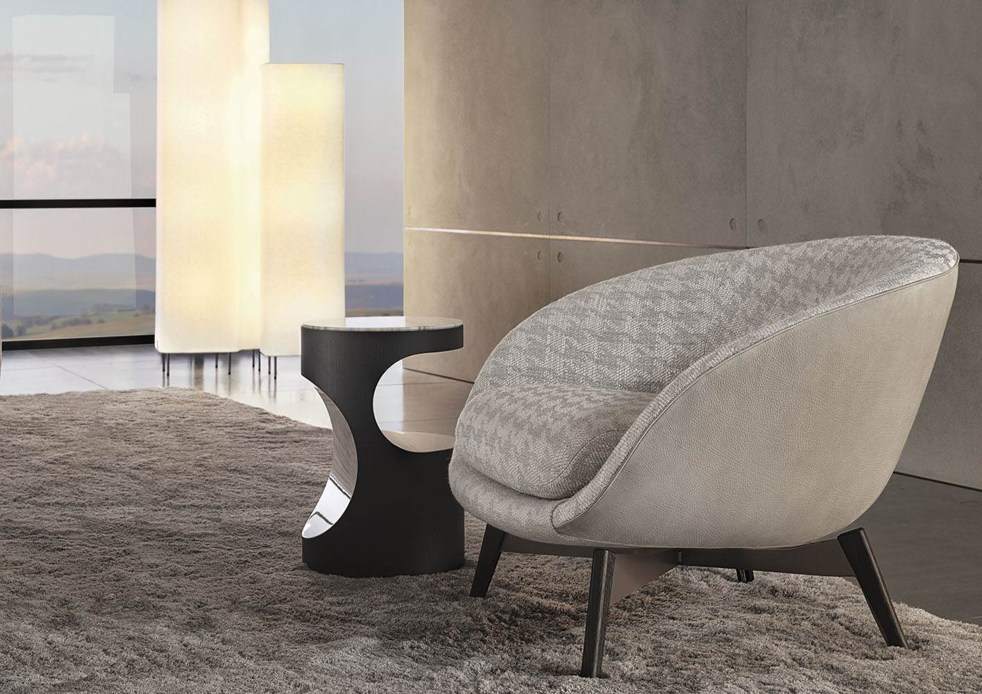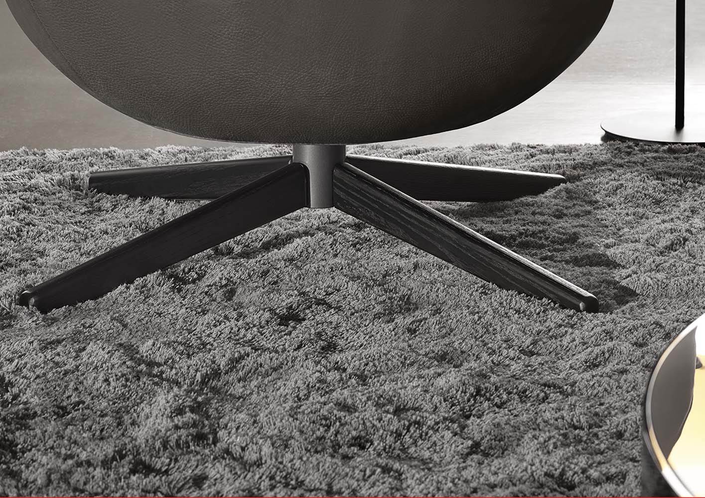 Материалы: каркас — дерево и металл; наполнение — полиуретан и гусиный пух; обивка — кожа или ткань Minotti; основание — поворотное, металлическое, с отделкой Bronze или Black-Nickel
