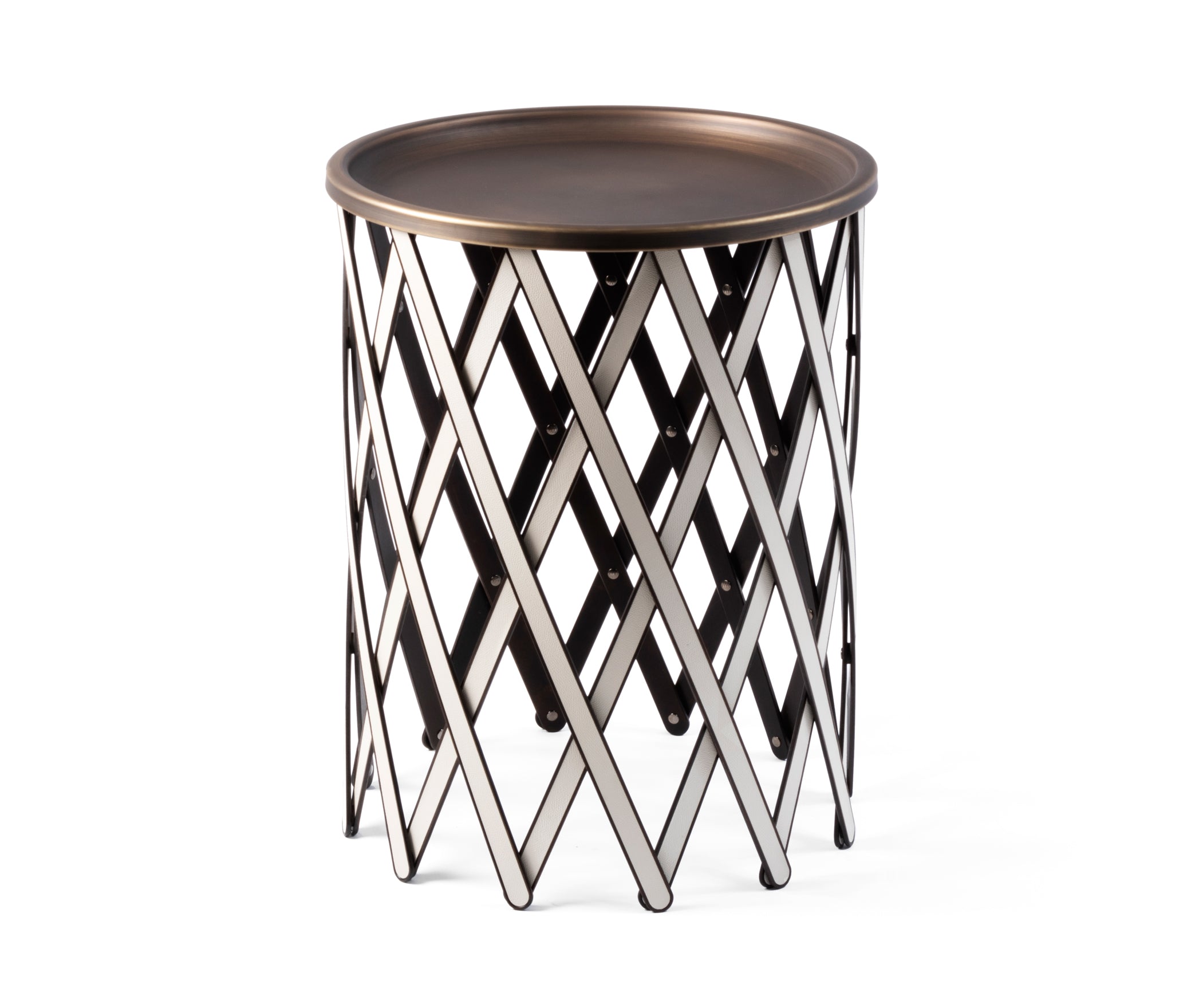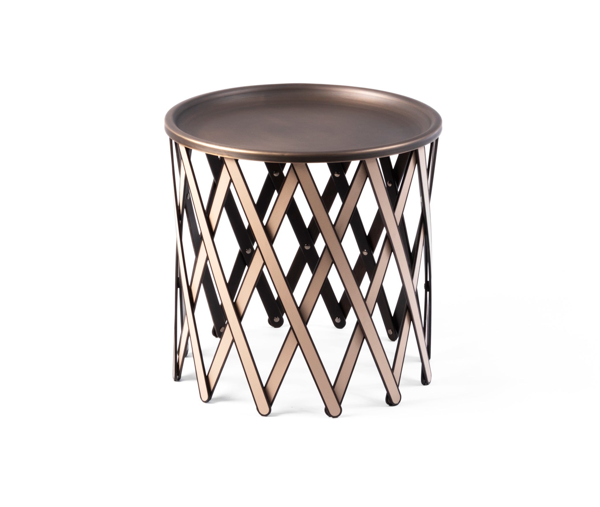 Съёмная бронзированная поверхность установлена на складной конструкции из дерева и кожи. Благодаря своему оригинальному дизайну складной стол Safari доступен в четырёх разных размерах и является отличным примером сочетания современного стиля и практичности — как для использования в помещении, так и на открытом воздухе.