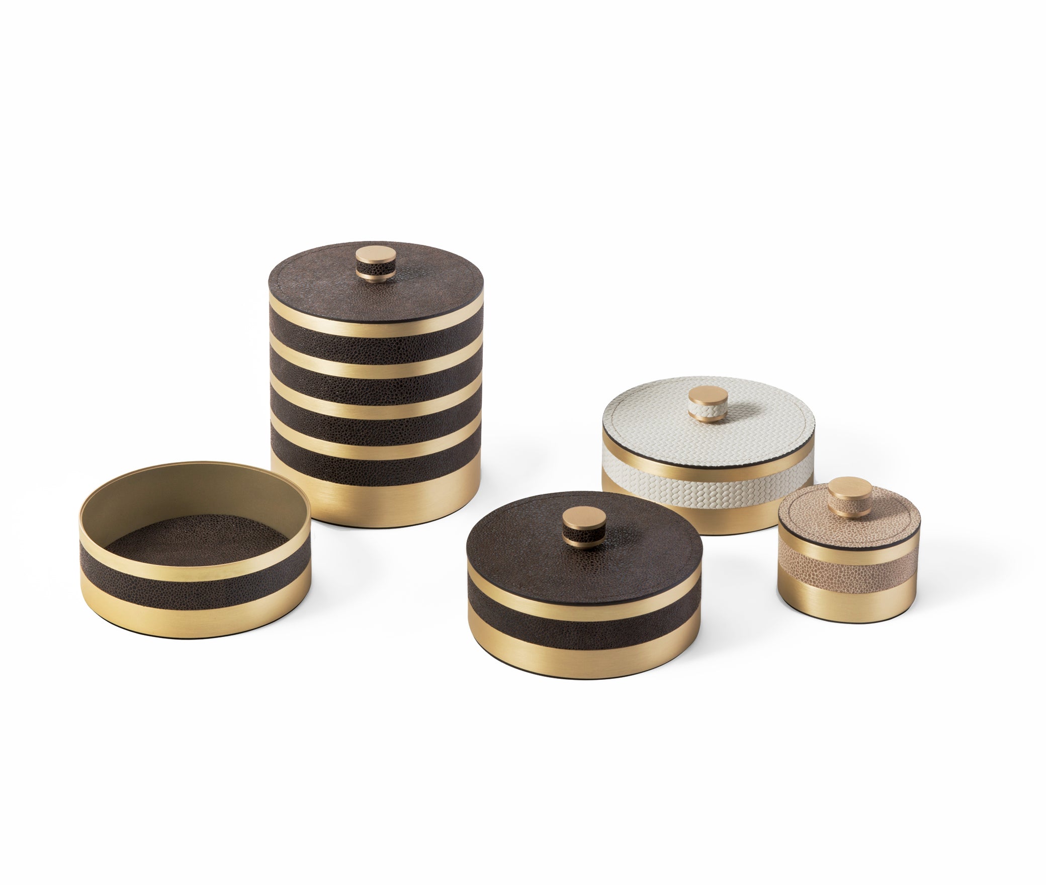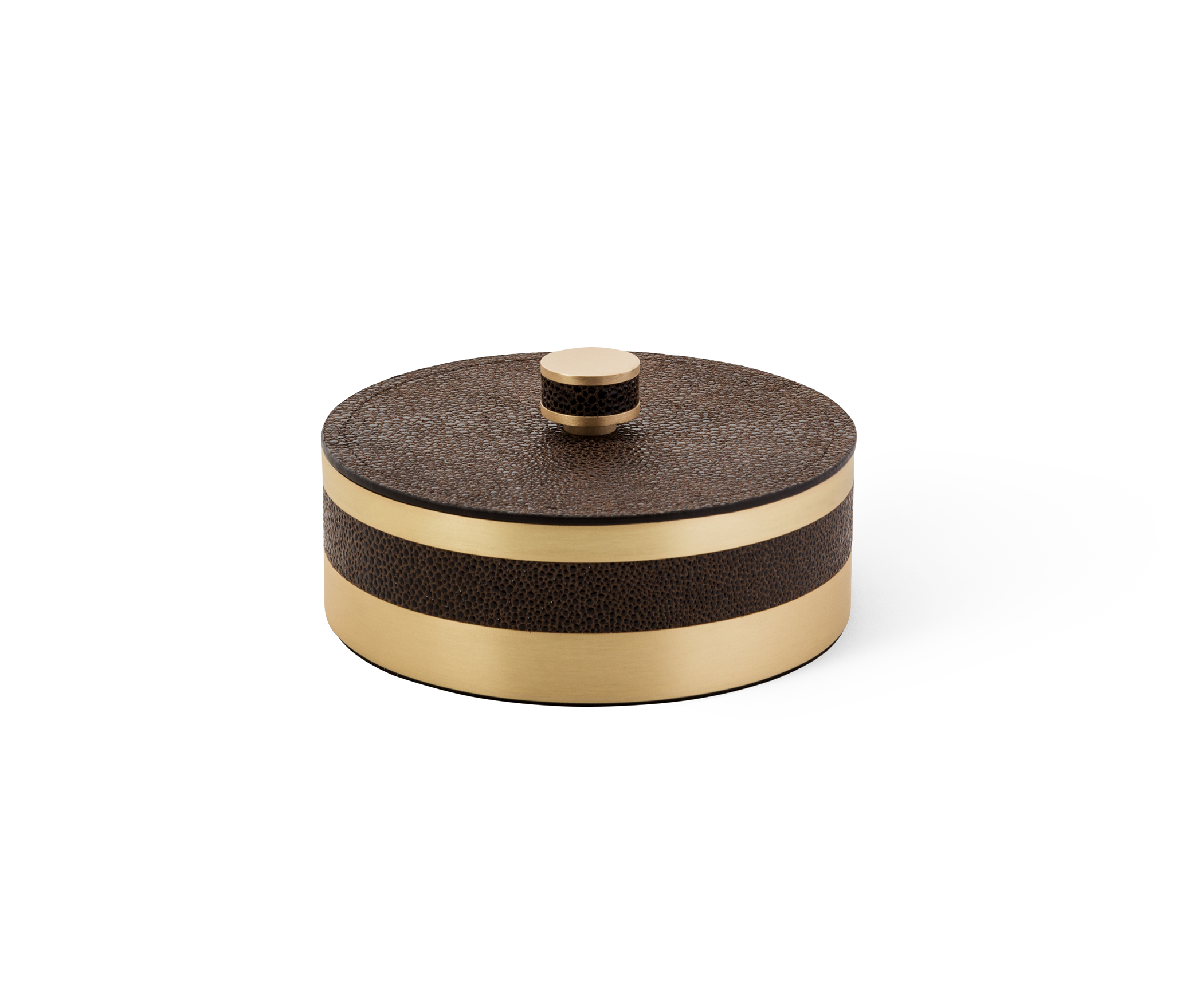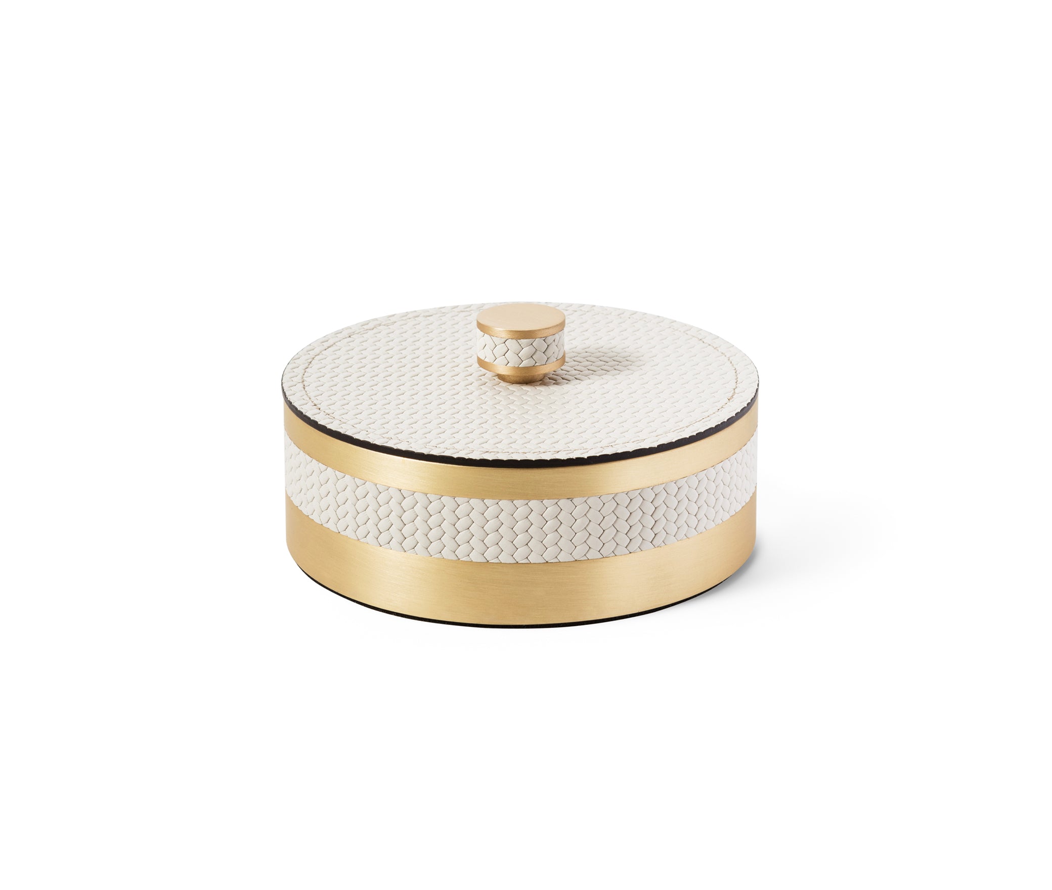 Коробка Saturno, выполненная из матовой латуни и украшенная кремовой кожей, станет элегантным акцентом в вашей ванной комнате или в любом уголке дома для аккуратного хранения мелочей.