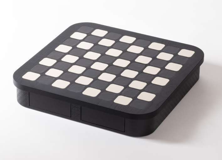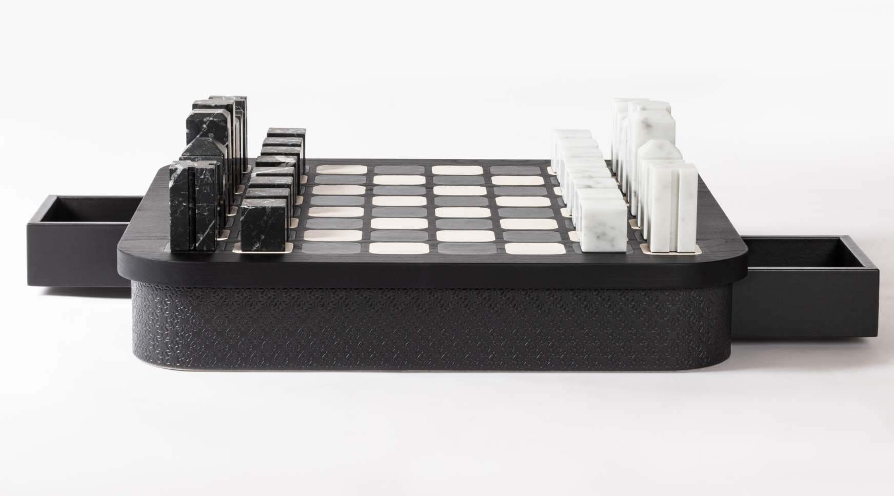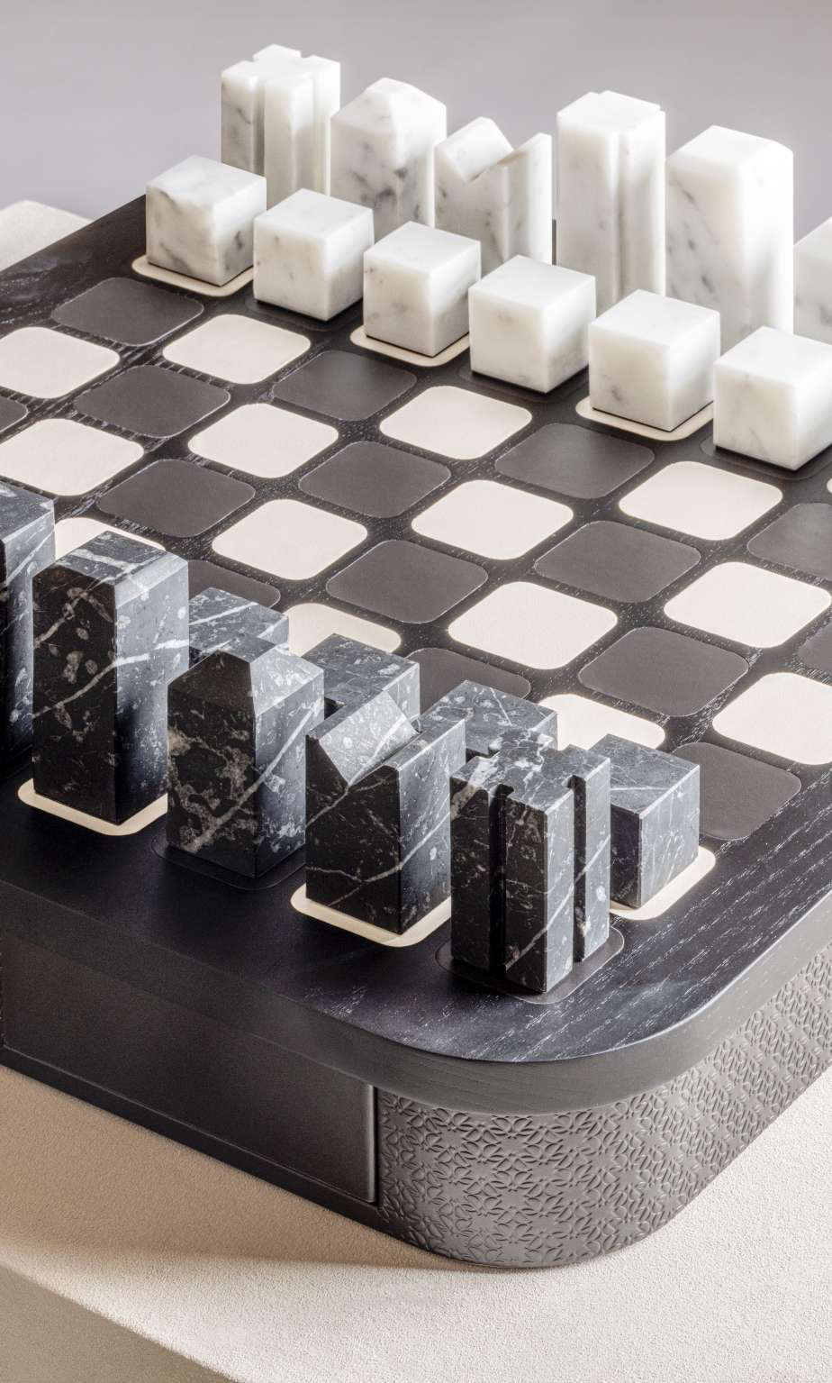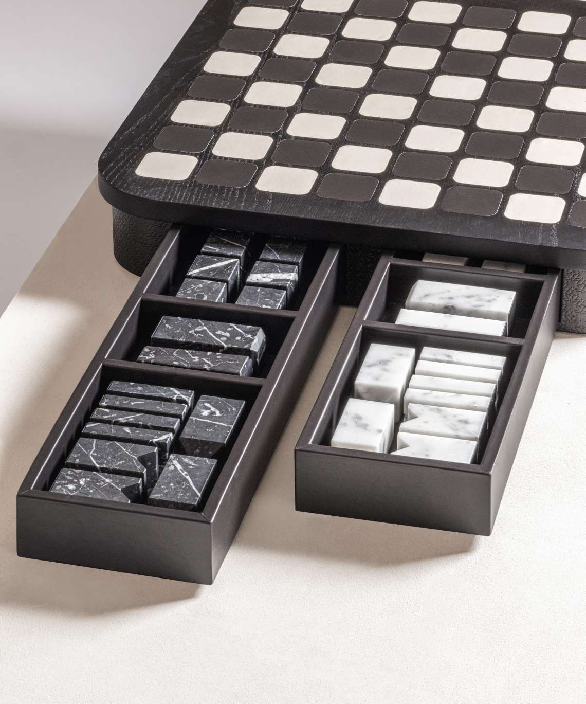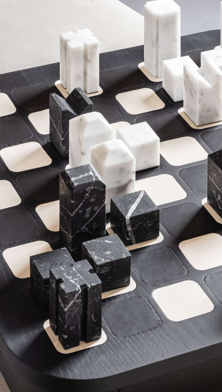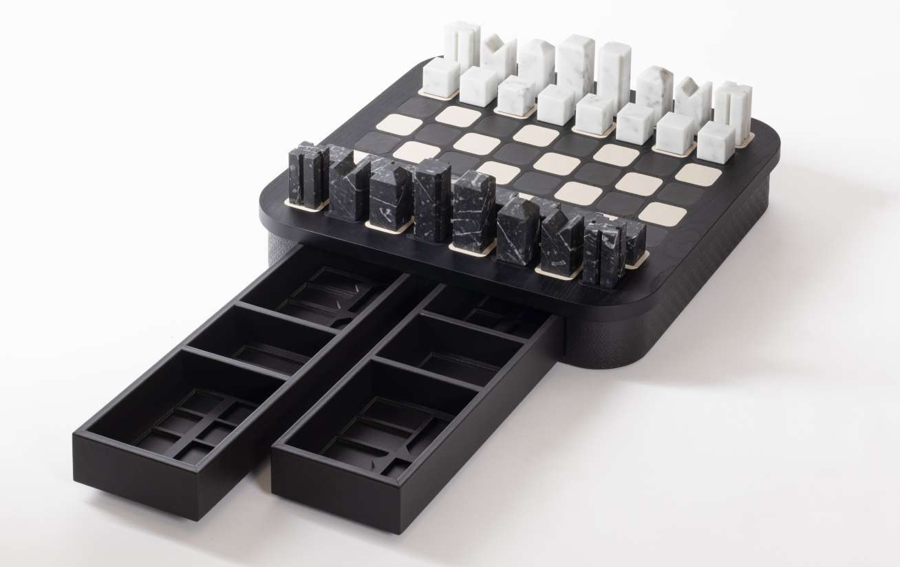 В корпус интегрированы два магнитных выдвижных ящика с отделениями для хранения фигур. Игровые элементы представлены двумя комплектами: из белого мрамора Carrara и чёрного мрамора Marquinia. Контраст натурального камня и мягкой кожи формирует элегантную композицию, подходящую для кабинета или представительской зоны.