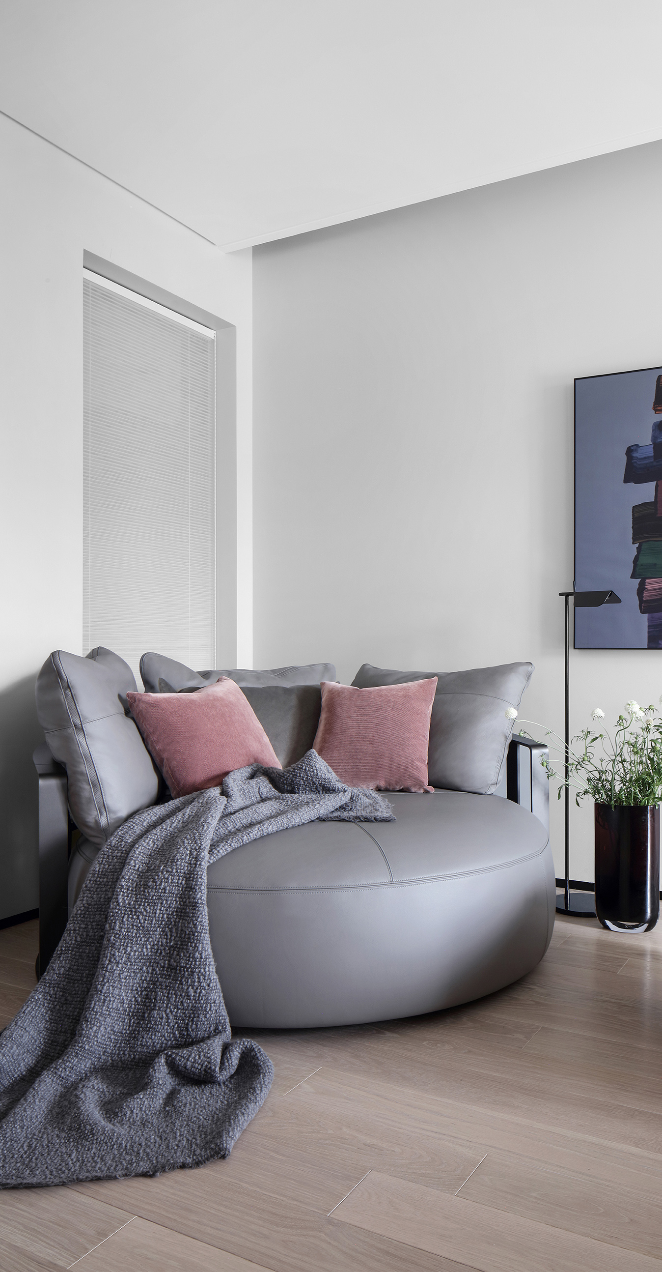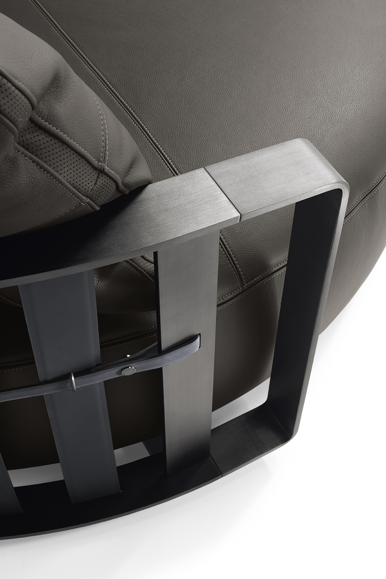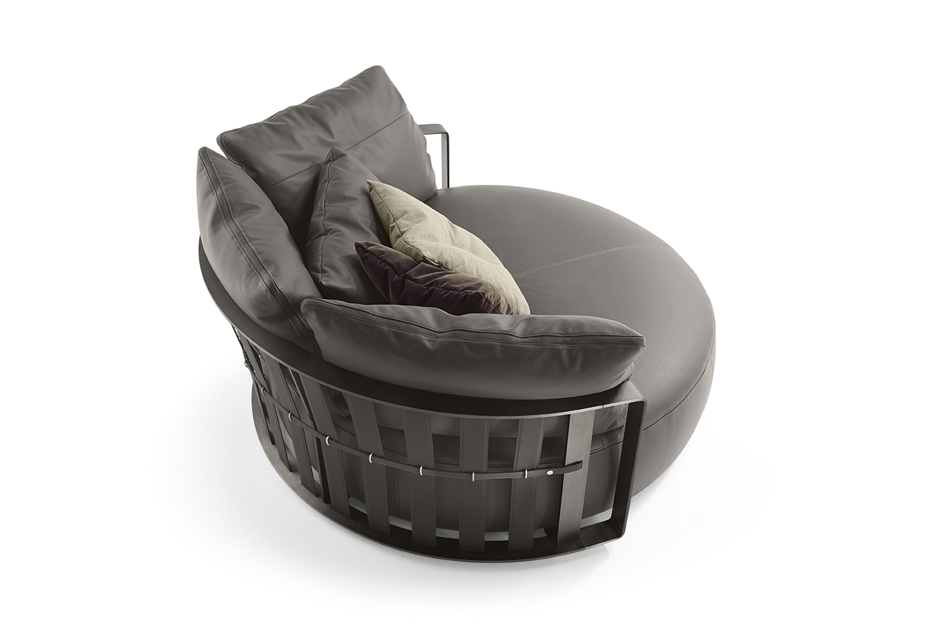 Диван «Скарлетт» окружен полированным стальным кольцом, которое поддерживает систему кожаных ремней. Ремни образуют конструкцию, которая одновременно служит подлокотником и спинкой, – элегантную решетку, на которой размещено сиденье, набитое гусиным пухом и пенополиуретаном. Гусиный пух также используется для подушек спинки, которые украшены квадратными и прямоугольными подушками. Все подушки обиты тканью или кожей Pelle Frau®. Каркас сиденья изготовлен из выдержанного бука. «Скарлетт» оснащен восемью односторонними колесиками, что позволяет вращать диван на 360°.