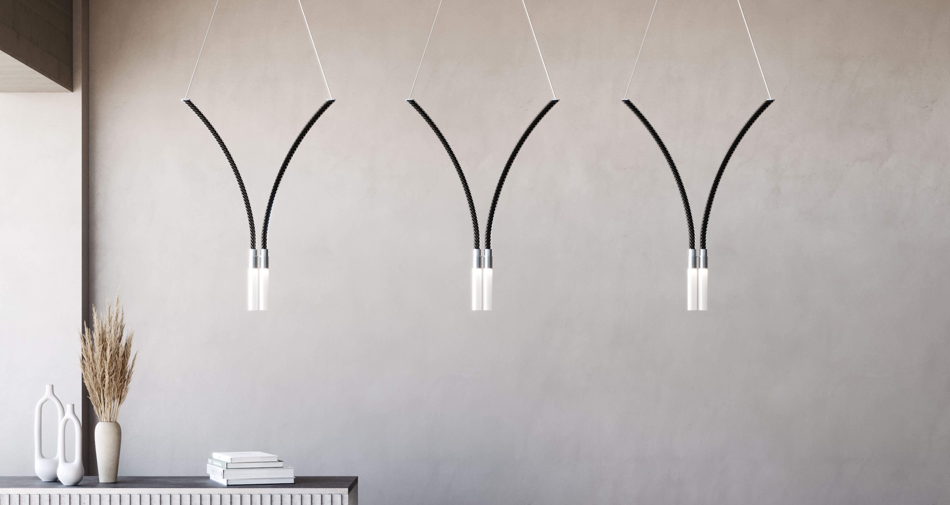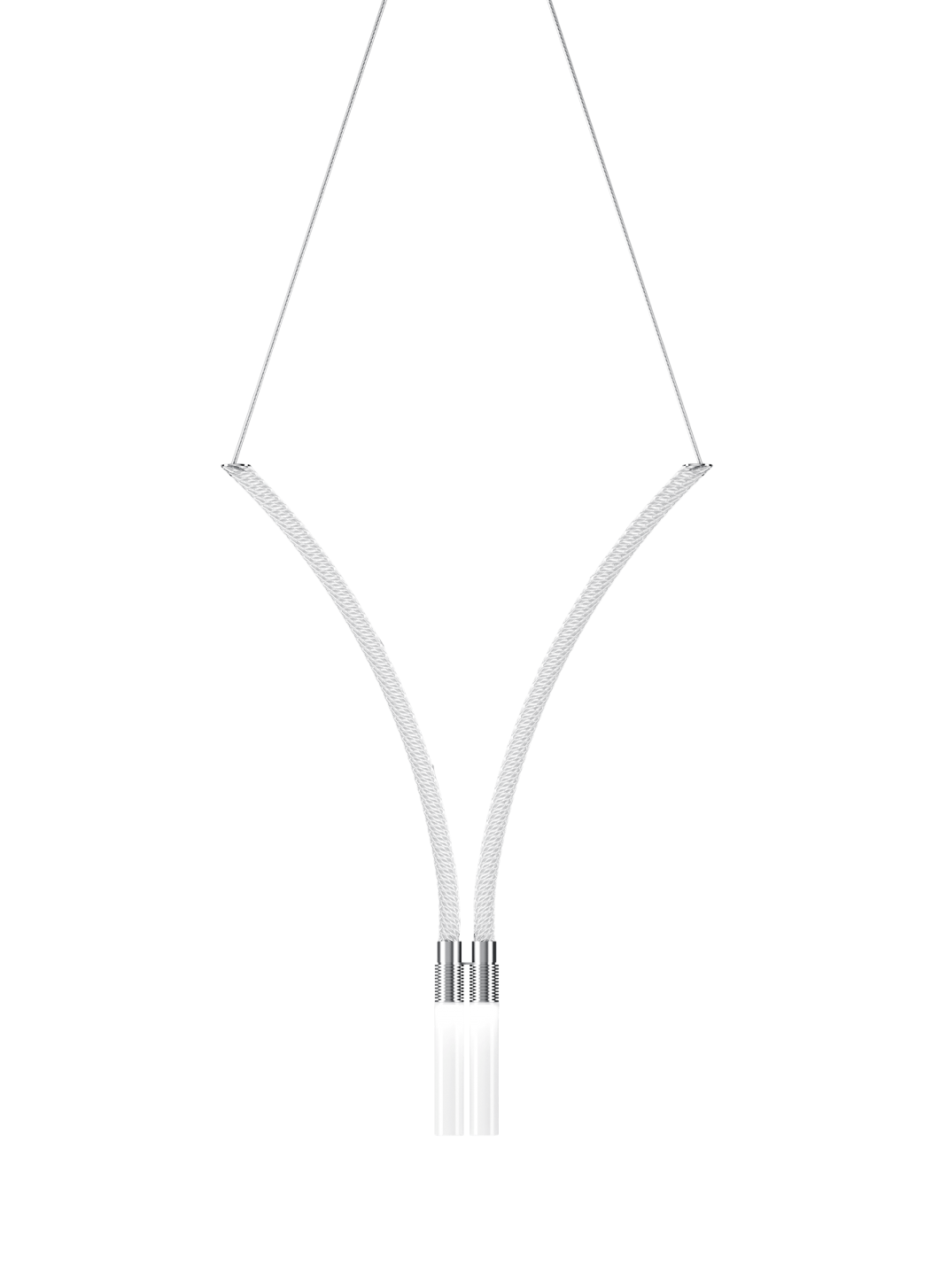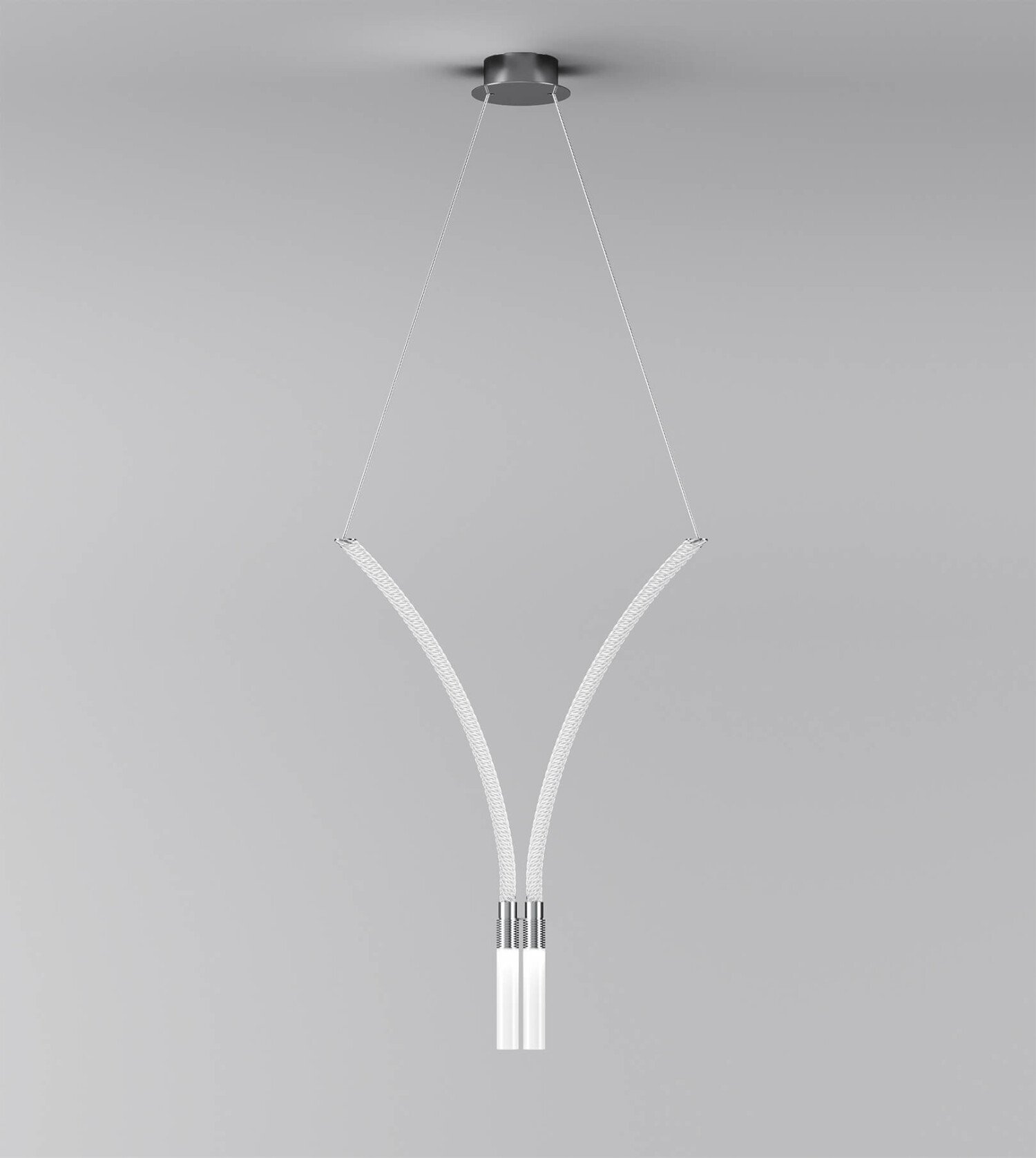 Подвесной светильник из стекла «торшон» ручной работы, прозрачного или черного цвета с рассеивателями из белого стекла.