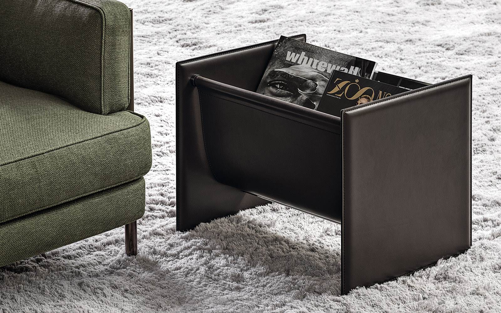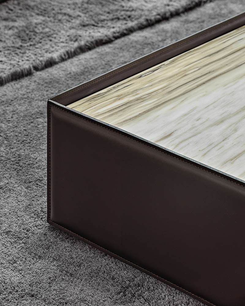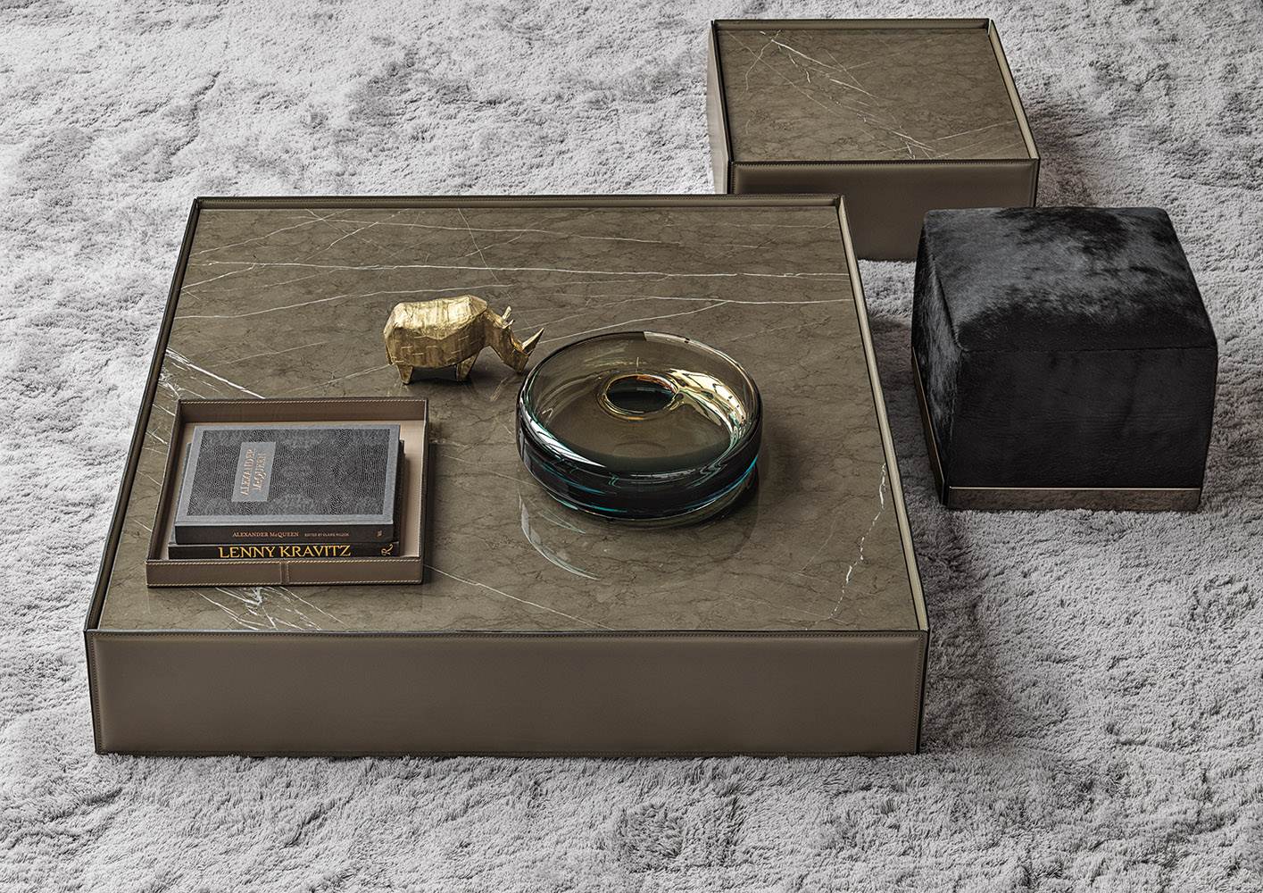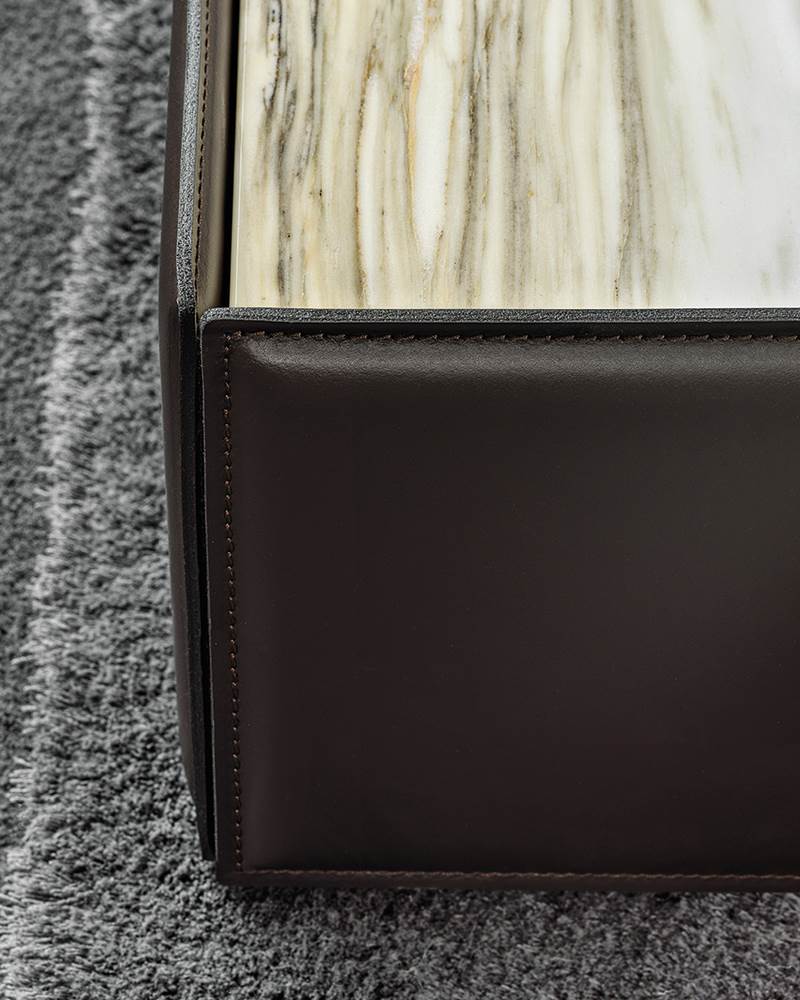 Side Table отличается текстурным сочетанием материалов, таких как мрамор и седельная кожа. Четыре панели, покрытые седельной кожей с видимой строчкой, обрамляют столешницу, выполненную из черного стекла, мрамора Zebrino или Stone Grey.