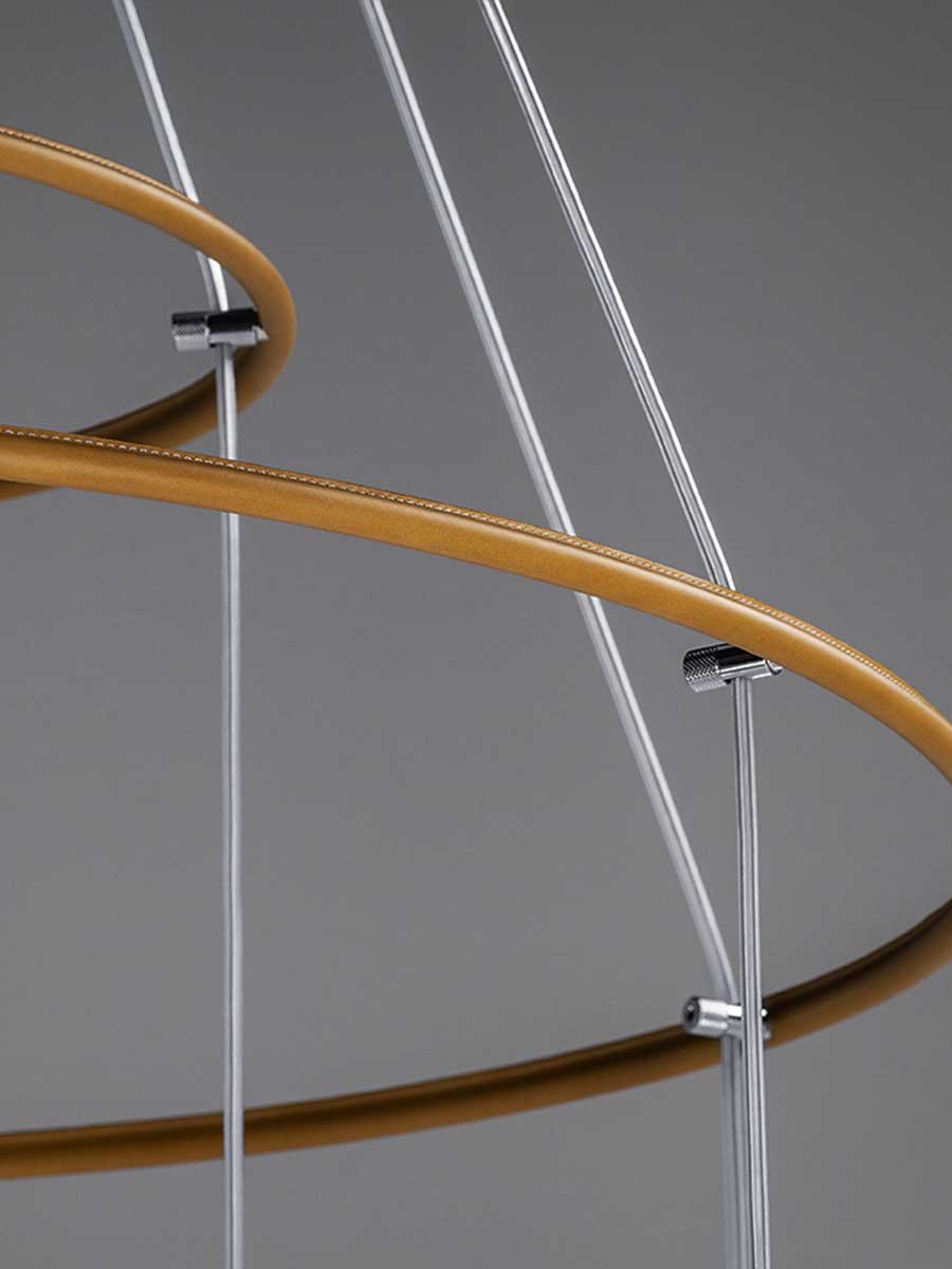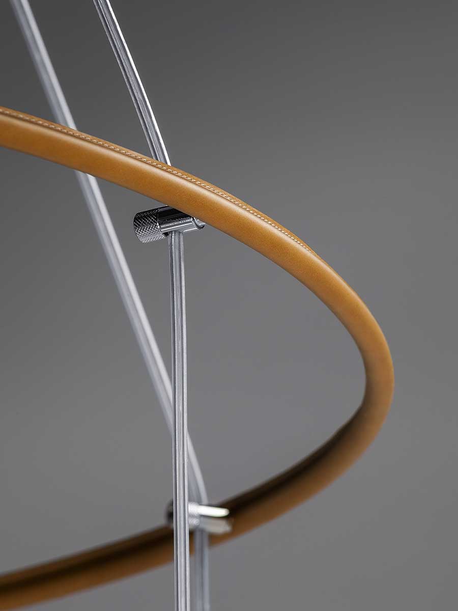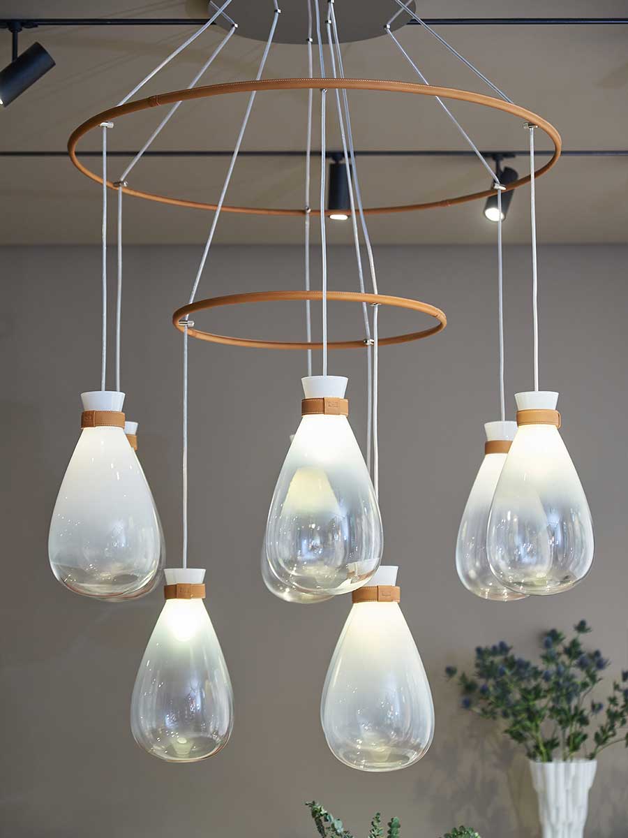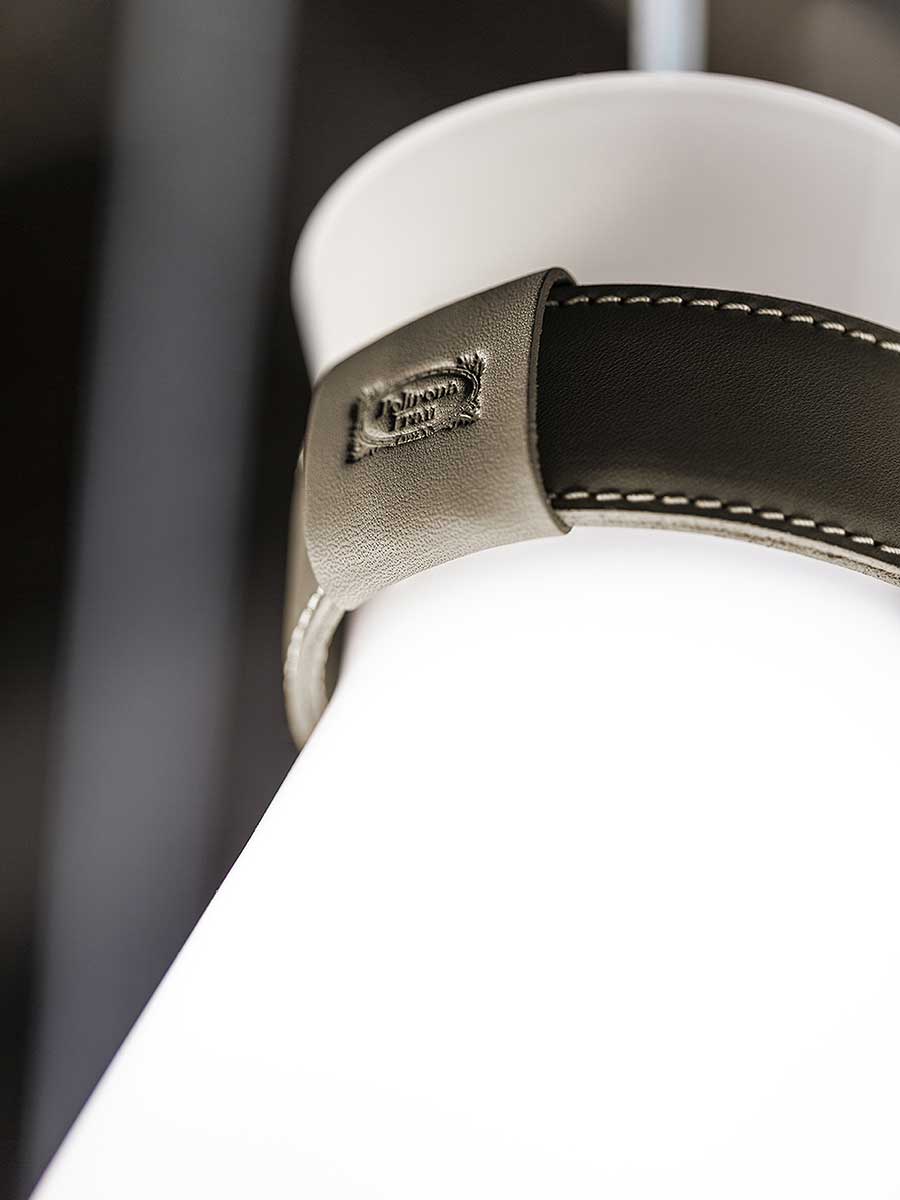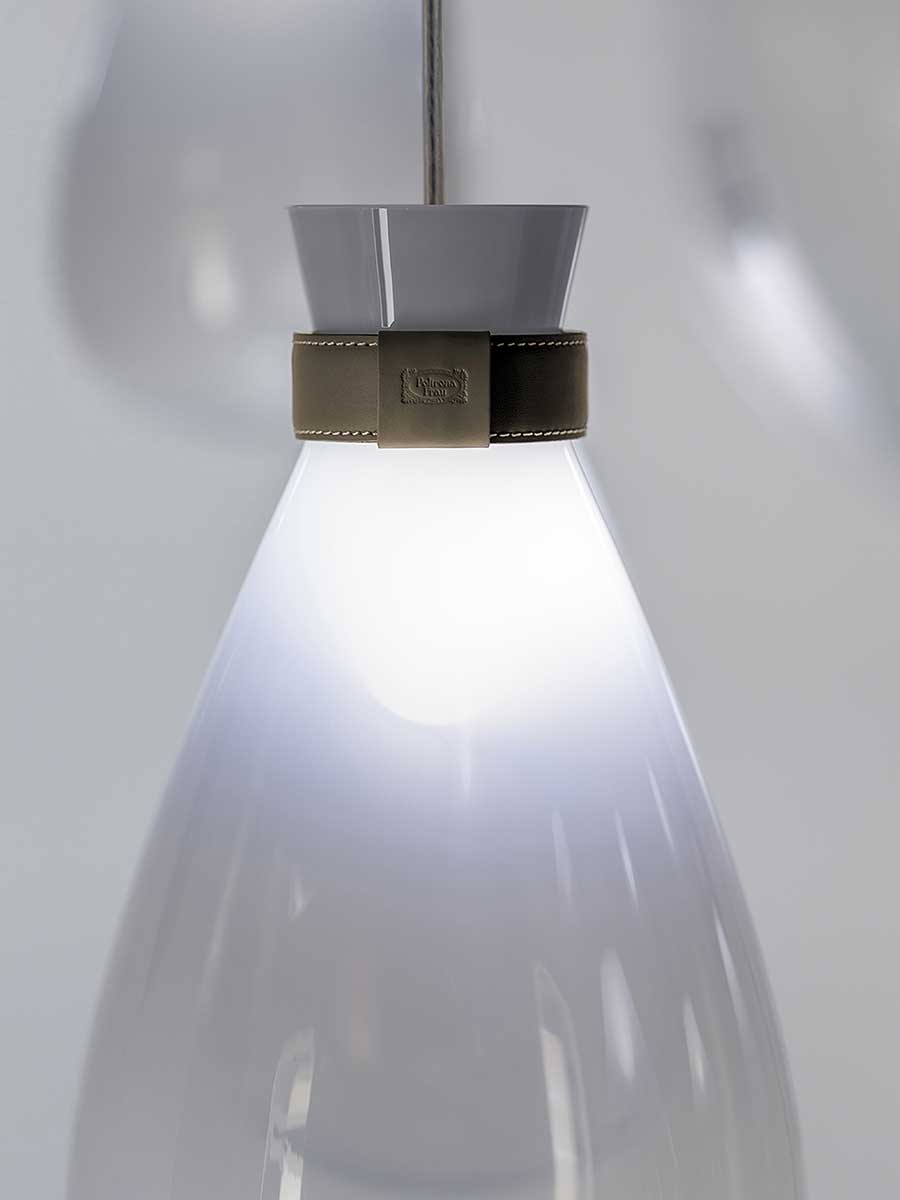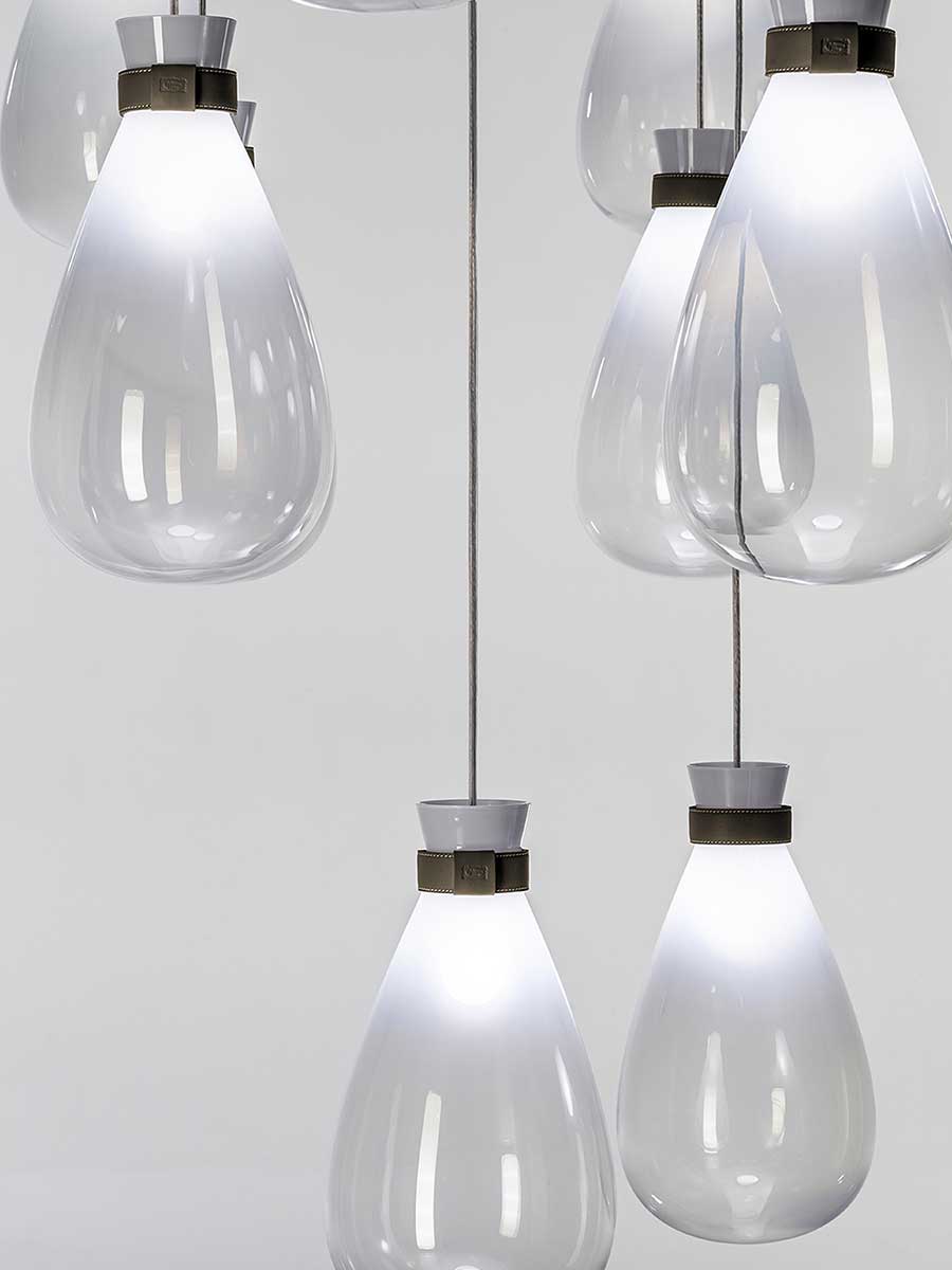 Лампы Soffi состоят из двух элементов, оба из выдувного стекла. Внешний колпак, воздушный и почти невесомый, выполнен в выцветших молочно-белых или дымчато-серых тонах. Внутри светильник из матового белого выдувного стекла с перламутровым покрытием выглядит визуально более плотным. Свет, излучаемый лампой, равномерно рассеивается, подчёркивая выцветший цвет внешнего стекла и его постепенную прозрачность. Волшебный и гармоничный эффект, идеальный для различных обстановок, становится ещё более выразительным благодаря уникальной природе каждой лампы Soffi. Выдувание тонированного в массе стекла создаёт различные нюансы и неровности формы света. Изысканный кожаный ремешок Cuoio Saddle Extra предлагается в двух вариантах отделки: Camel или Taupe, с контрастной строчкой и необработанным краем в тон. Петля из седельной кожи скрывает место соединения ремешка. На ремешке выгравирован логотип Poltrona Frau. Все внутренние металлические детали отделаны матовой латунью. Розетки изготовлены из полированной нержавеющей стали с регулируемыми прозрачными тросами. Коллекция Soffi включает три размера светильников: маленький, средний и большой, которые можно комбинировать в различных конфигурациях. В коллекции представлены две люстровые композиции: первая состоит из двух концентрических колец разного диаметра, обтянутых кожей Saddle Extra, на которых размещены девять светильников среднего размера: шесть на большем кольце и три на меньшем внутреннем кольце. Люстра из восемнадцати шаров состоит из трёх концентрических колец разного диаметра, обтянутых кожей Saddle Extra и расположенных на разной высоте, которую можно регулировать. На них подвешены восемнадцать светильников среднего размера: девять на большем кольце, шесть на среднем кольце и три на меньшем.