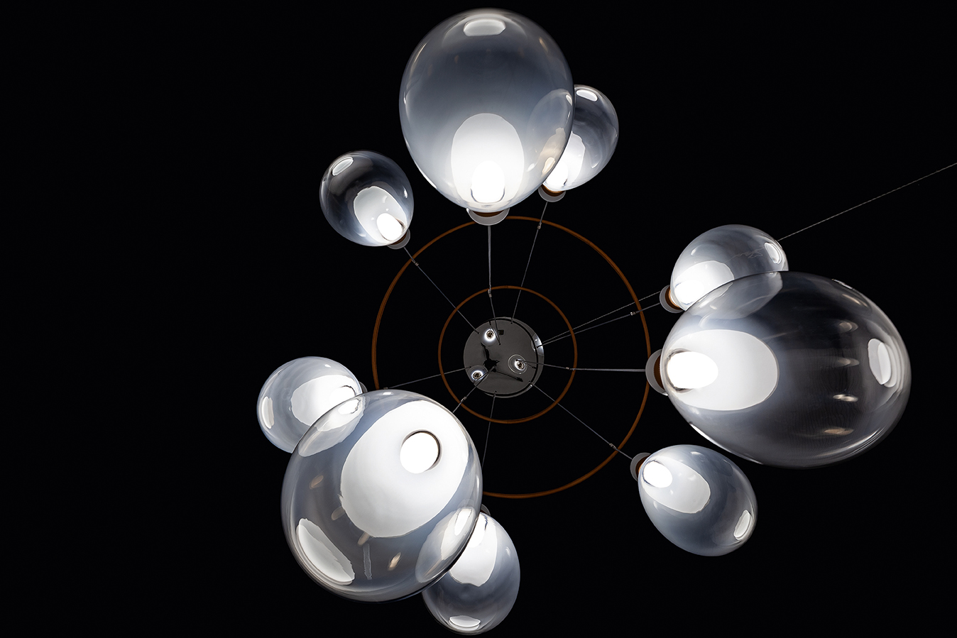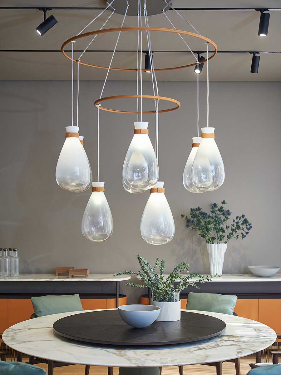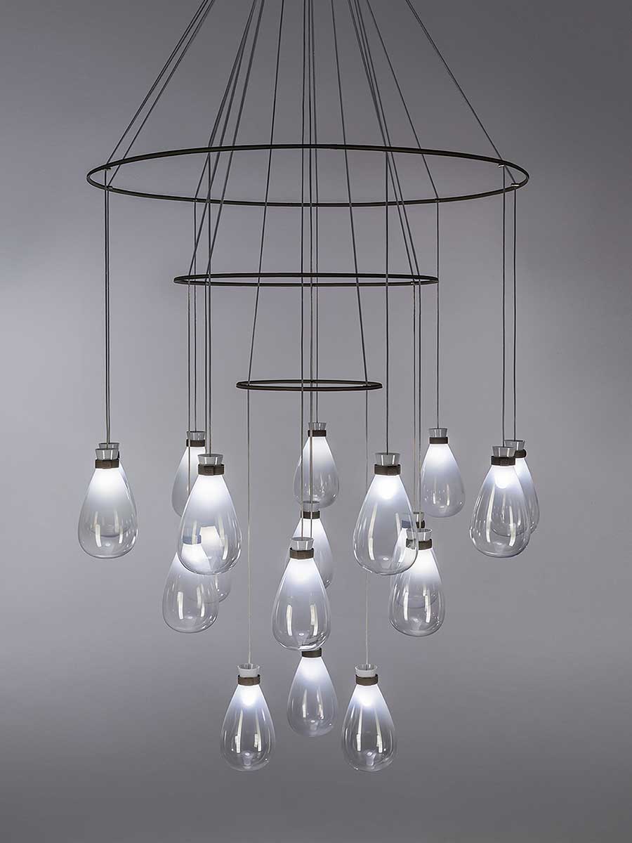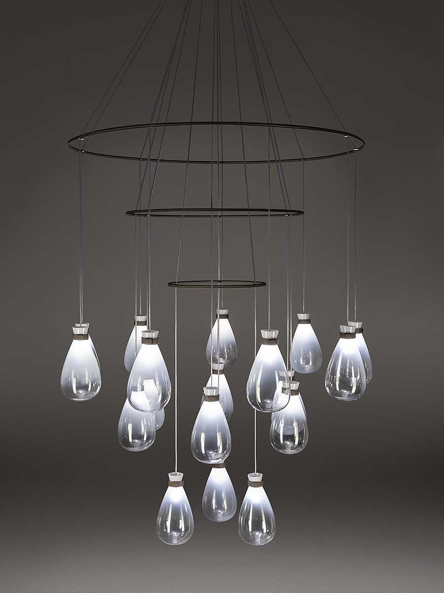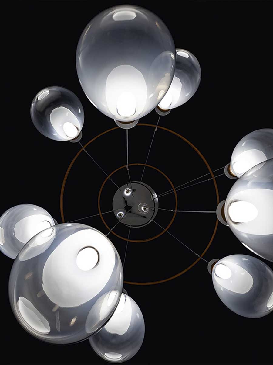 Лампы Soffi состоят из двух элементов, оба из выдувного стекла. Внешний колпак, воздушный и почти невесомый, выполнен в выцветших молочно-белых или дымчато-серых тонах. Внутри светильник из матового белого выдувного стекла с перламутровым покрытием выглядит визуально более плотным. Свет, излучаемый лампой, равномерно рассеивается, подчёркивая выцветший цвет внешнего стекла и его постепенную прозрачность. Волшебный и гармоничный эффект, идеальный для различных обстановок, становится ещё более выразительным благодаря уникальной природе каждой лампы Soffi. Выдувание тонированного в массе стекла создаёт различные нюансы и неровности формы света. Изысканный кожаный ремешок Cuoio Saddle Extra предлагается в двух вариантах отделки: Camel или Taupe, с контрастной строчкой и необработанным краем в тон. Петля из седельной кожи скрывает место соединения ремешка. На ремешке выгравирован логотип Poltrona Frau. Все внутренние металлические детали отделаны матовой латунью. Розетки изготовлены из полированной нержавеющей стали с регулируемыми прозрачными тросами. Коллекция Soffi включает три размера светильников: маленький, средний и большой, которые можно комбинировать в различных конфигурациях. В коллекции представлены две люстровые композиции: первая состоит из двух концентрических колец разного диаметра, обтянутых кожей Saddle Extra, на которых размещены девять светильников среднего размера: шесть на большем кольце и три на меньшем внутреннем кольце. Люстра из восемнадцати шаров состоит из трёх концентрических колец разного диаметра, обтянутых кожей Saddle Extra и расположенных на разной высоте, которую можно регулировать. На них подвешены восемнадцать светильников среднего размера: девять на большем кольце, шесть на среднем кольце и три на меньшем.