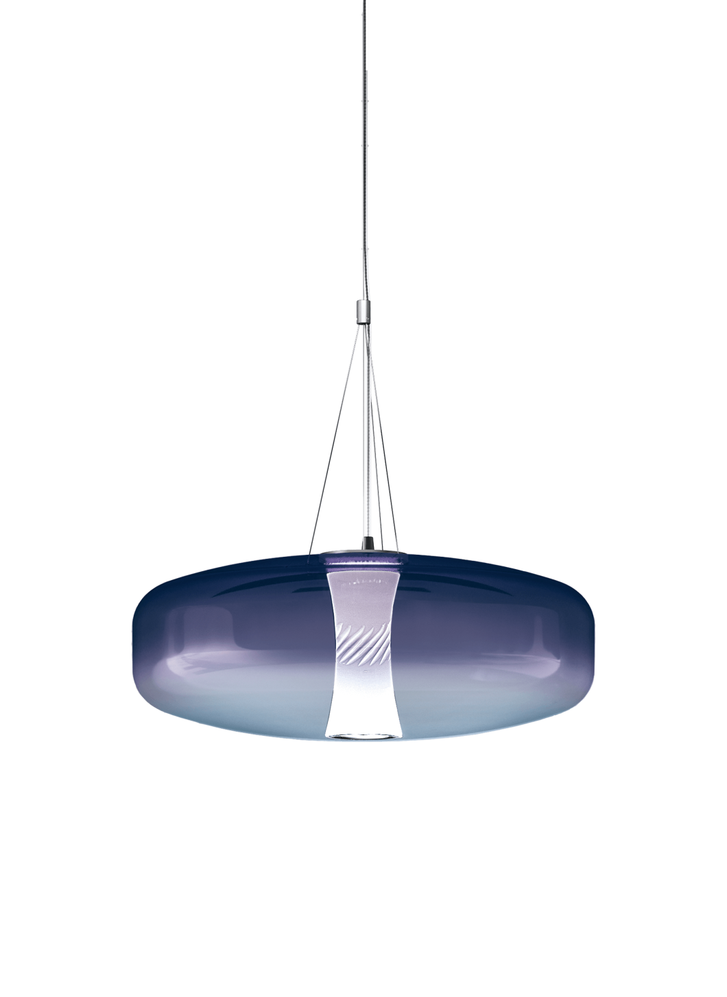 Подвесной светильник из выдувного стекла с отделкой сине-фиолетового или золотистого оттенков. Внутренний рассеиватель из выдувного стекла белого цвета, вырезанного вручную. Металлическая конструкция с отделкой цвета серого железа.