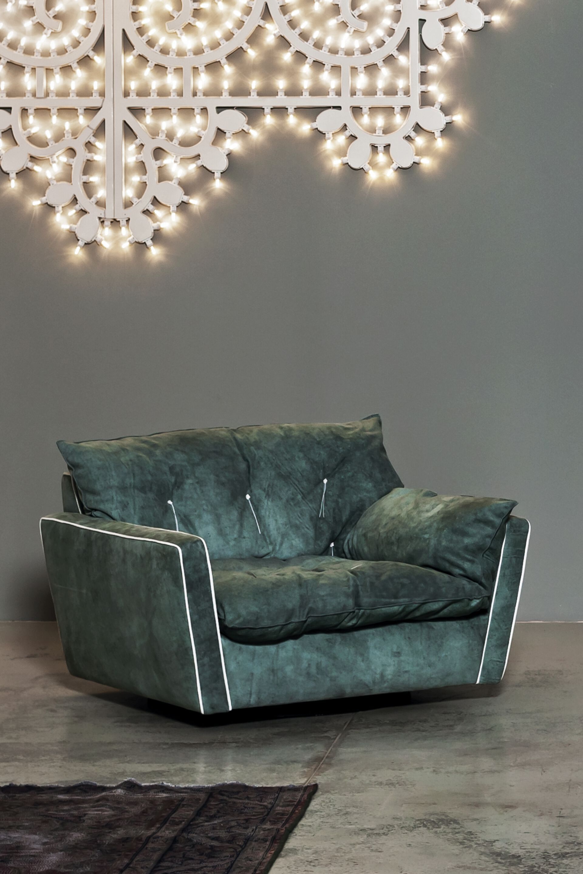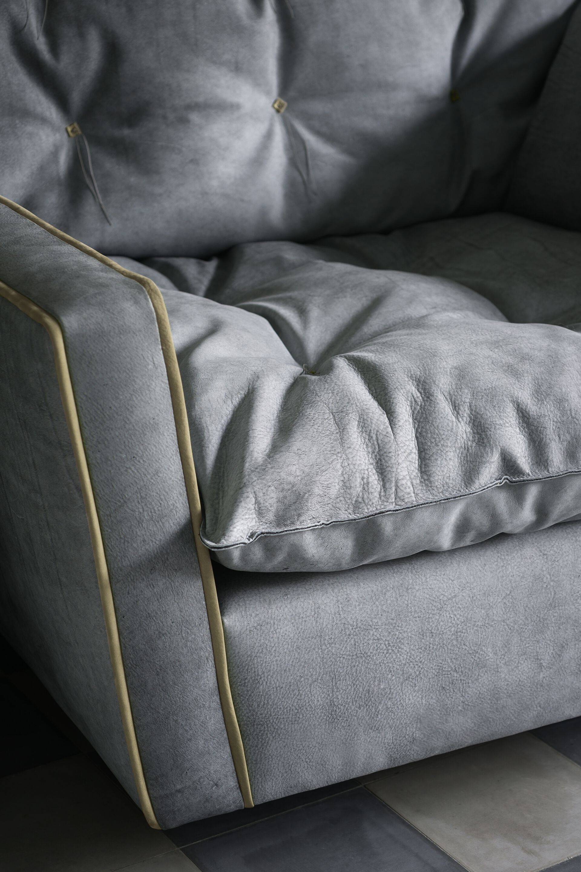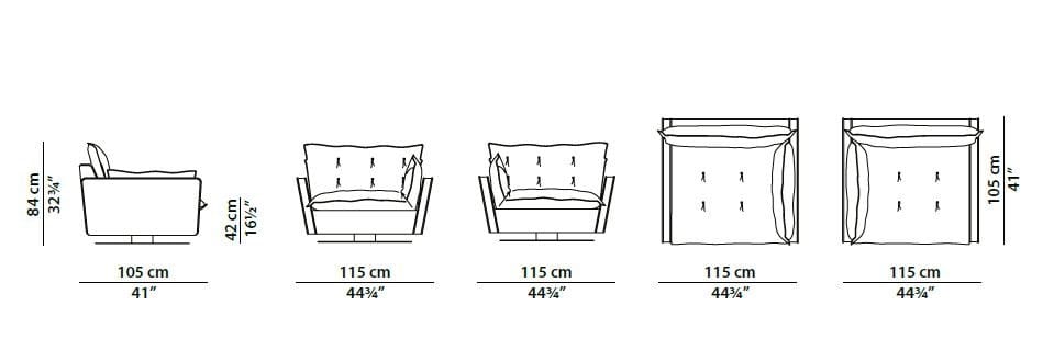Кресло с поворотным основанием, оснащено съёмными подушками на сиденье и подлокотнике, наполненными акриловым волокном. Конструкция выполнена из фанеры и ели. Наполнение — полиуретановая пена различной плотности с акриловым волокном. Обивка из мягкой кожи с контрастной строчкой. Подушки доступны только в мягкой коже.