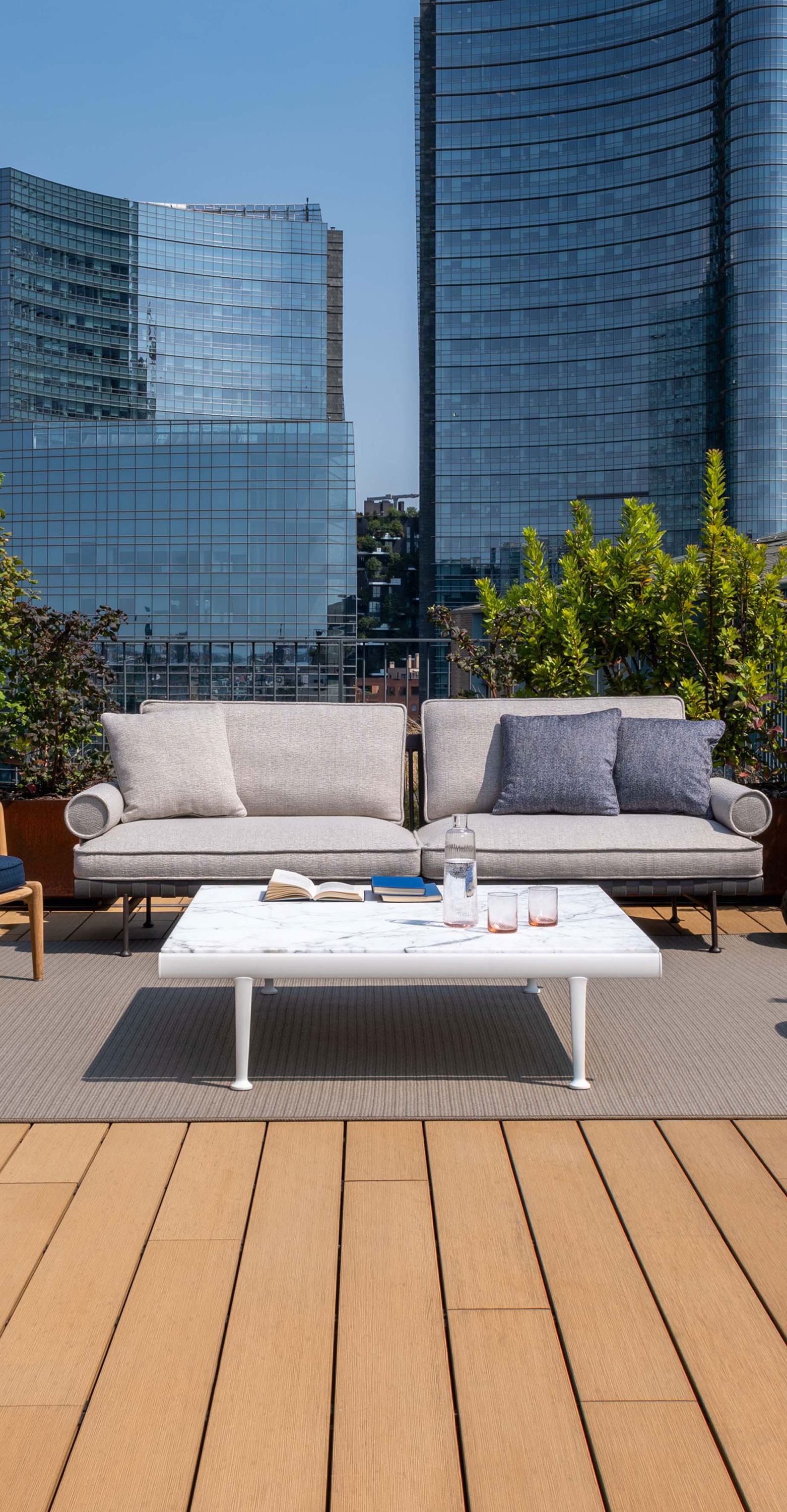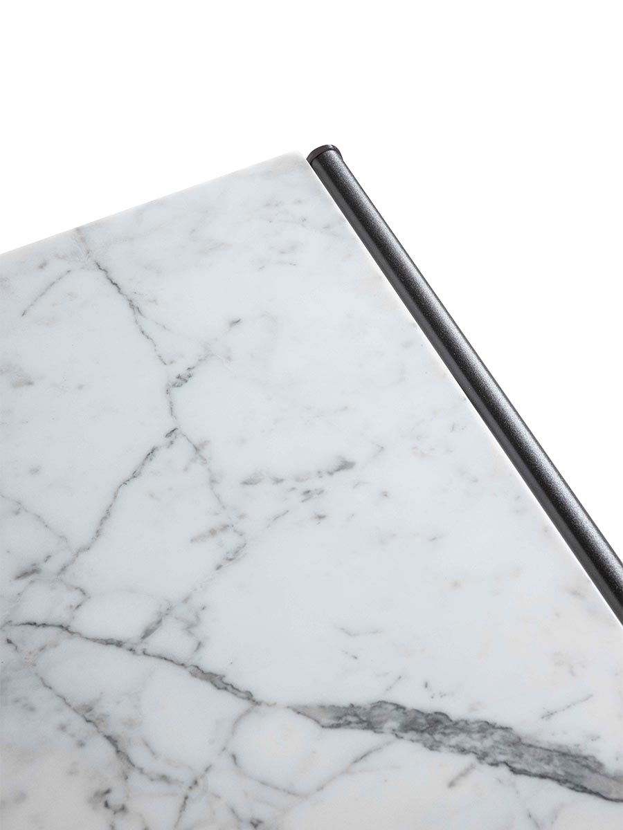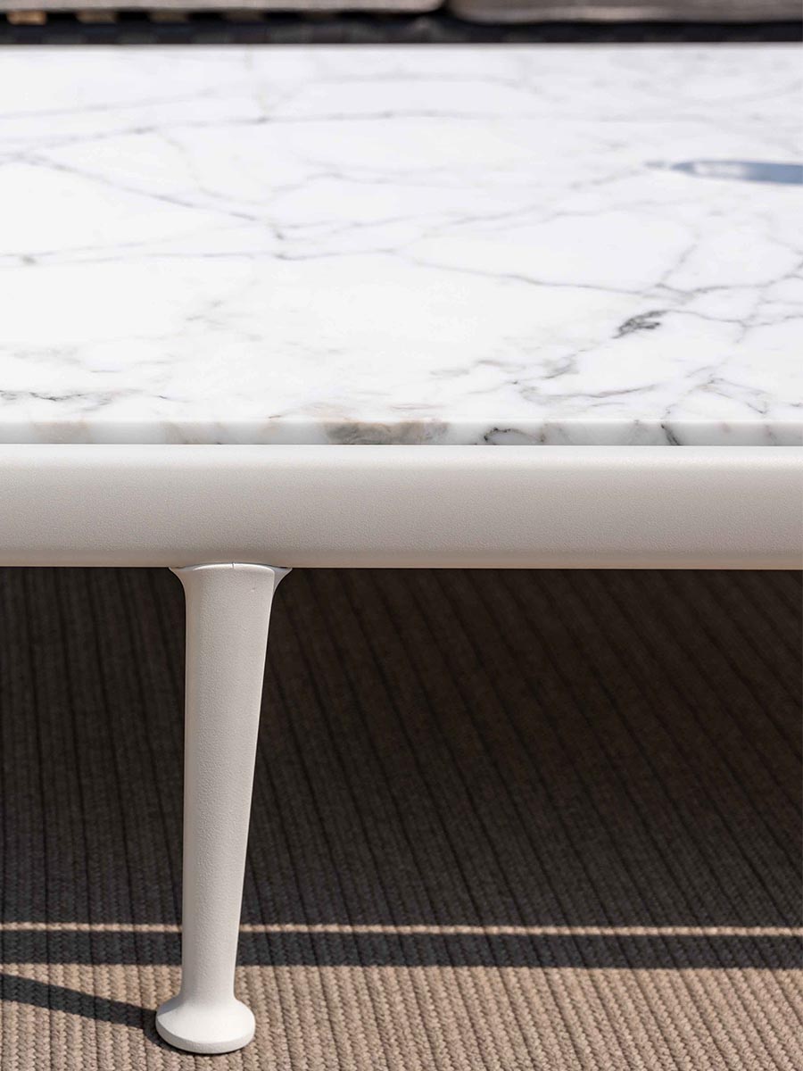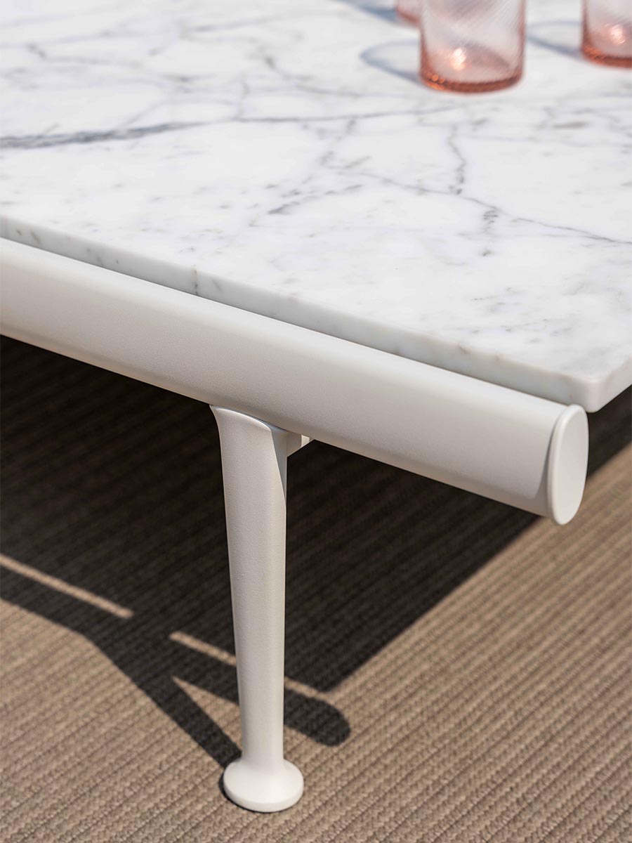 Дизайн садового столика из коллекции Souvenir d'Italie, разработанный Людовикой Серафини и Роберто Паломба, отличается четкими линиями и изготовлен всего из двух материалов: металла и мрамора. Столешница выполнена из изысканного мрамора Arabescato с натуральной отделкой, что позволяет подчеркнуть уникальность каждого блока карьера и игру темно-серых прожилок. Несущая конструкция изготовлена из экструдированного алюминия, покрытого лаком оттенков Gesso и Basalto, которые согревают материал, напоминая о природных красках. Ножки столика изготовлены из литого алюминия с тонким рельефным порошковым покрытием. Оттенки отделки подобраны так, чтобы сочетаться как с диваном Souvenir d'Italie, так и с широким ассортиментом садовой мебели и аксессуаров из коллекции Poltrona Frau Boundless Living Outdoor. Для меблировки зоны отдыха в садах, на террасах, патио, у бассейна и на палубах кораблей.