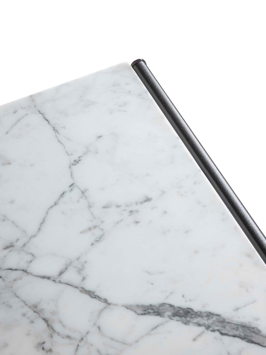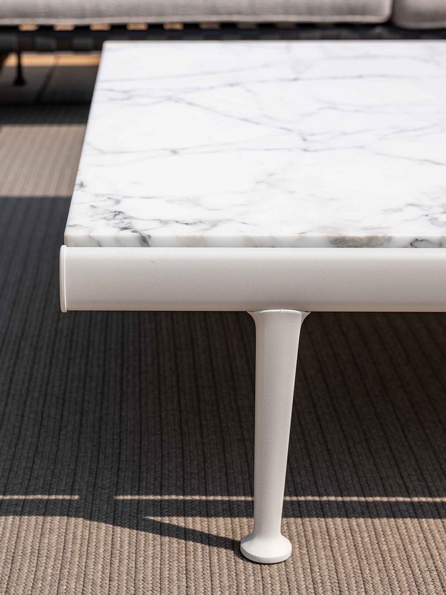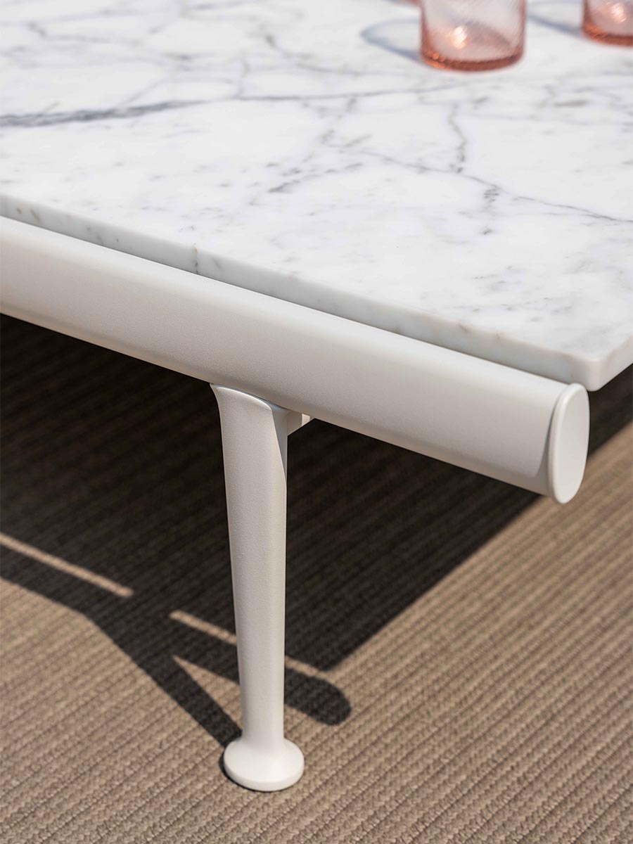 Дизайн садового столика из коллекции Souvenir d'Italie, разработанный Людовикой Серафини и Роберто Паломба, отличается четкими линиями и изготовлен всего из двух материалов: металла и мрамора. Столешница выполнена из изысканного мрамора Arabescato с натуральной отделкой, что позволяет подчеркнуть уникальность каждого блока карьера и игру темно-серых прожилок. Несущая конструкция изготовлена из экструдированного алюминия, покрытого лаком оттенков Gesso и Basalto, которые согревают материал, напоминая о природных красках. Ножки столика изготовлены из литого алюминия с тонким рельефным порошковым покрытием. Оттенки отделки подобраны так, чтобы сочетаться как с диваном Souvenir d'Italie, так и с широким ассортиментом садовой мебели и аксессуаров из коллекции Poltrona Frau Boundless Living Outdoor. Для меблировки зоны отдыха в садах, на террасах, патио, у бассейна и на палубах кораблей.