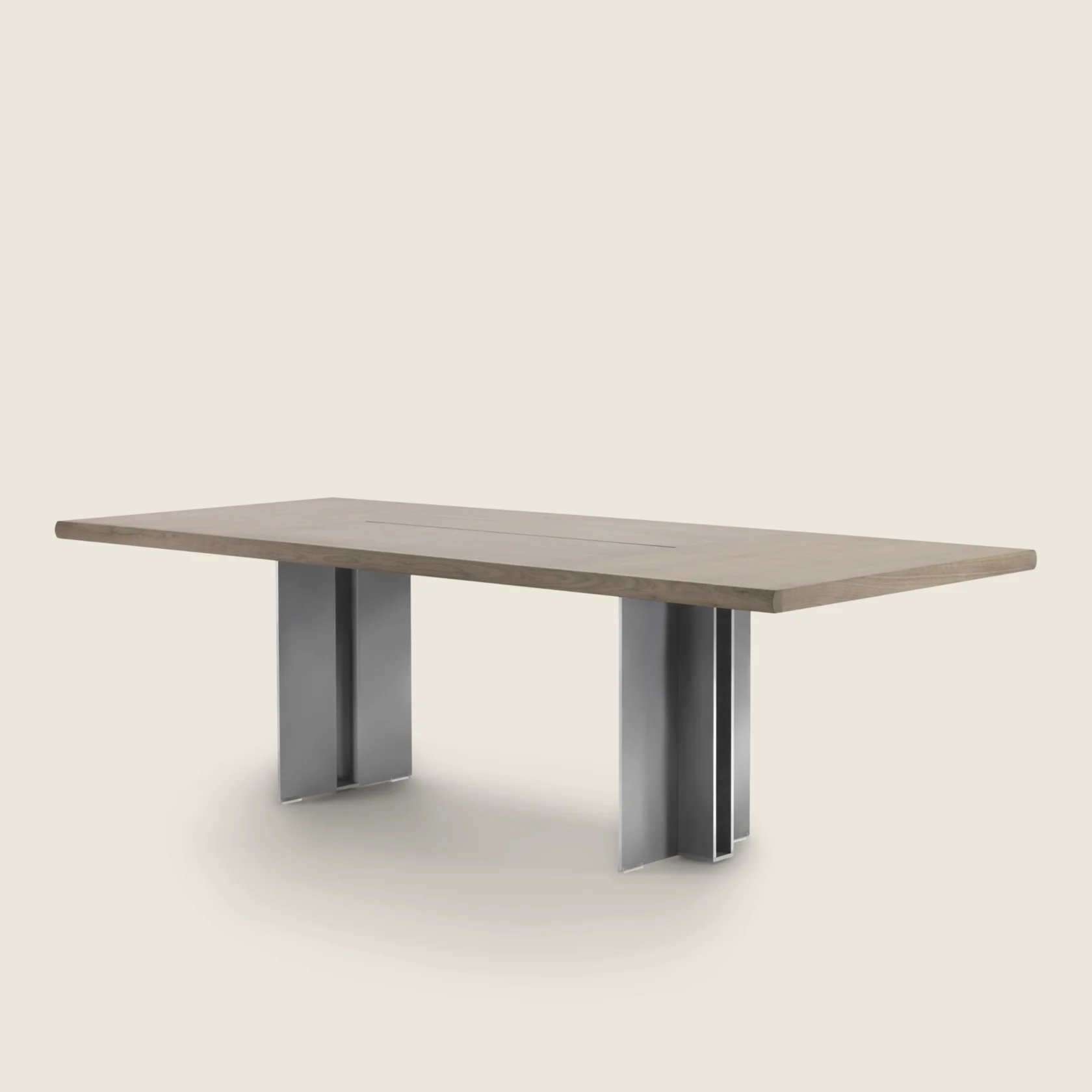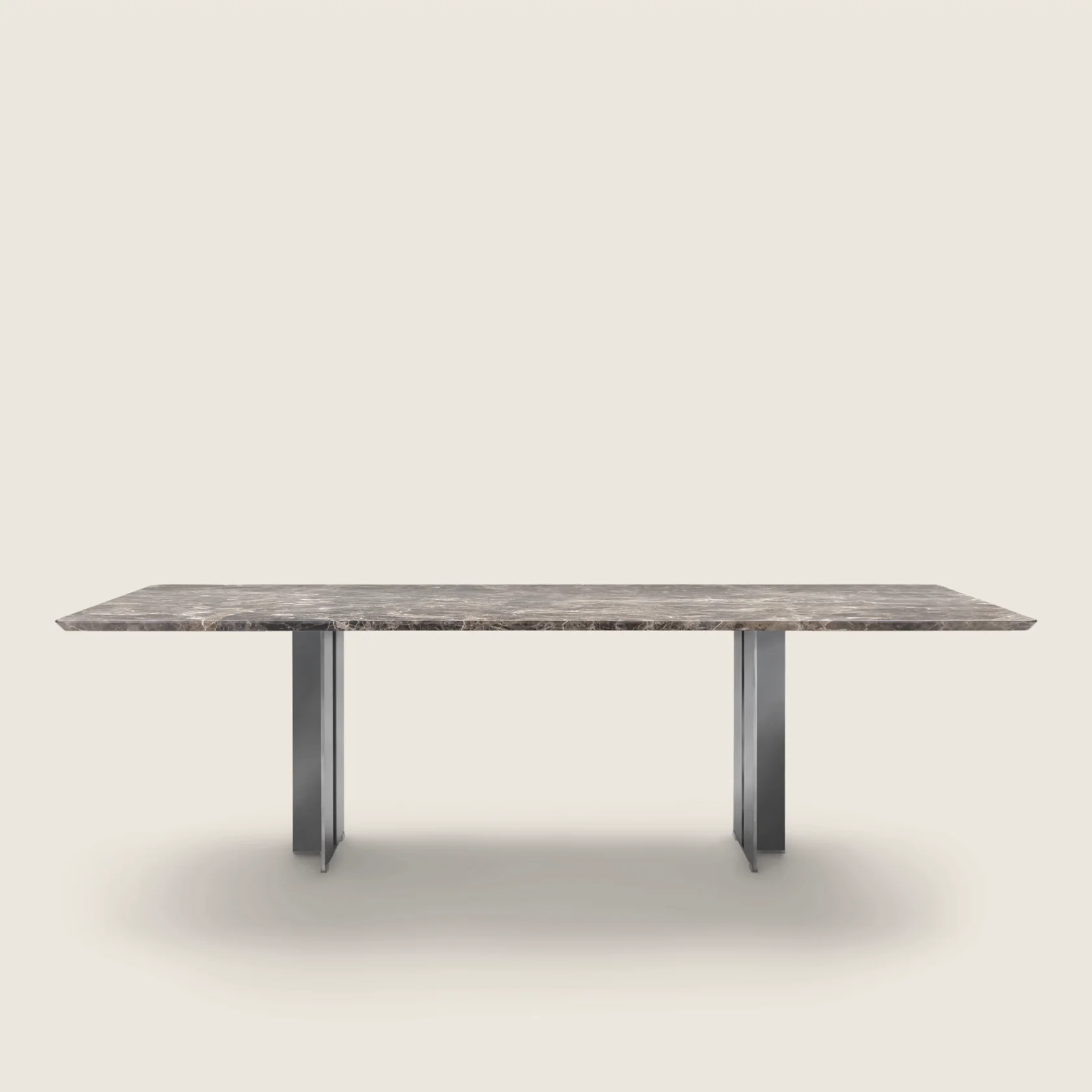 Spello — это прямоугольный стол, вдохновлённый эстетикой брутализма. Его массивная столешница с выразительной текстурой дерева или мрамора контрастирует с геометрическими металлическими опорами. Дизайн подчёркивает баланс между архитектурной строгостью и утончённой отделкой.