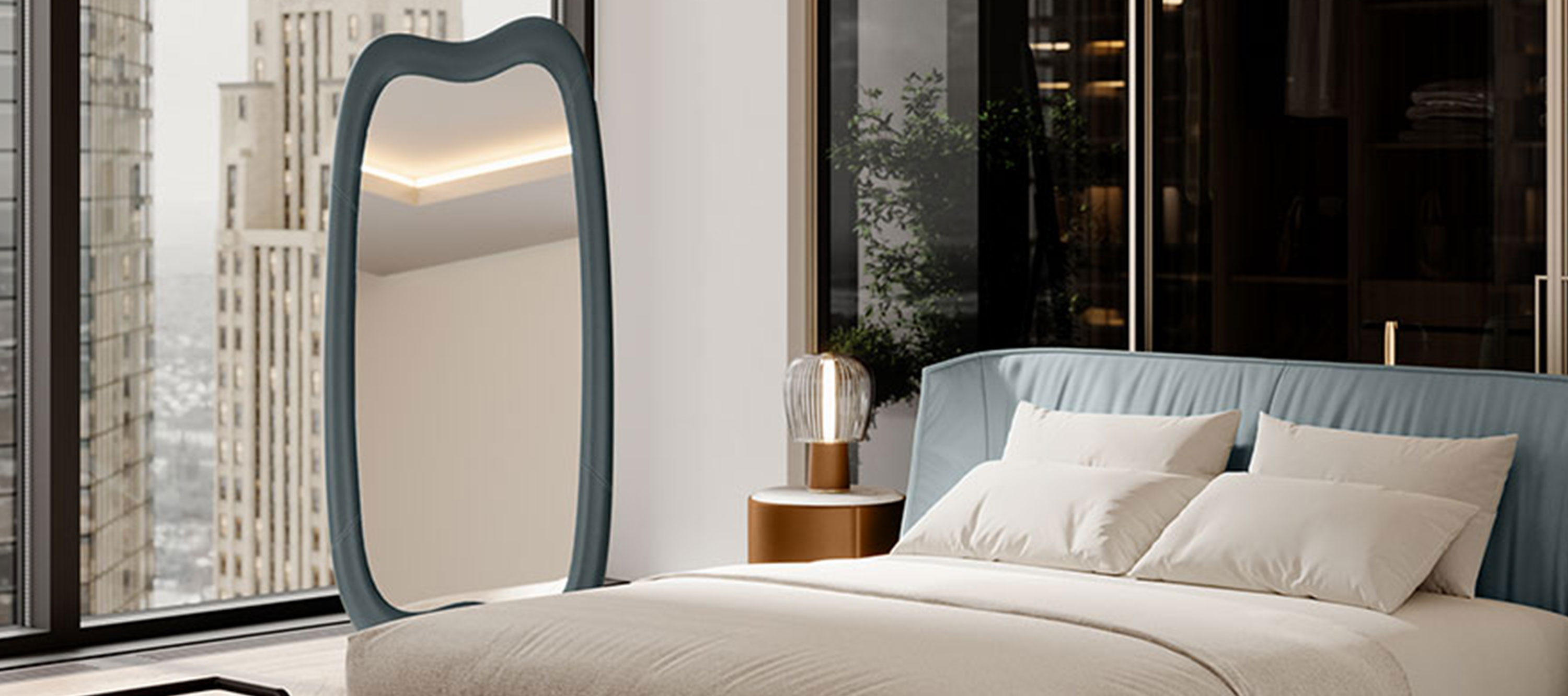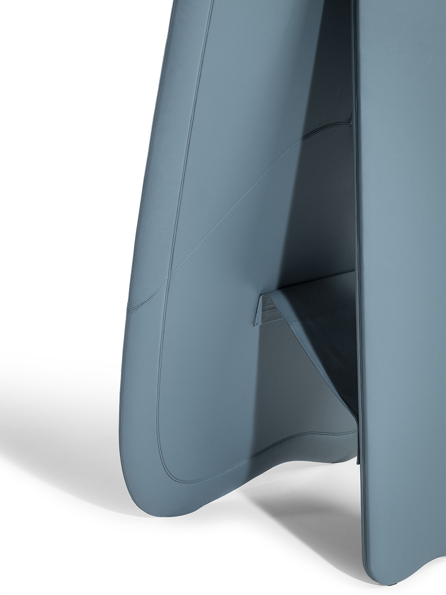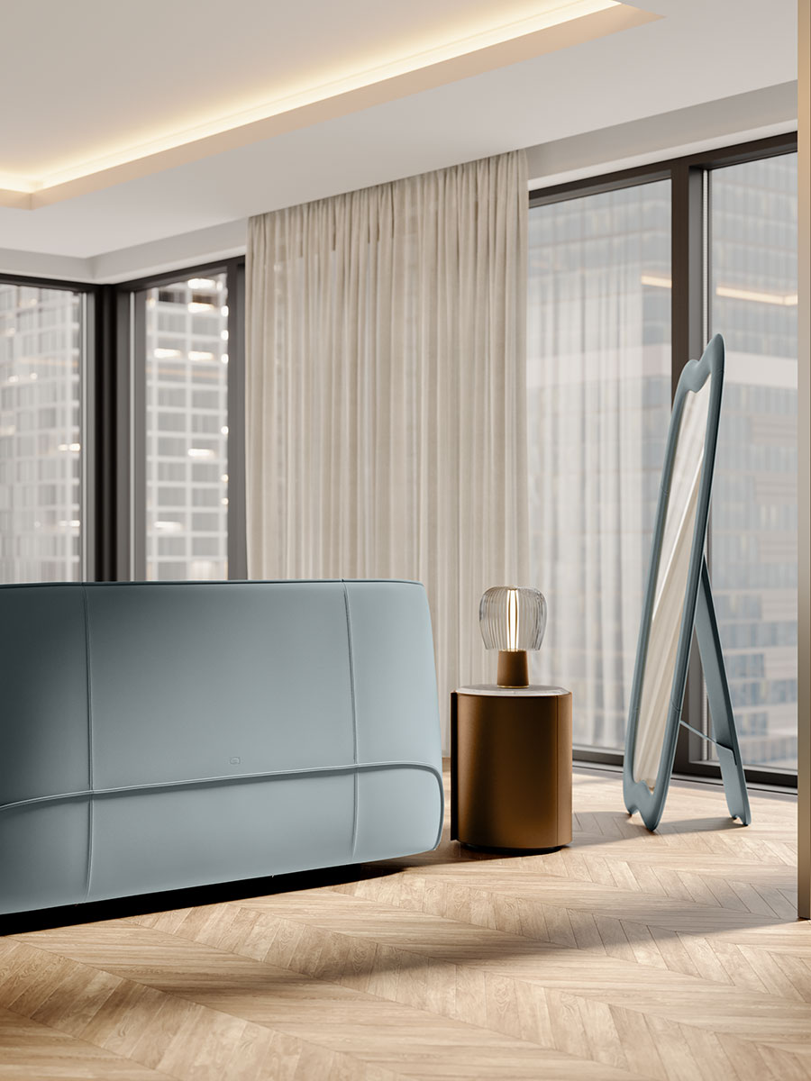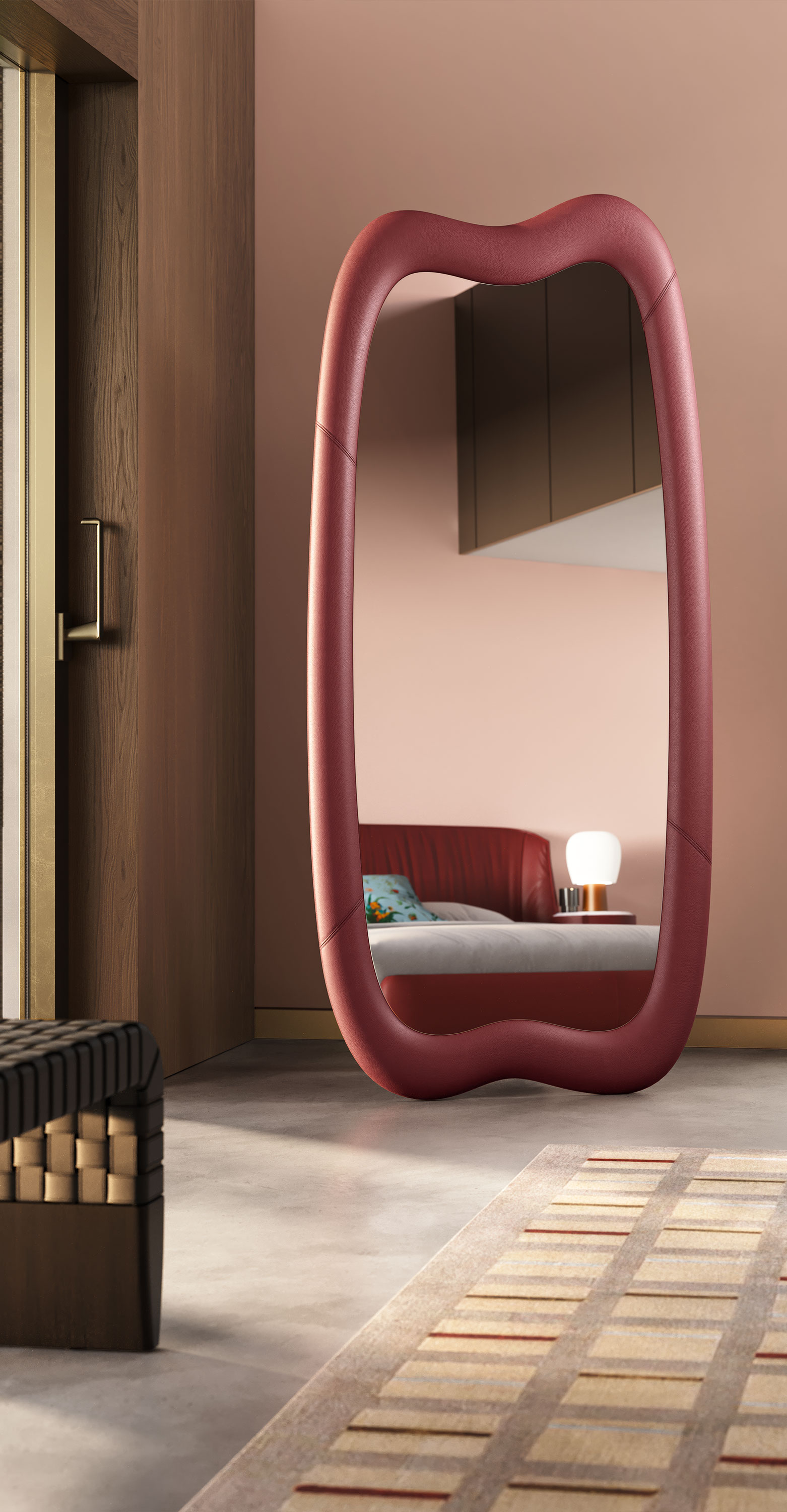 Зеркало Squash в полный рост обито кожей и повторяет плавные и изящные контуры одноименной коллекции. Его характеризуют контрастный жёсткий материал (стекло) и мягкие, приятные на ощупь округлые оправы, обтянутые кожей Pelle Frau ColorSphere®.