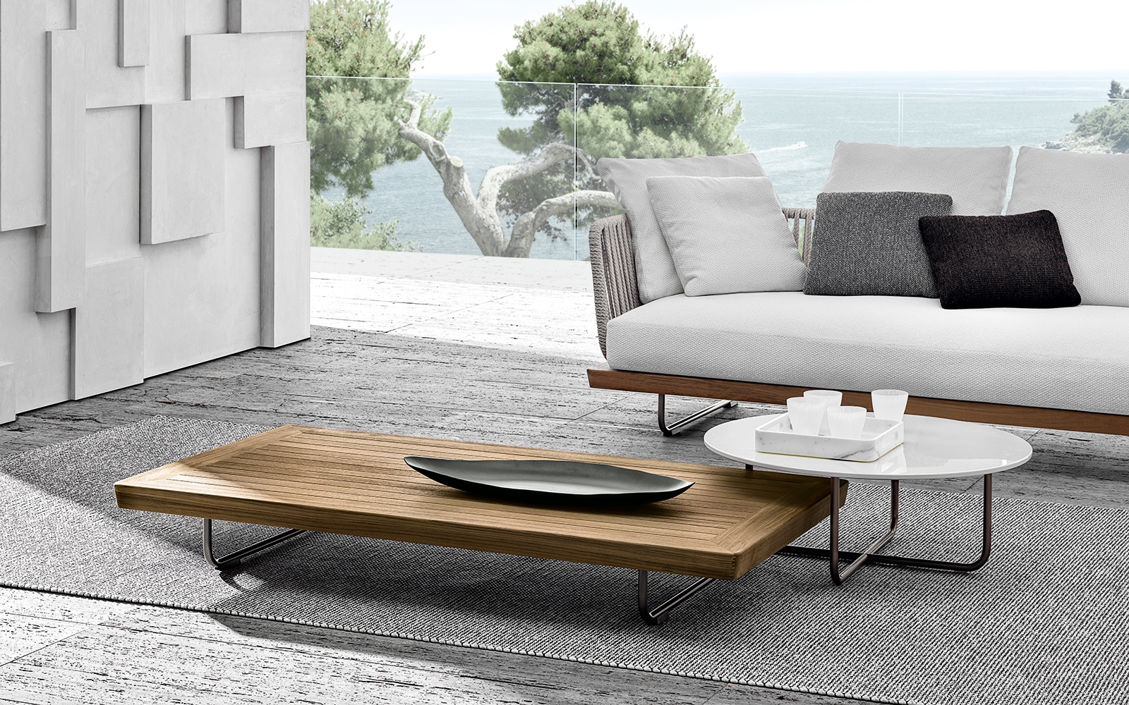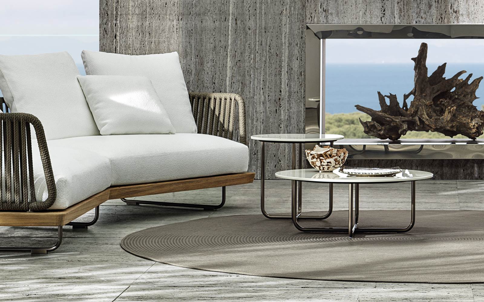 Лёгкие по форме и устойчивые по конструкции столики Sunray Meg были разработаны как часть уличной системы Sunray. Дизайн сочетает в себе графичность линий и долговечные отделки, включая вулканический камень, устойчивый к атмосферным воздействиям.