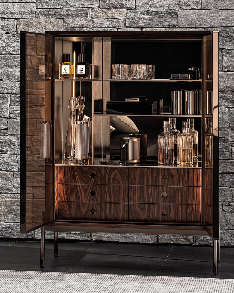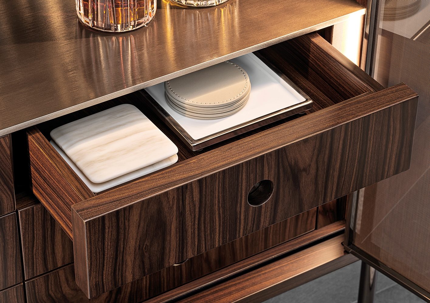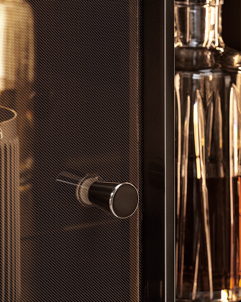 Витрина Superquadra — выразительное и утончённое хранилище, в котором функциональность сочетается с архитектурной строгостью. Его дизайн вдохновлён модернистскими формами и эстетикой одноимённого района в Бразилии. Сервант опирается на низкое металлическое основание с перекрещивающимися ножками и объединяет два закрытых модуля с распашными дверцами. Лицевая часть выполнена из слоистого стекла бронзового оттенка с интегрированной медной металлической сеткой, за которой скрывается внутренняя подсветка.