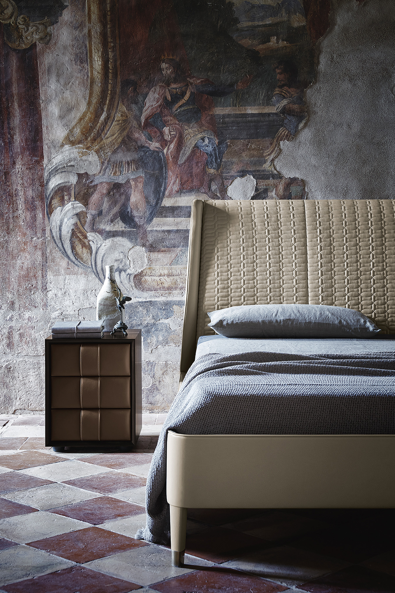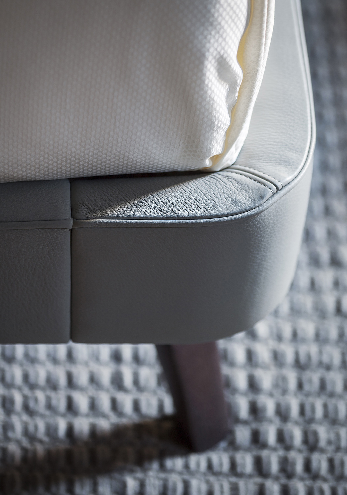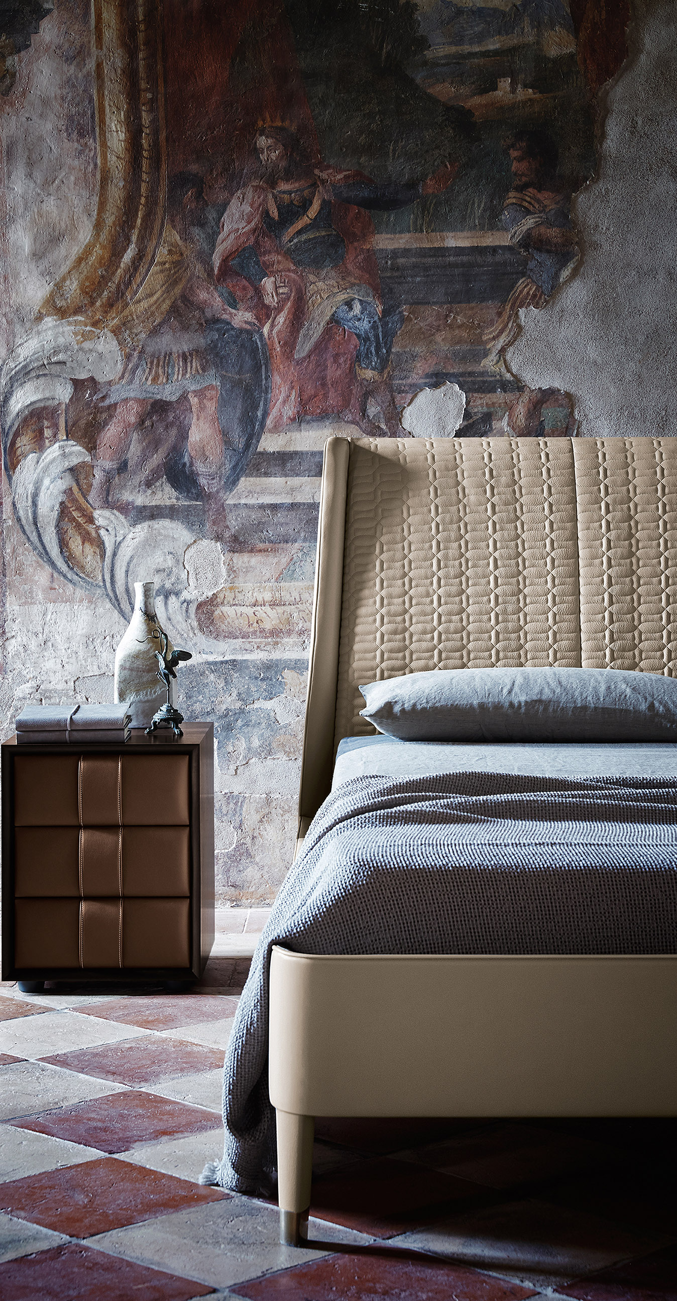 Изголовье кровати Suzie Wong изготовлено из массива бука и березовой фанеры с наполнителем из пенополиуретана. Доступны три варианта отделки: Suzie Wong с гладким изголовьем, Suzie Wong Extra с гладким изголовьем, украшенным парой цилиндрических пуговиц, обтянутых кожей в тон, и Suzie Wong De Luxe с изголовьем, украшенным вышивкой с геометрическим узором. Две формованные боковые части изготовлены из формованного пенополиуретана. Боковины из тюльпанового дерева с лёгкой подкладкой из пенополиуретана. Изножье изготовлено из фанеры из тополя, два угла из формованного пенополиуретана. Обивка выполнена из кожи Pelle Frau®. Помимо конических ножек, обтянутых кожей, предлагается также вариант из массива ясеня с морилкой цвета мокко или венге. Изножье также доступно в двух вариантах: высоком и низком, на одном уровне с каркасом кровати, образуя с ним бесшовную поверхность.