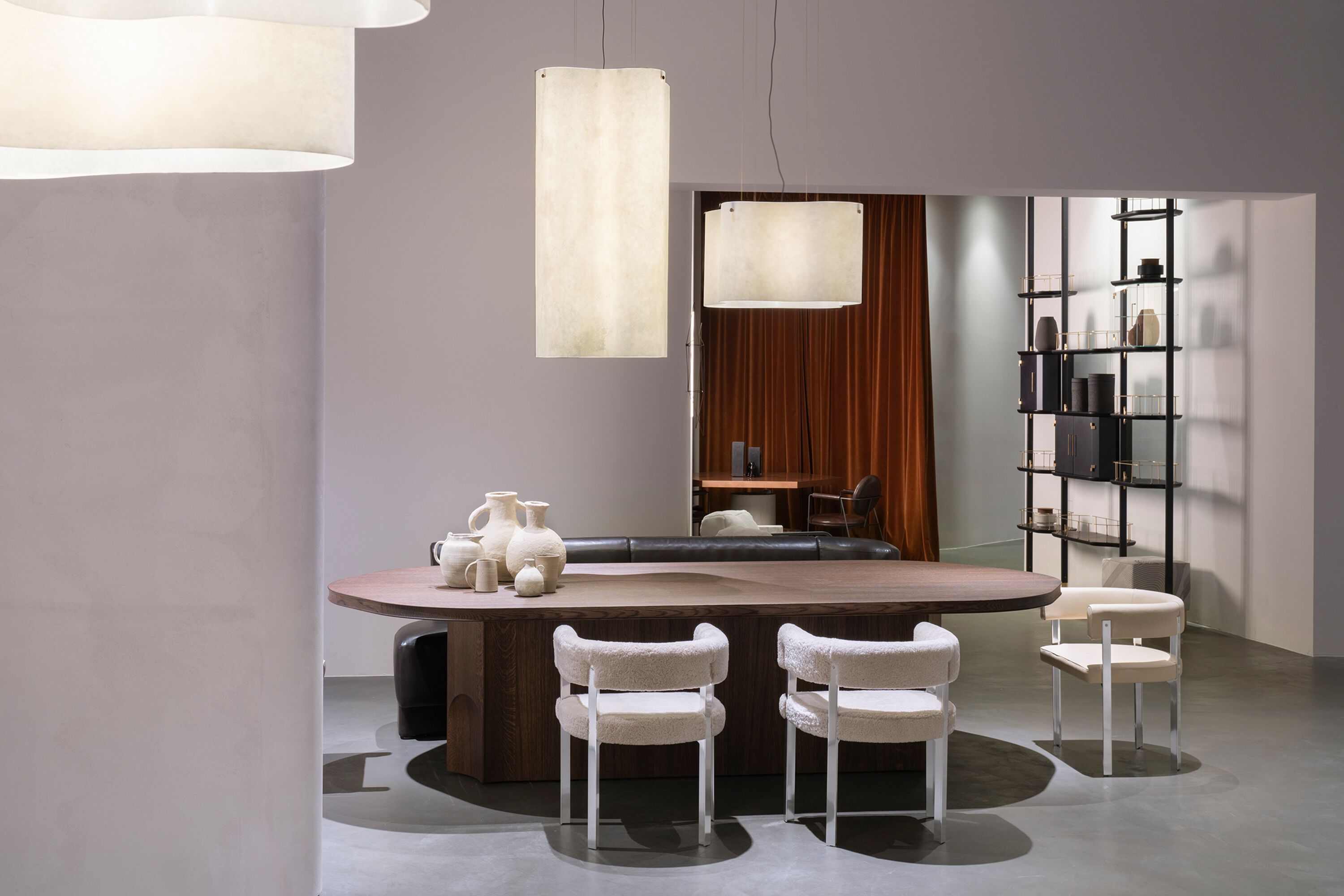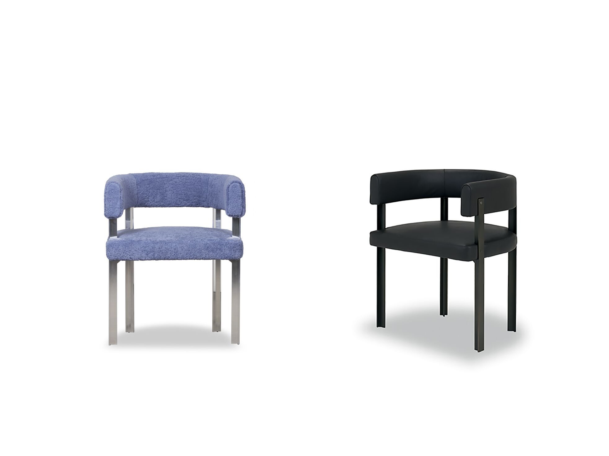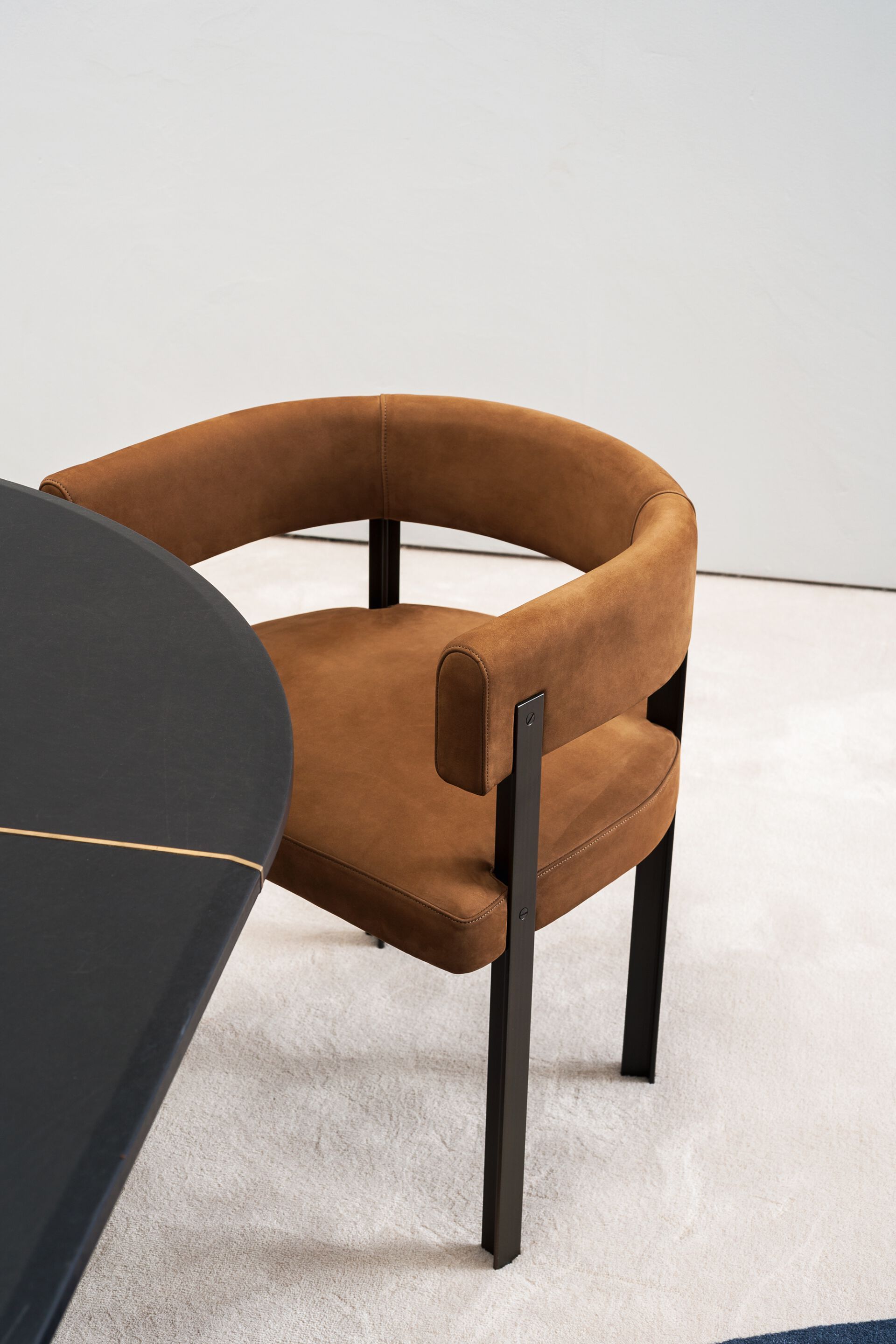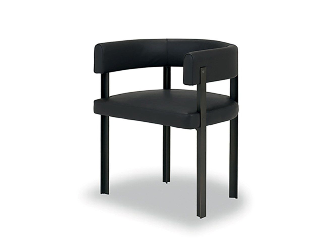 Кожаный стул T-Chair от Federico Peri. Структура в форме буквы "Т", выполненная из гравированного металла с матовой отделкой. Спинка и сиденье — из фанеры с наполнением разной плотности и акриловым покрытием.