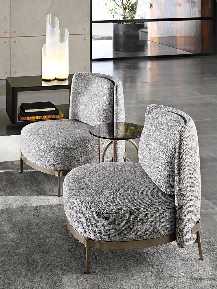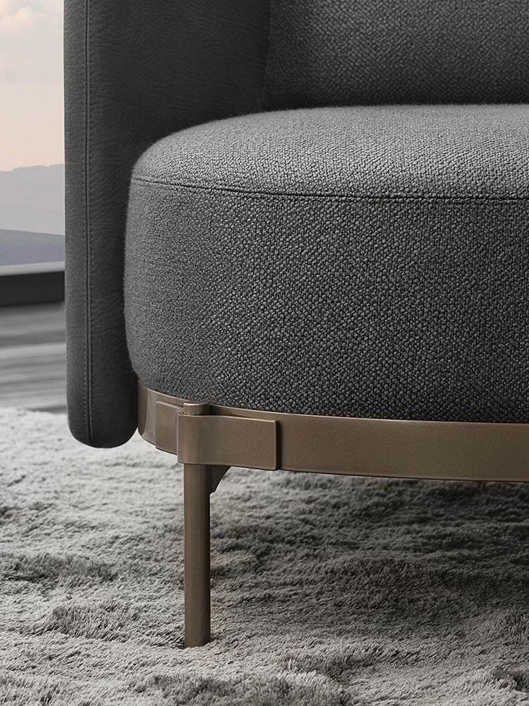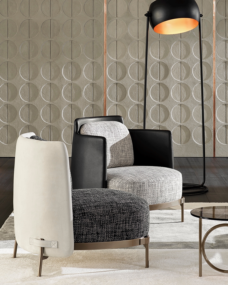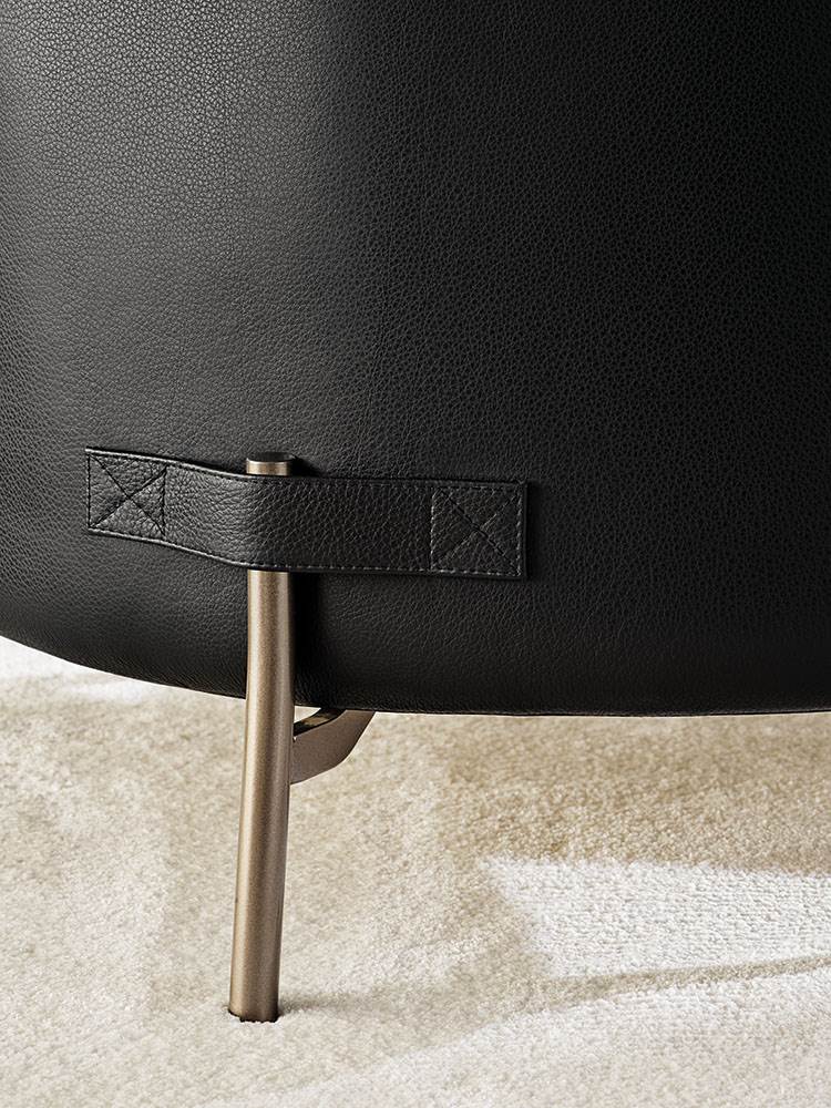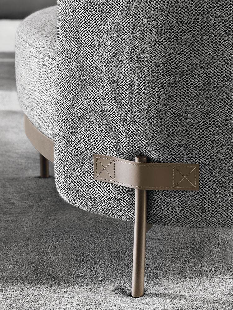Материалы: каркас — металл с полиуретановым наполнением; обивка — ткань или кожа из коллекции Minotti; основание — металлические ножки с отделкой Black-Nickel или бронза Satin Finish; декоративный элемент — ремешки из кожи