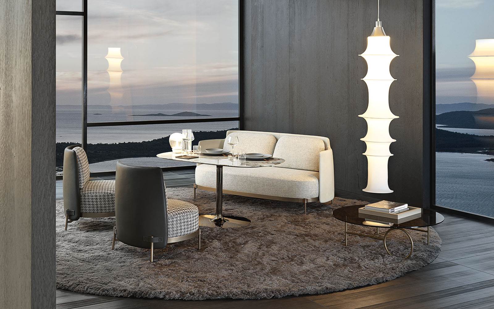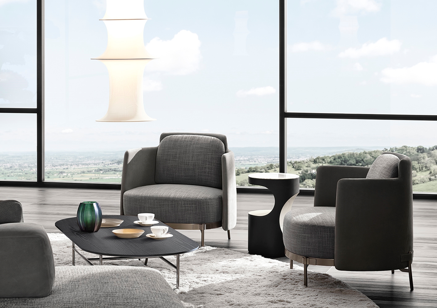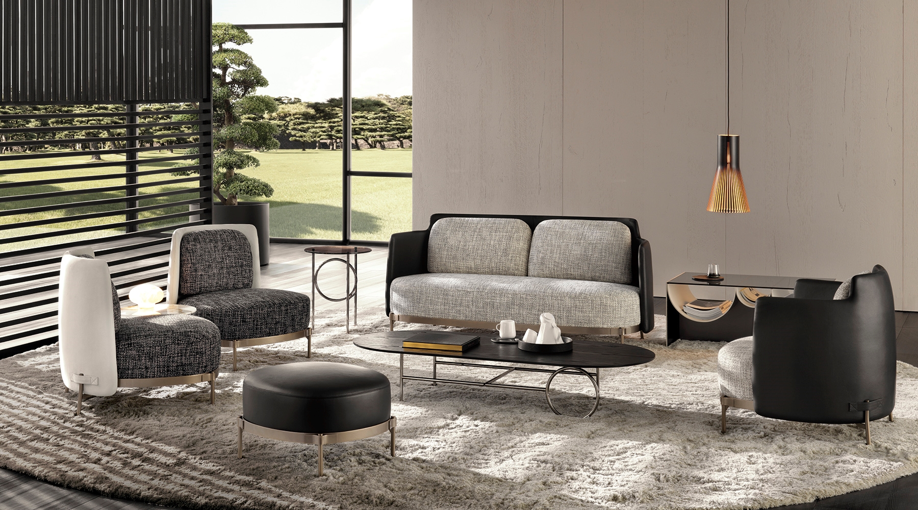 Материалы: каркас — металл с полиуретановым наполнением; обивка — ткань или кожа из коллекции Minotti; основание — металлические ножки с отделкой Black-Nickel или бронза Satin Finish; декоративный элемент — ремешки из кожи